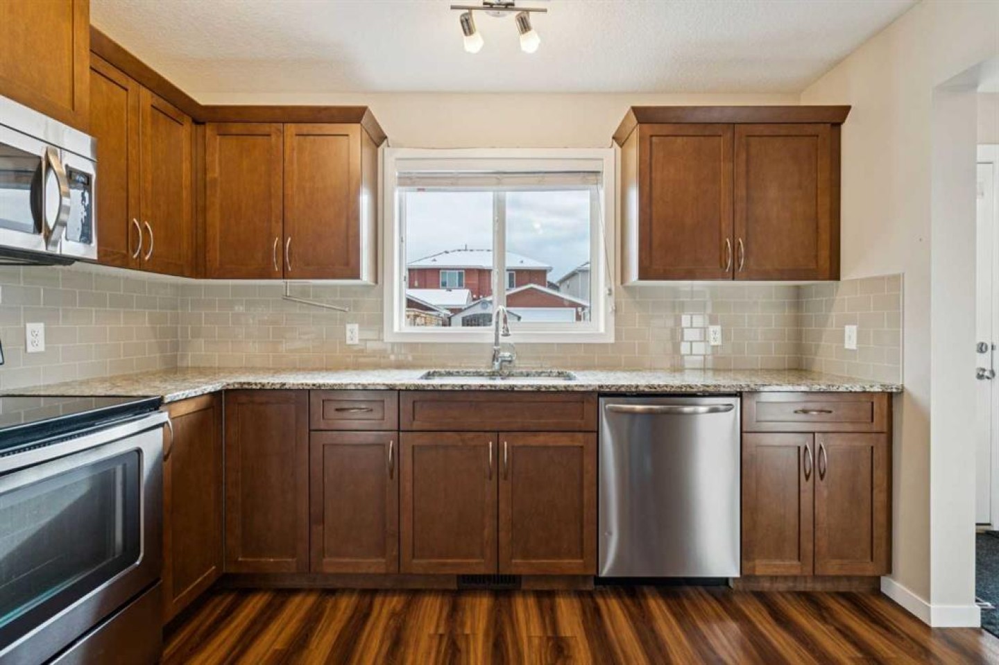 Step inside to a sun-filled living room highlighted by a transom window that floods the space with natural light. The main level offers durable laminate flooring, a convenient mudroom, and laundry on the main floor for everyday ease. The kitchen is finished with GRANITE COUNTERTOPS and comes complete with fridge, stove, microwave, and a newer dishwasher (2024).