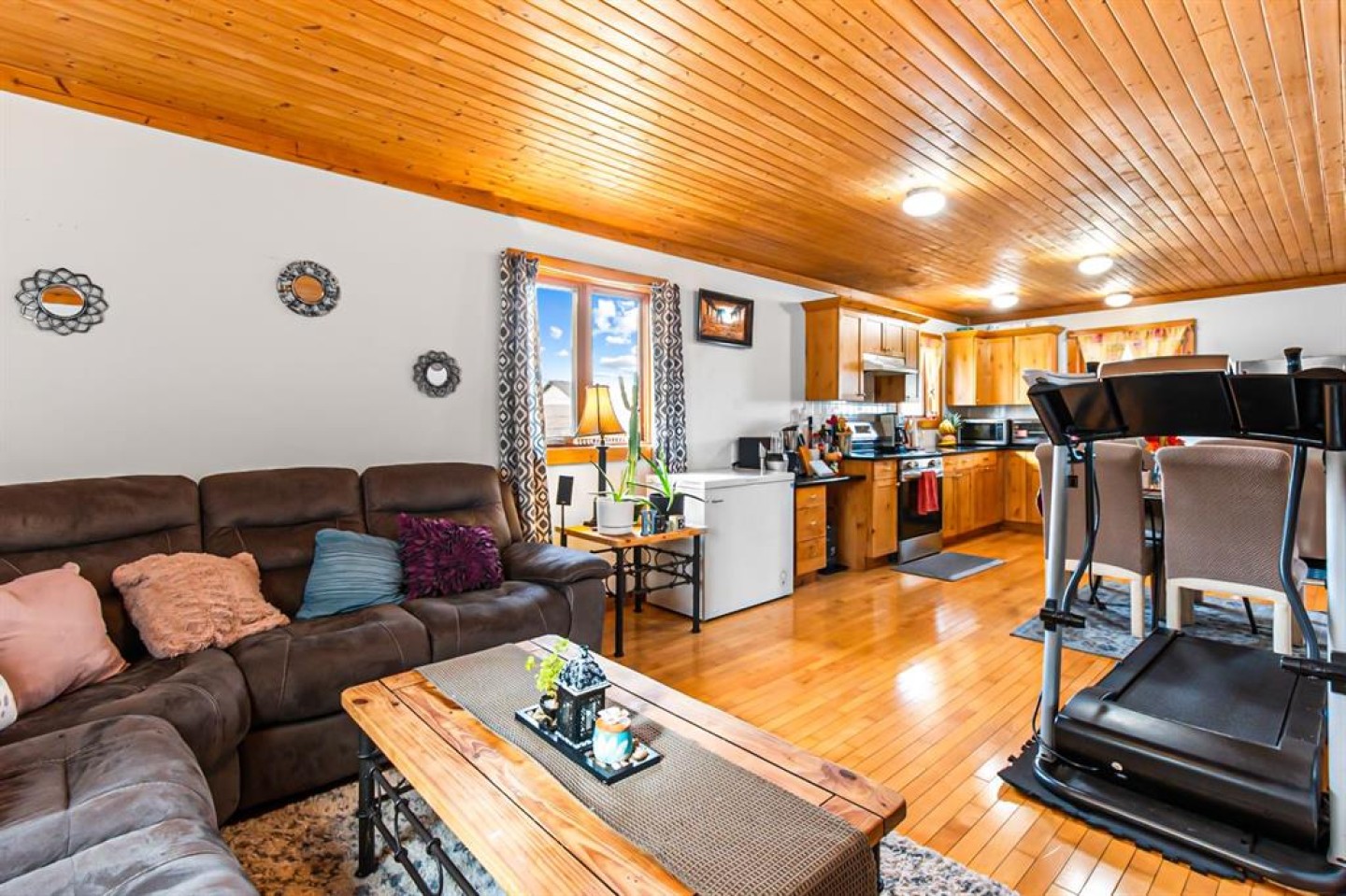 Situated on a peaceful street just steps from Didsbury’s amenities, this 2 bedroom, 2 full bathroom home is the perfect blend of comfort, modern day character, and small-town charm. Its 808 sqft footprint is thoughtfully laid out to make the most of every inch ! It’s Ideal for first-time buyers, downsizers, or anyone looking to slow down and enjoy a simpler way of life. Warm HARDWOOD FLOORS set the tone the moment you walk through the door, pairing beautifully with the natural wood kitchen cabinetry and the unique wood slat ceiling overhead. The kitchen features stainless steel appliances, while the OPEN LAYOUT allows light to flow easily through the main living space .. creating a welcoming atmosphere that feels instantly like home.