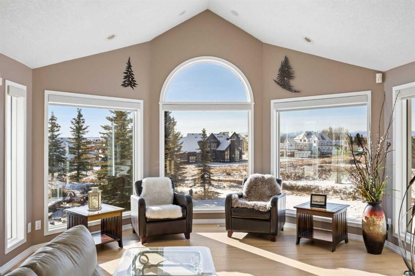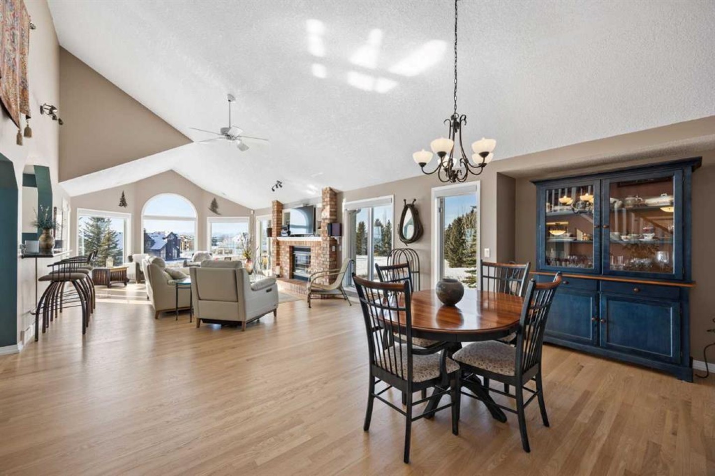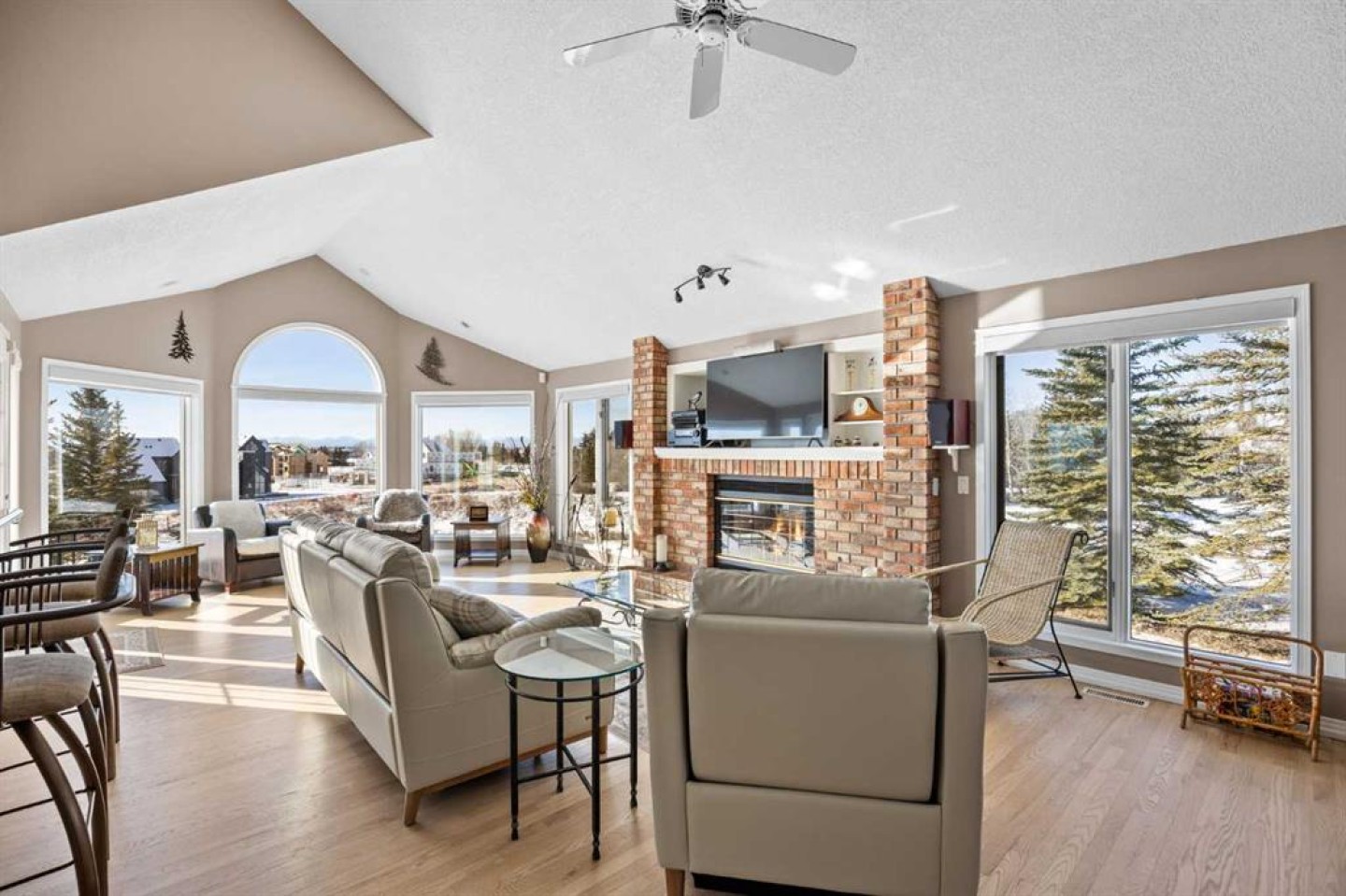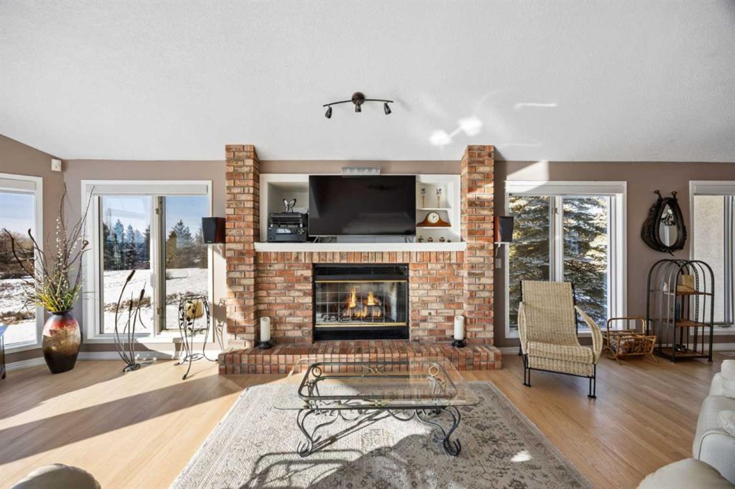 Large windows throughout the main floor flood the home with exceptional natural light and frame expansive views of the Rocky Mountains, downtown Calgary, and Winsport ski hill. At the heart of the main level, a beautifully detailed brick gas fireplace creates a natural gathering point that anchors the living spaces. Framed in timeless brick, it brings warmth, character, and a sense of permanence—perfect for cozy evenings, family gatherings, and long winter nights. High ceilings in the open great room further enhance the sense of space and light.