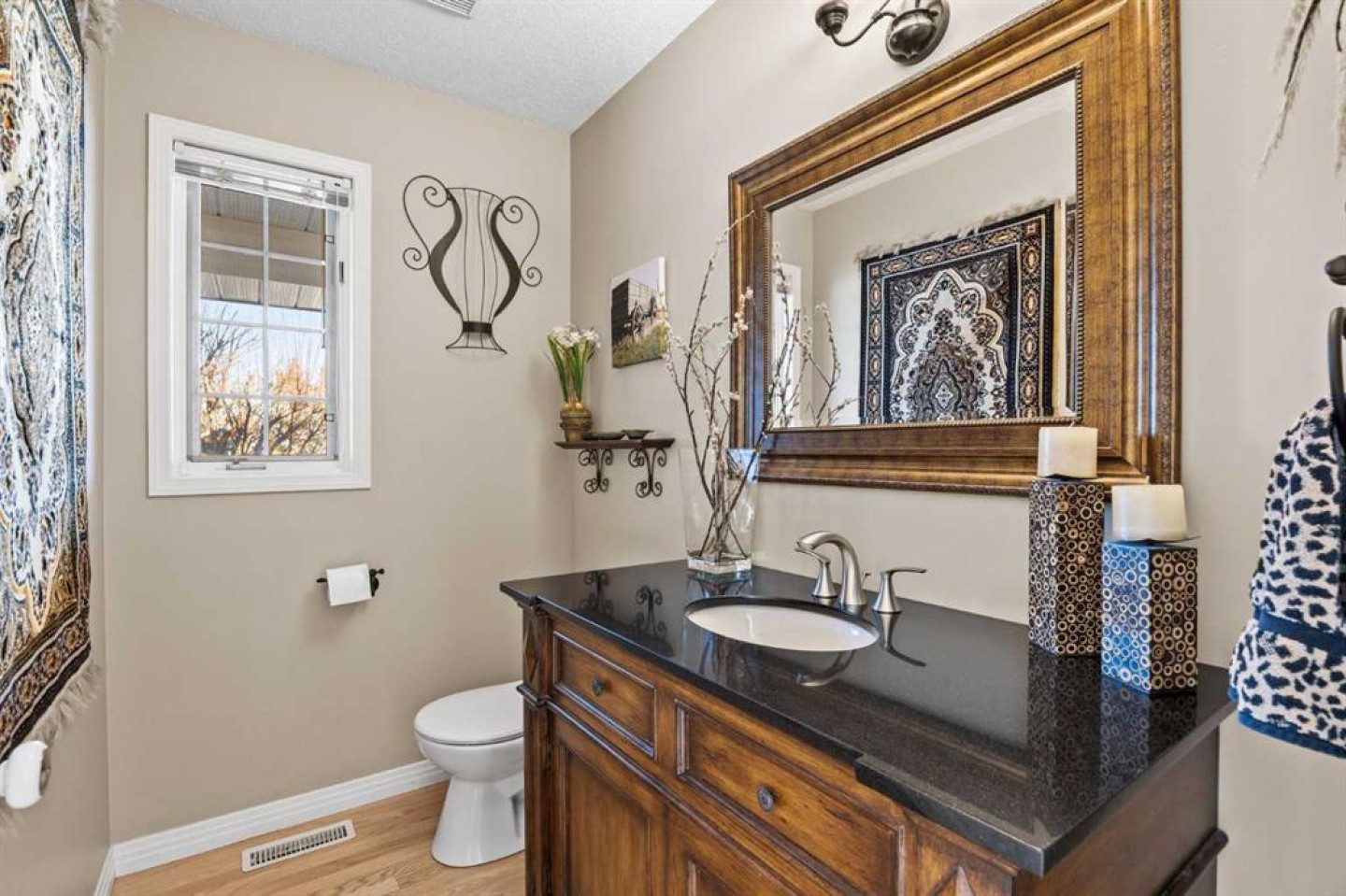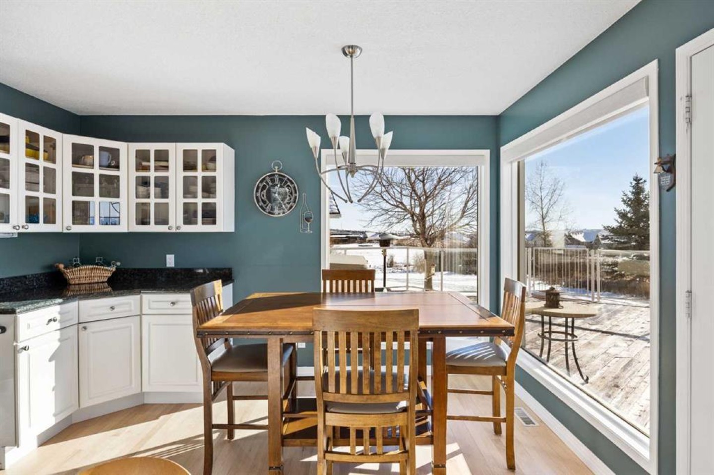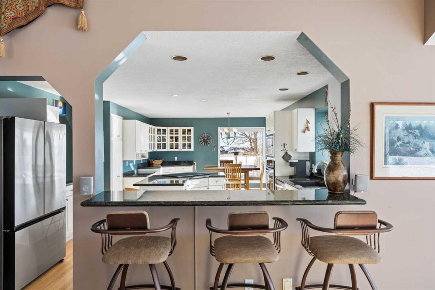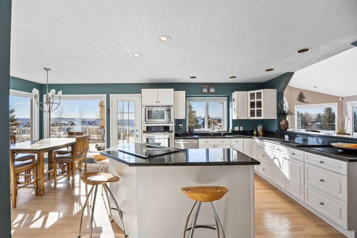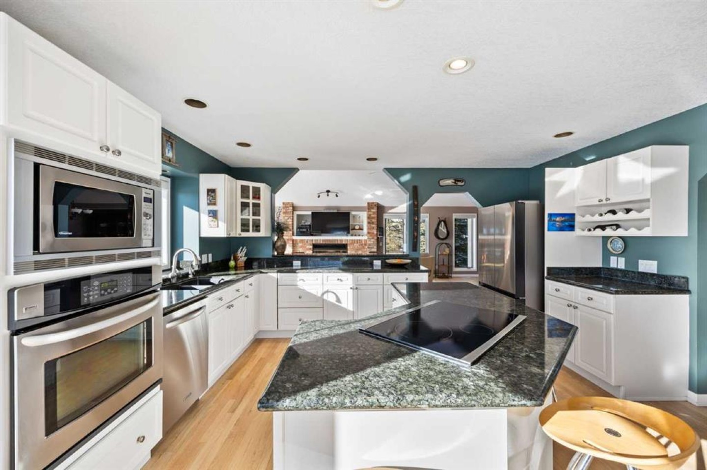 Hardwood flooring runs throughout the majority of the main floor and was redone in 2023 in a natural oak tone, adding warmth and a timeless feel. The kitchen is both functional and inviting, featuring solid granite countertops and island, a new refrigerator, upgraded stainless steel appliances including an induction cooktop, and a reverse osmosis drinking water system. The layout flows seamlessly to the dining area and out to the deck, making indoor-outdoor living effortless.