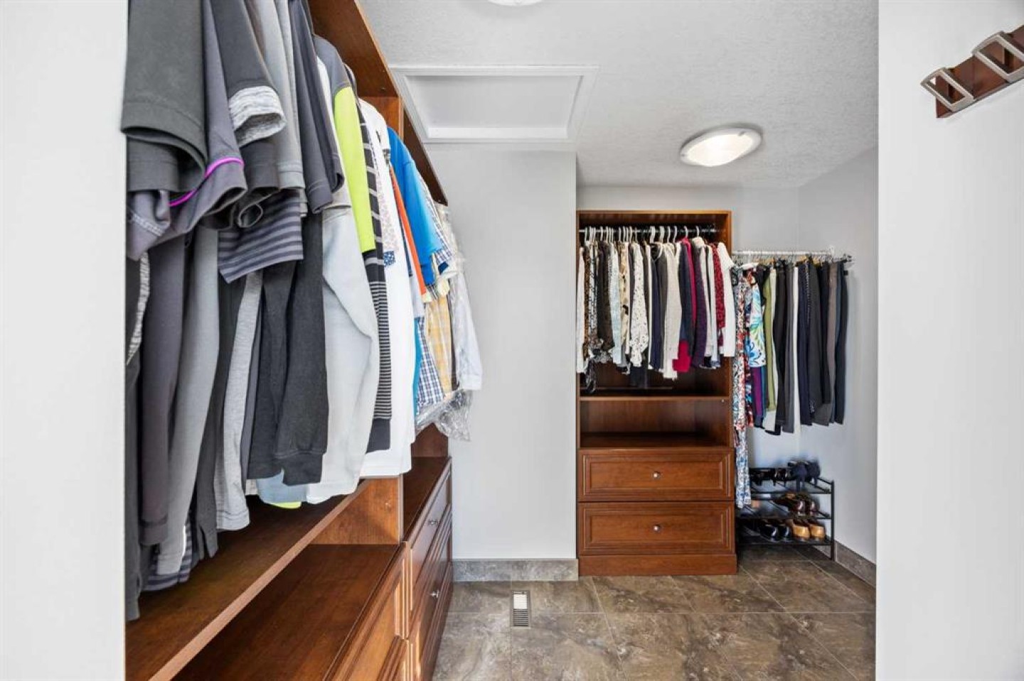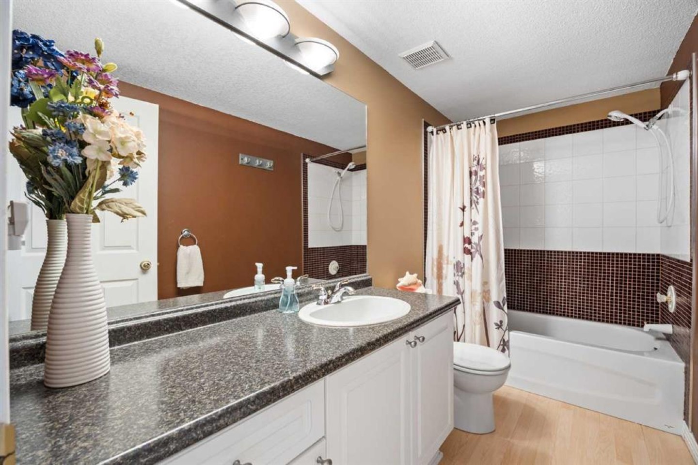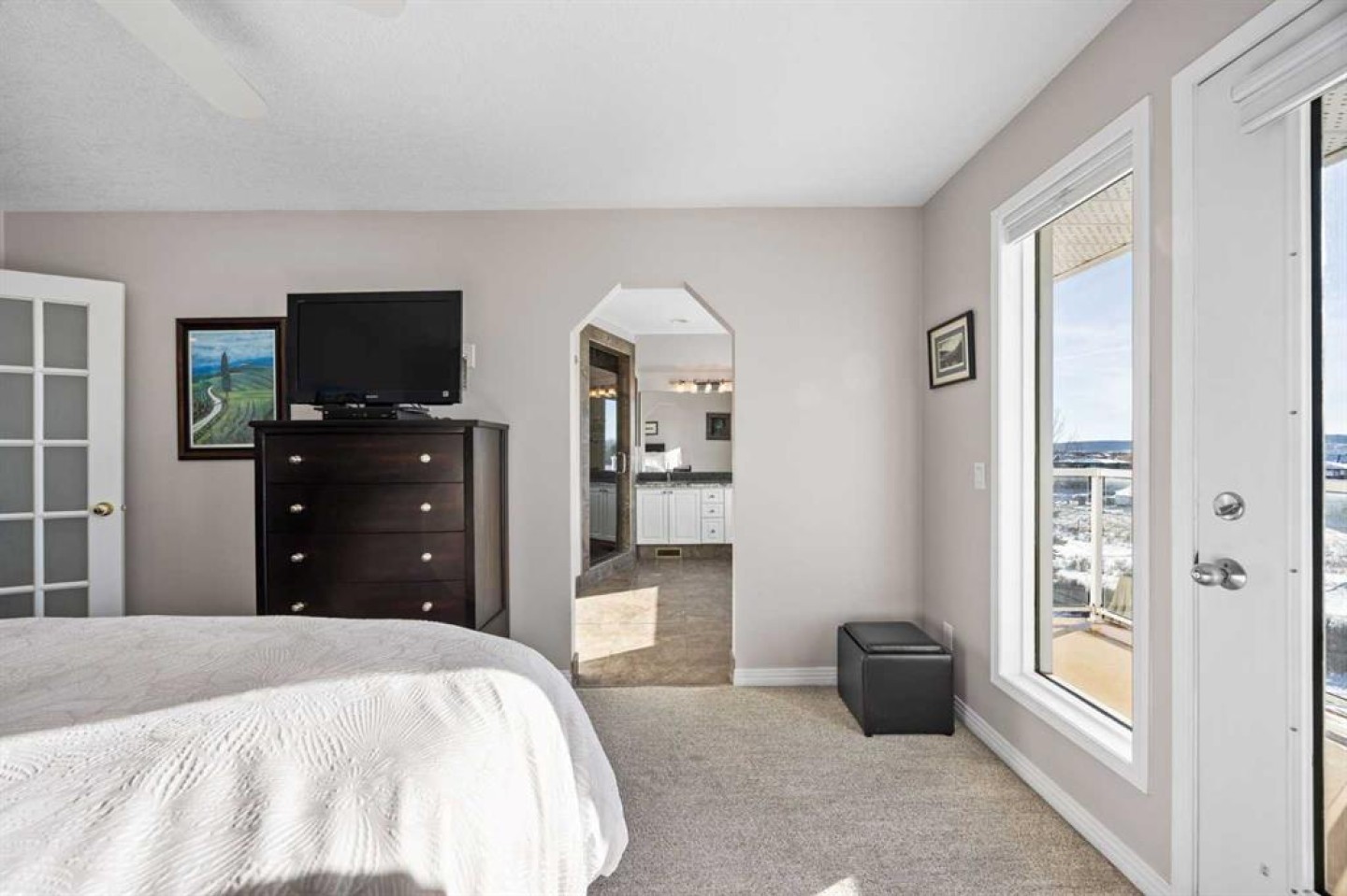 The primary suite has been thoughtfully renovated into a true retreat, offering unobstructed mountain views, a large walk-in closet, and a spa-inspired ensuite with heated tile flooring, a large walk-in shower, and a rain shower feature—a perfect place to unwind at the end of the day.