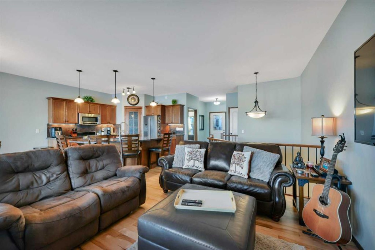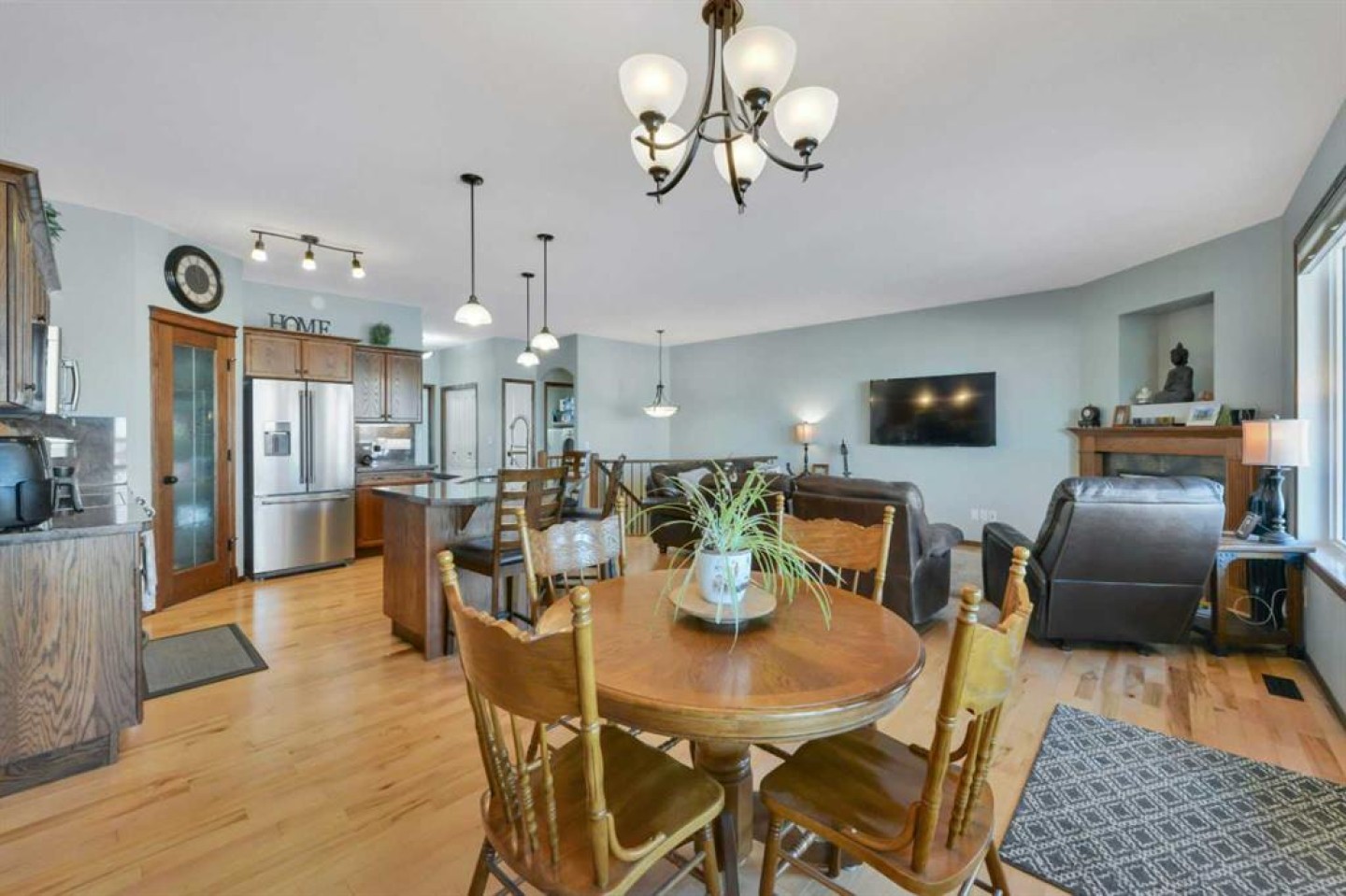 Backing onto a GREEN SPACE, this open concept bungalow is fully finished with FIVE bedrooms and a heated TRIPLE ATTACHED GARAGE!! The open concept main level is bright and inviting, there are hardwood floors throughout the main level, a large bank of windows allow natural light to fill the space, and there is a cozy gas fireplace in the living room. The kitchen includes a large center island, granite counter tops, a corner pantry and stainless appliances. The dining area is nicely connected to the kitchen and living room and offers ample room for family gatherings. There is a front bedroom/office and 2 additional bedrooms on the main level including the large main bedroom with it's own ensuite! Main floor laundry and a full bath complete the top level and once downstairs the fully finished basement comes with infloor heat, 2 large bedrooms, and big rec room and separate flex room - perfect for a craft room, media room, or home gym!! The rear yard is fully fenced and landscaped with a beautiful deck and the hot tub stays!! The large front driveway offers plenty of room to park your RV, there are underground sprinklers, floor drains in the garage and 8' garage doors.