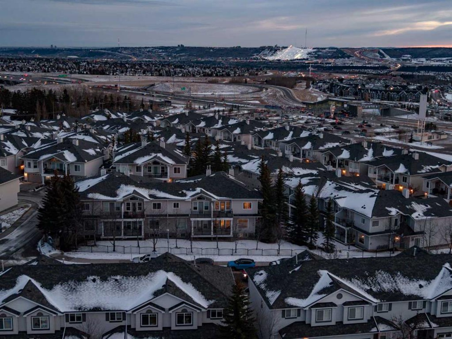 Welcome to this beautifully updated end-unit townhome in the highly sought-after Brownstones of Rocky Ridge, where spacious living, thoughtful upgrades, and stunning mountain views come together in one exceptional property. Offering over 2,200 developed sq ft with 4 bedrooms and 3.5 bathrooms, this move-in ready home features fresh paint throughout along with upgraded flooring, lighting, countertops, backsplash, and brand new stainless steel appliances. The grand foyer welcomes you into a versatile den/home office/flex space with adjacent powder room, ideal for today’s work-from-home lifestyle. The open-concept main level is perfect for entertaining, with a generous living area centered around a cozy fireplace and access to a spacious deck and BBQ area. The stylish kitchen offers abundant cabinetry, loads of counter space, walk-in pantry, massive breakfast bar, and dining area that comfortably seats a large family. Upstairs, the primary retreat impresses with vaulted ceilings, private balcony, mountain and sunset views, spa-like ensuite, and walk-in closet, along with two additional bedrooms and a full 4-piece bath. A convenient upper-floor laundry hookup remains in place if desired, though the space has been thoughtfully converted into a bright home office, with laundry currently located in the basement. The fully developed lower level provides additional living space with a family/rec room, fourth bedroom, full bath, cold room, 9’ ceilings, large windows, dedicated laundry room, and plenty of storage. Enjoy low-maintenance living, amazing neighbours, and a prime location just minutes from transit, LRT, recreation facilities, and all amenities. Spacious, turnkey, and beautifully maintained, this property offers outstanding value in one of NW Calgary’s most desirable communities.
