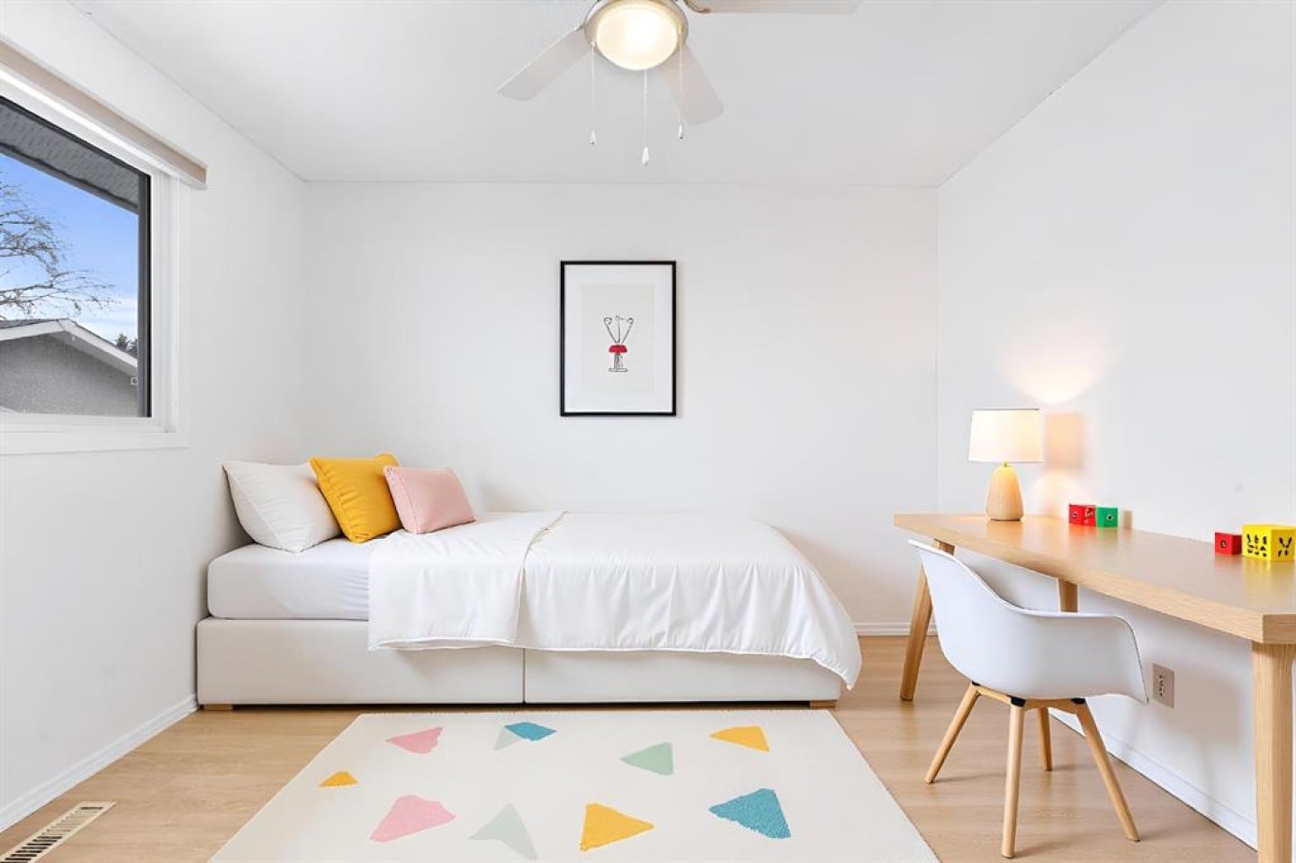 The basement includes a separate entrance and offers excellent potential for a future secondary suite, with space to add a kitchen and bathroom, a large 36 ft recreation room, and a third bedroom. Outside, enjoy a covered patio, oversized shed, two covered parking stalls, and a fully fenced backyard with green space suitable for RV, trailer, or boat parking.