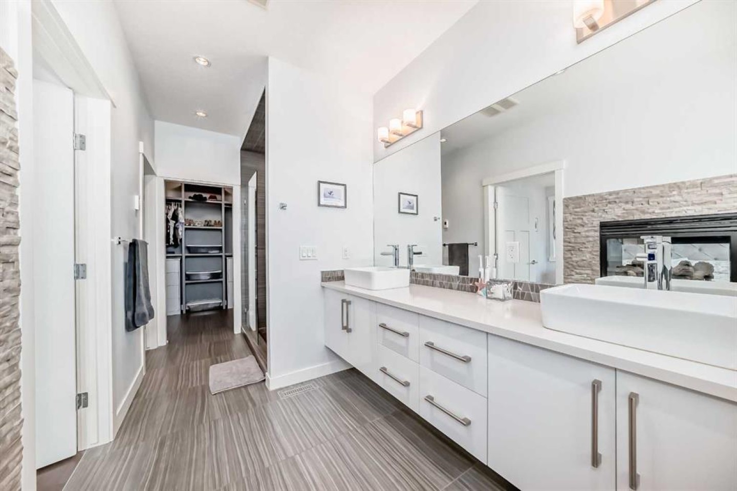 Upstairs, unwind in the luxurious primary retreat featuring a cozy two-way fireplace and spa-inspired ensuite with dual sinks, a deep soaker tub, fully tiled walk-in shower, in-floor heating and an oversized walk-in closet. Two additional bedrooms with large windows, a full 4-piece bathroom, and convenient upper-level laundry complete the second floor.