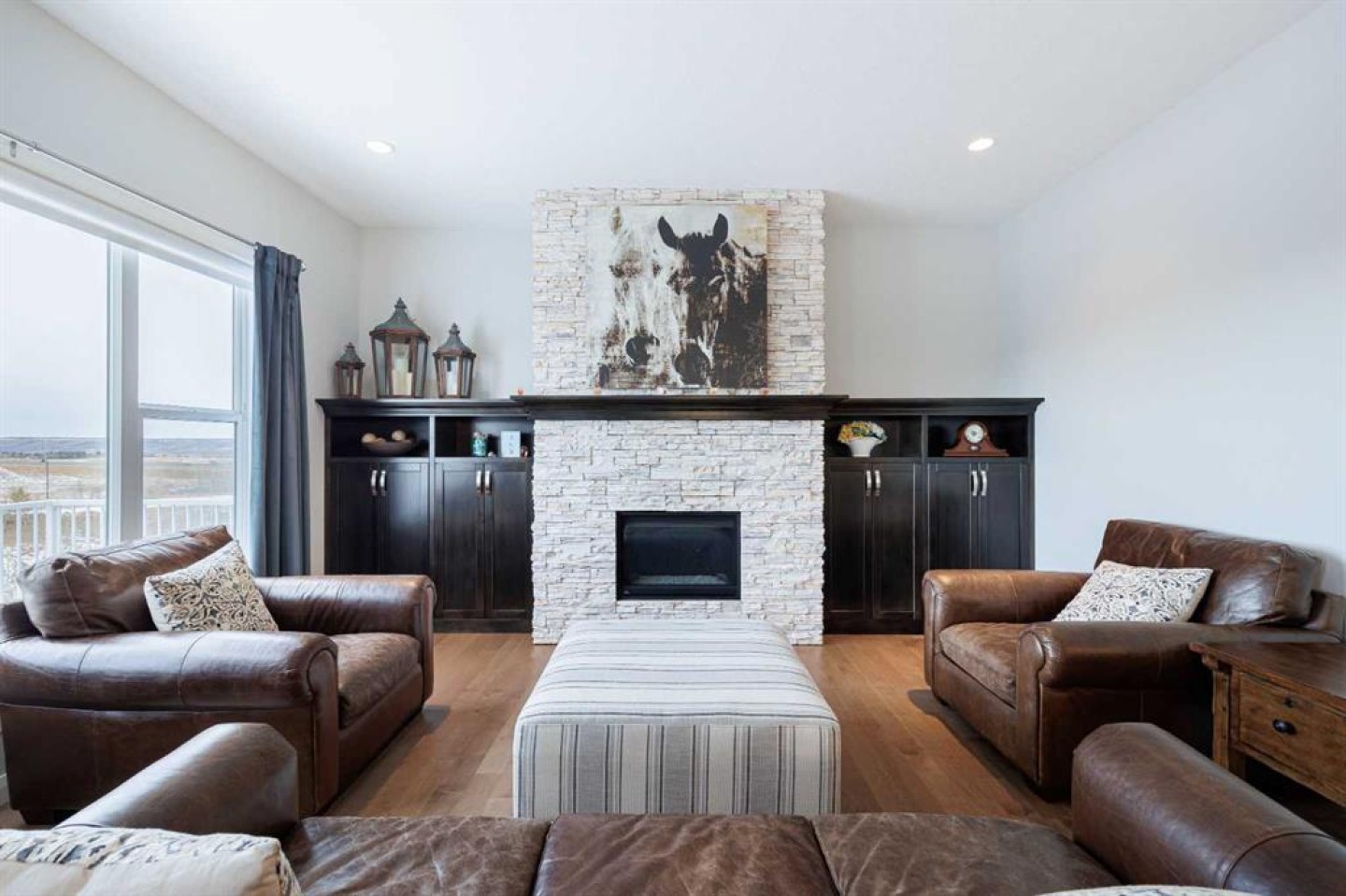 Welcome to this beautifully designed family home that blends thoughtful layout, upscale finishes, and an exceptional outdoor setting backing directly onto a walking path and green space. From the moment you step inside, the open-to-below front entrance creates a striking first impression, filling the space with natural light and a sense of grandeur. Hardwood flooring flows throughout the main level leading to the heart of the home - the stunning kitchen, crafted for both everyday living and entertaining. It features stainless steel appliances, a gas stove, beverage fridge, and a large central island with eating bar, ideal for casual meals or gathering with guests. Ceiling-height cabinetry offers generous storage while maintaining a clean, modern look, and quartz countertops add both style and durability. A spacious walkthrough pantry connects seamlessly to the kitchen, enhancing functionality. Open sightlines to the living room and eating nook create a bright and connected main living area. The eating nook opens directly onto a spacious back deck, extending your living space outdoors and offering peaceful views of the fully fenced backyard and the green space beyond. The living room is warm and inviting, anchored by a stone fireplace with a wooden mantel and custom built-in shelving that adds character and storage. This space is designed for comfort while maintaining a refined aesthetic. This space is complemented by a dedicated office or schoolroom space—perfect for working from home or creating a quiet study area for the family. A 2pc powder and great mudroom space completes this main level. Upstairs, the home continues to impress with three generously sized bedrooms and a large bonus room complete with ceiling fan—an ideal space for family movie nights or a kids’ retreat. The primary suite is a true sanctuary, featuring a spacious layout with dual walk-in closets and a luxurious ensuite. Enjoy the comfort of in-floor heating, a double vanity, jetted soaking tub, standalone shower, and private water closet for a spa-like experience at home. A well-appointed 5-piece main bathroom with counter-height dual vanity serves the additional bedrooms. Convenient upper-level laundry includes a sink and cabinetry for added organization and ease. The fully developed basement offers outstanding additional living space with direct access to the backyard and lower patio. It features a stylish wet bar with drink fridge and sink, a cozy fireplace with stone surround and mantel, custom built-ins, and a large bedroom with oversized window overlooking the backyard. A dedicated gym area provides the perfect space for fitness or hobbies without leaving home. Additional features include a fully heated garage and air conditioning! Backing onto green space with pathway access, this home offers privacy, functionality, and beautiful surroundings—all while delivering high-end finishes and a thoughtful floor plan ideal for modern family living.