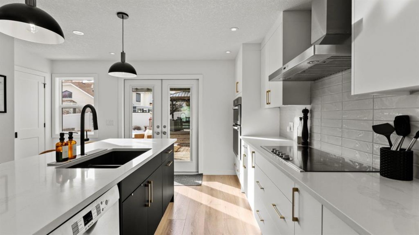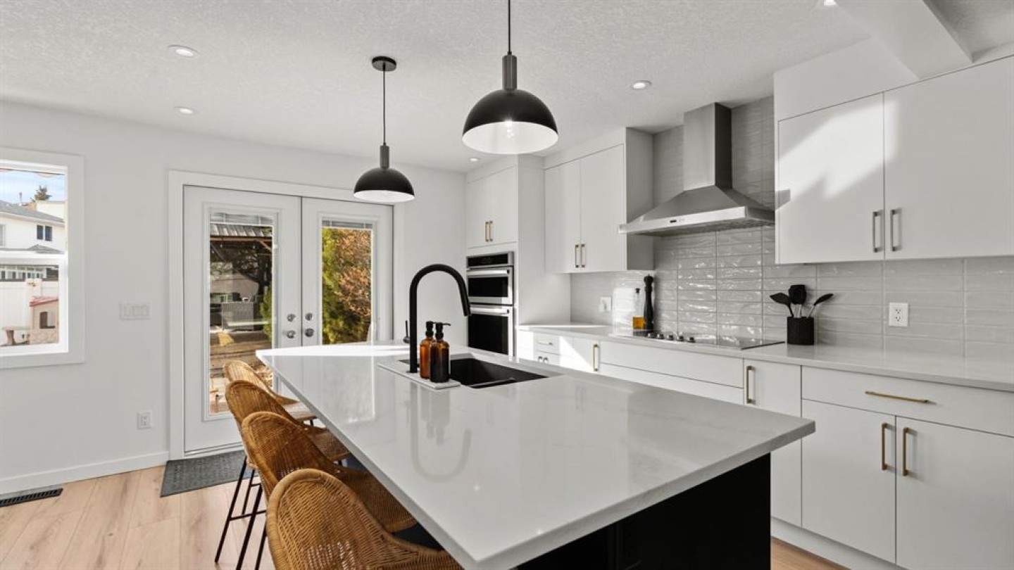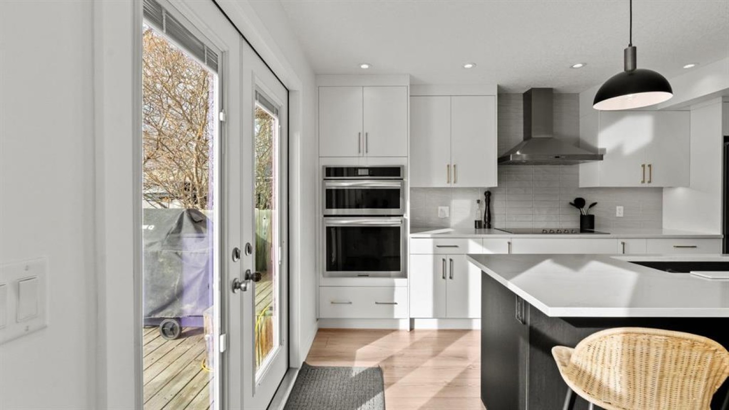 The main floor has been fully renovated and showcases a bright, modern open-concept layout ideal for both everyday living and entertaining. Wide-plank flooring, recessed lighting, and large windows create a warm and welcoming atmosphere throughout. The living room flows seamlessly into the stunning kitchen, where crisp white cabinetry, quartz countertops, contrasting dark accents, and a large centre island with seating take centre stage. High-end stainless steel appliances include a gas cooktop, built-in wall ovens, and a statement range hood, while stylish pendant lighting and a sleek tile backsplash complete the space. The adjacent dining area offers direct access to the west-facing backyard, perfect for enjoying afternoon sun and evening sunsets. A convenient powder room completes the main level.