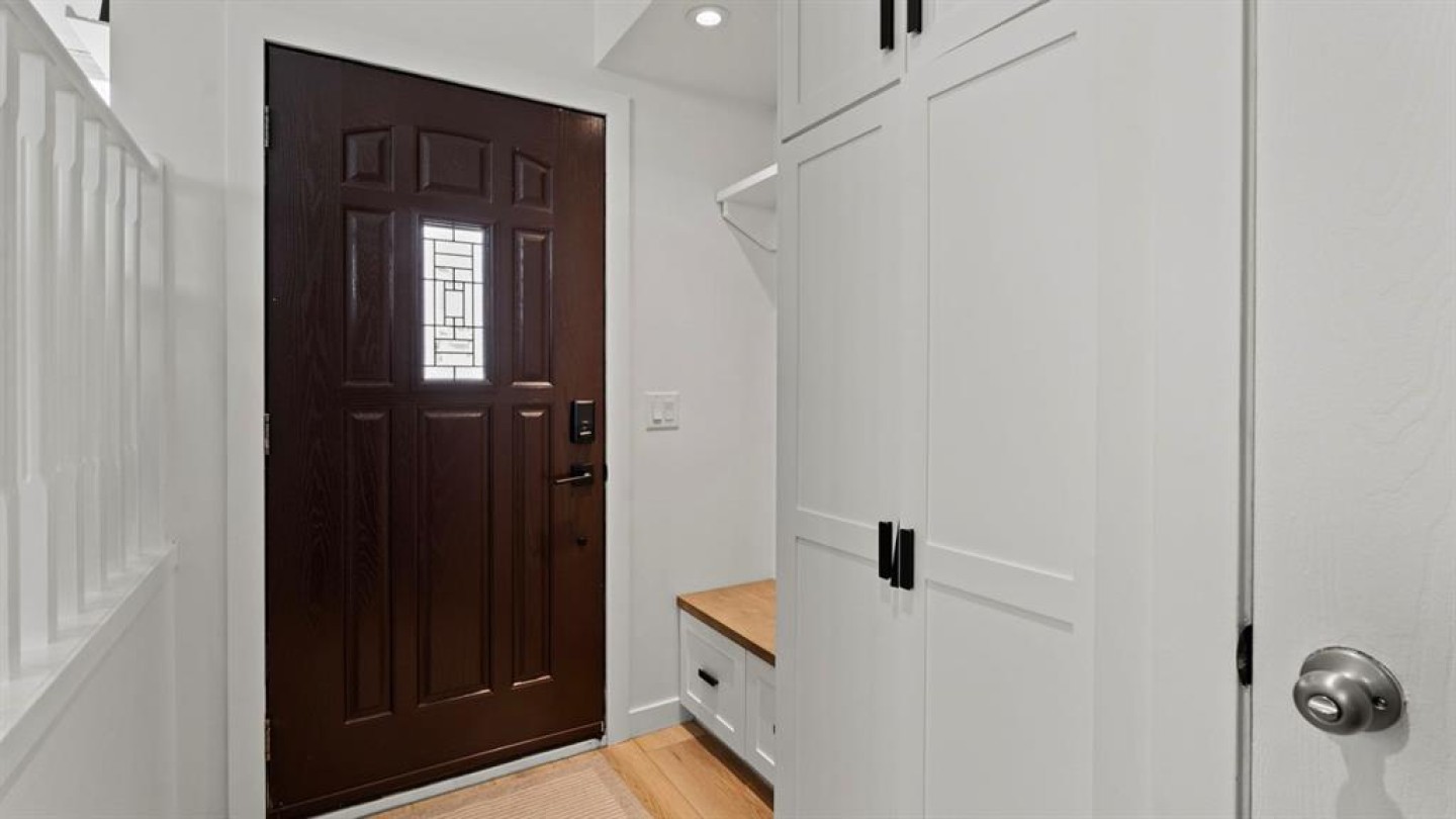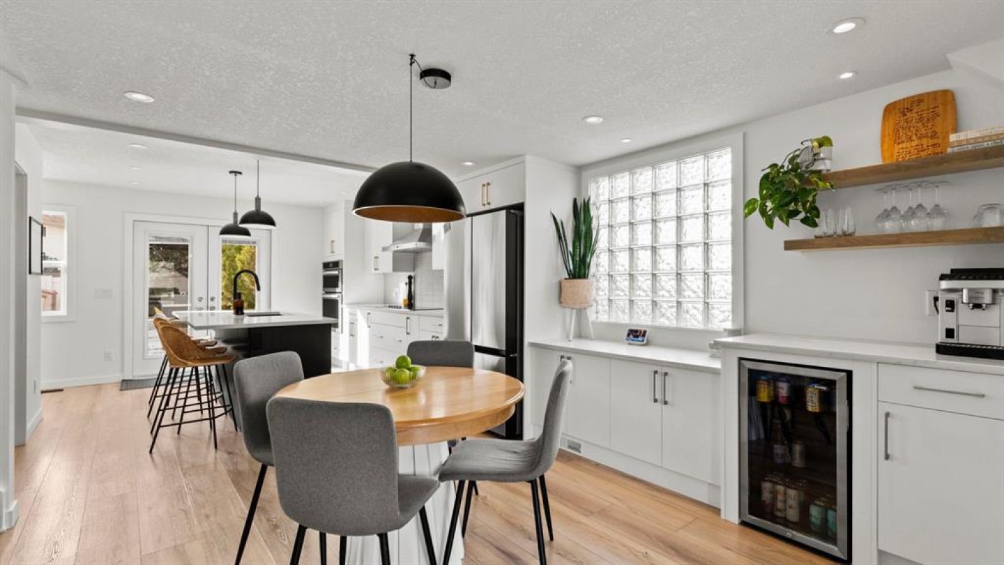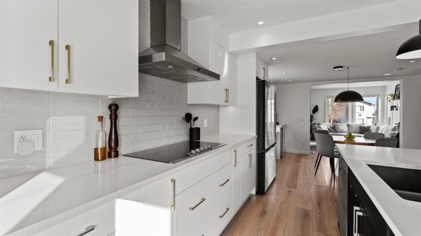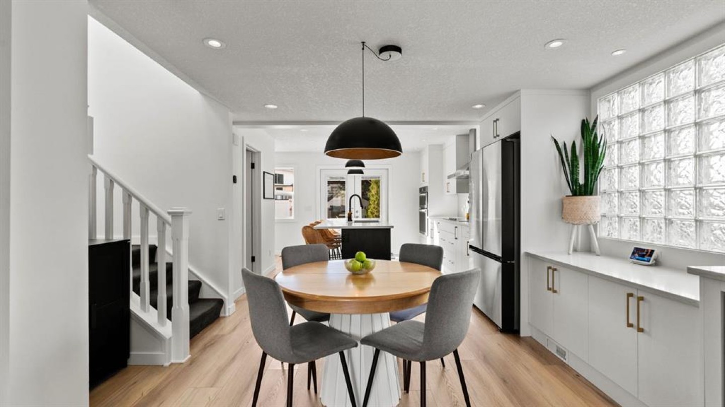 The main floor has been fully renovated and showcases a bright, modern open-concept layout ideal for both everyday living and entertaining. Wide-plank flooring, recessed lighting, and large windows create a warm and welcoming atmosphere throughout. The living room flows seamlessly into the stunning kitchen, where crisp white cabinetry, quartz countertops, contrasting dark accents, and a large centre island with seating take centre stage. High-end stainless steel appliances include a gas cooktop, built-in wall ovens, and a statement range hood, while stylish pendant lighting and a sleek tile backsplash complete the space. The adjacent dining area offers direct access to the west-facing backyard, perfect for enjoying afternoon sun and evening sunsets. A convenient powder room completes the main level.