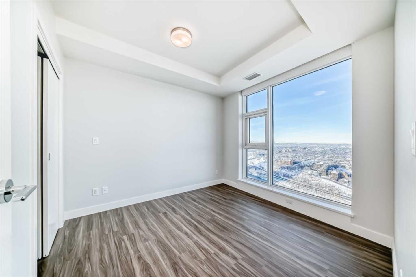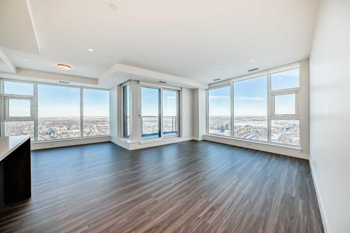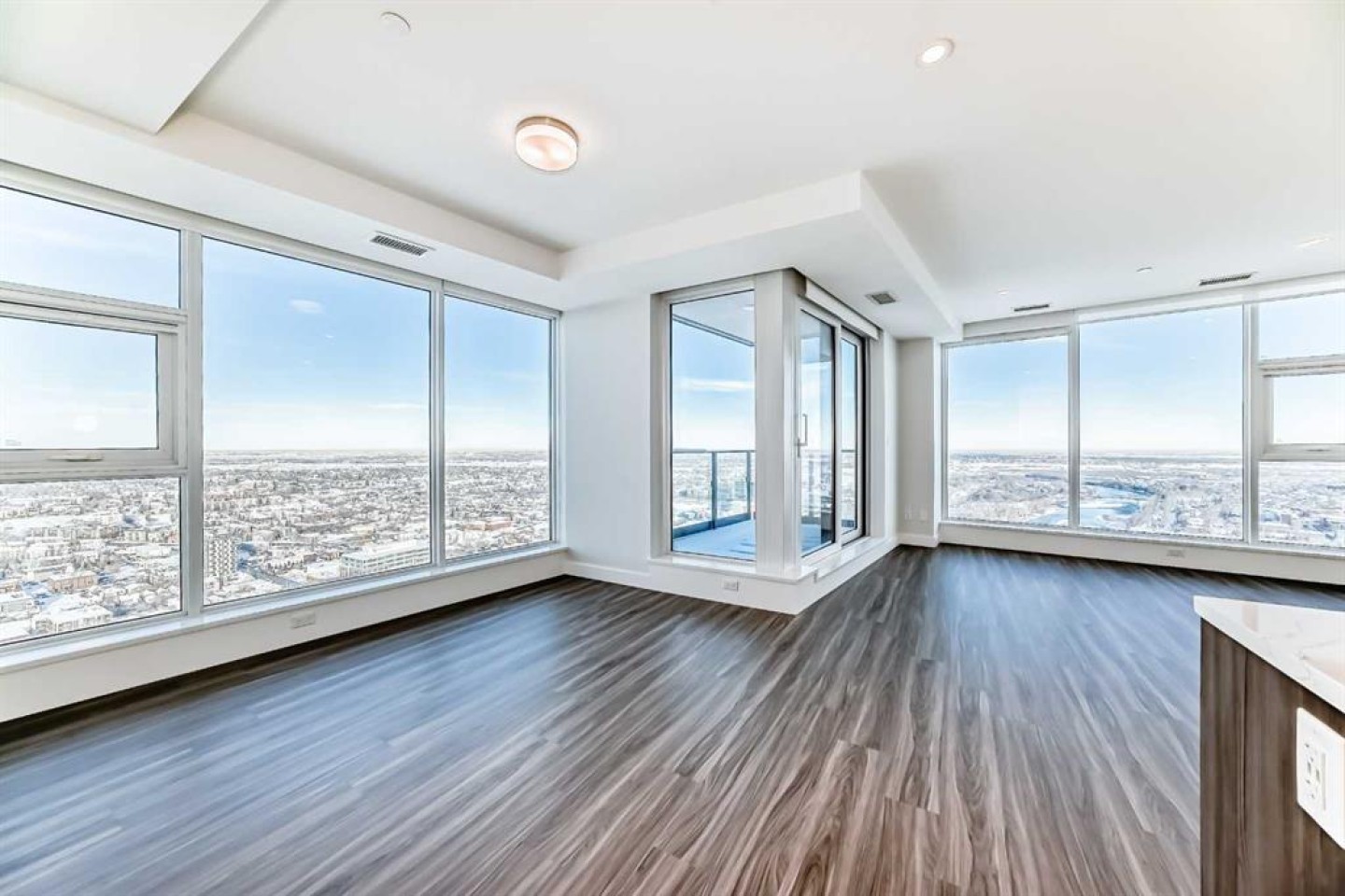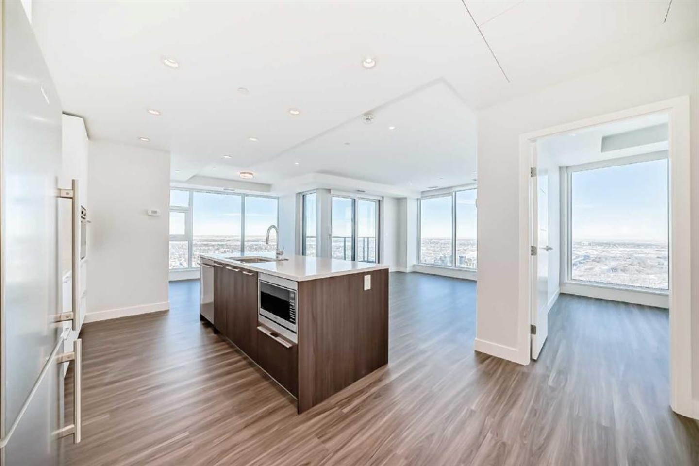 As you step through the entrance, a welcoming foyer ushers you in, providing easy access to your front closet and in-suite laundry. Moving into the expansive main living area, you're greeted by floor-to-ceiling windows that reveal a panoramic spectacle. The open-concept layout features large kitchen, dining, and living spaces, all adorned with premium finishes, including abundant pot lights and wide plank flooring.