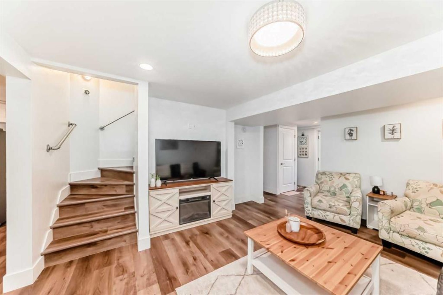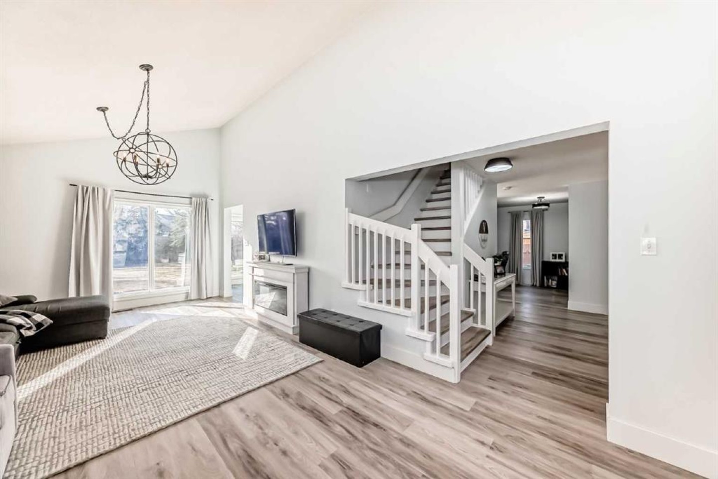 Fridge (x3), stove (x2), Dishwasher (x2), microwave (x2) washer, dryer, stackable washer/dryer, Electric fireplace in living room, 1 twin bed mattress, 1 double bed frame and mattress, 2 night stands, 1 three-drawer dresser, 1 queen bed frame and mattress, 1 32" Smart TV, 3 Bar stools, Assorted kitchen utensils, plates, pots, etc. 1 area rug, 1 coffee table, 1 leather couch, 2 end tables, 1 TV stand with fireplace, 1 55" TCL Smart TV, 1 Office desk and chair