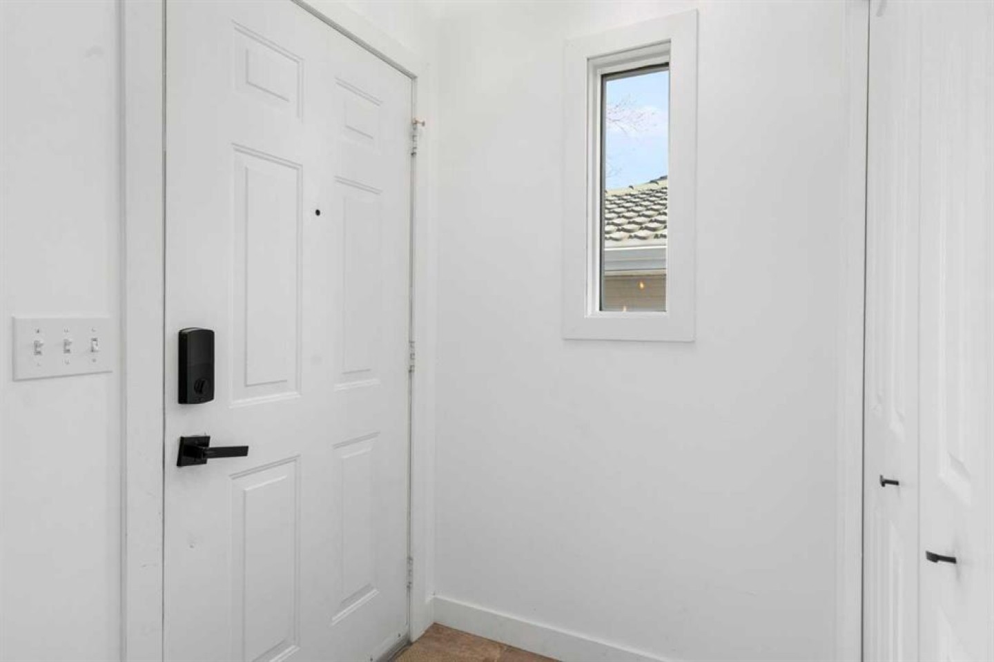 Doorbell Camera, Digital lock on front door, Floating shelves on wall beside upper stairs
