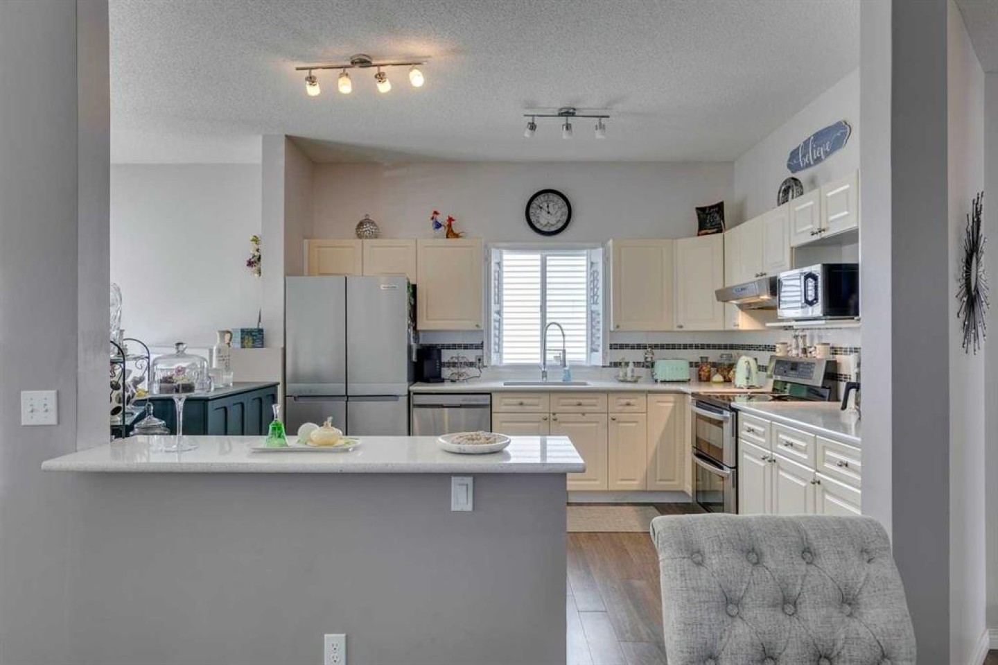 The bright and inviting main level features a spacious kitchen with abundant cabinet storage, elegant quartz countertops, and newer stainless steel appliances, seamlessly flowing into the dining and living areas. The upper level offers three generous bedrooms and a beautifully appointed 3-piece bathroom highlighted by a large, modern shower.