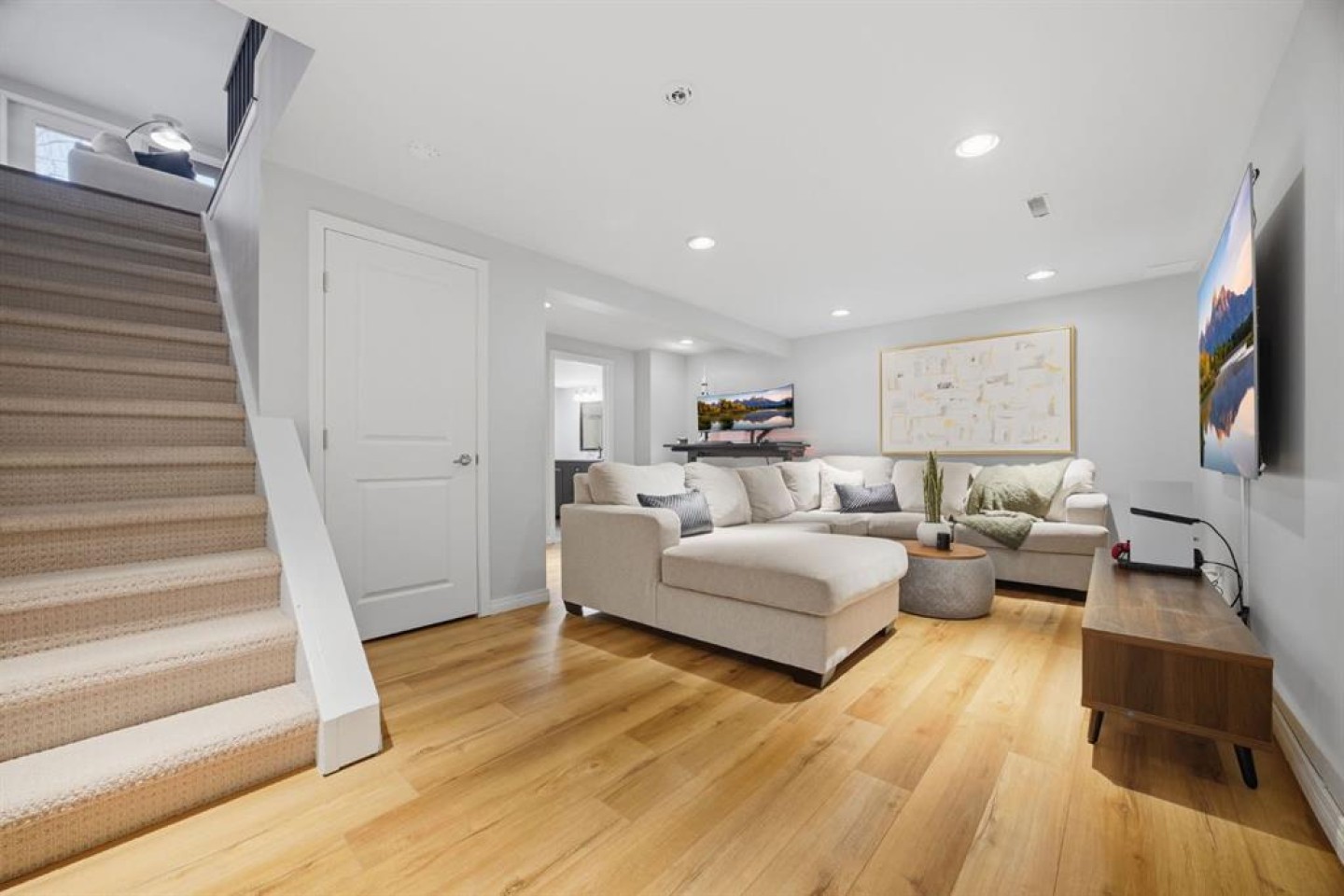 Downstairs, the lower level expands the living space in a meaningful way. Engineered hardwood runs throughout a large recreation area well suited for movie nights, watching the game, or entertaining family and friends. A bedroom and full bathroom offer flexibility for guests, teens, or extended family, while the cedar sauna adds a quiet place to unwind. A spacious utility room with built in shelving and counter space provides excellent storage and workspace.