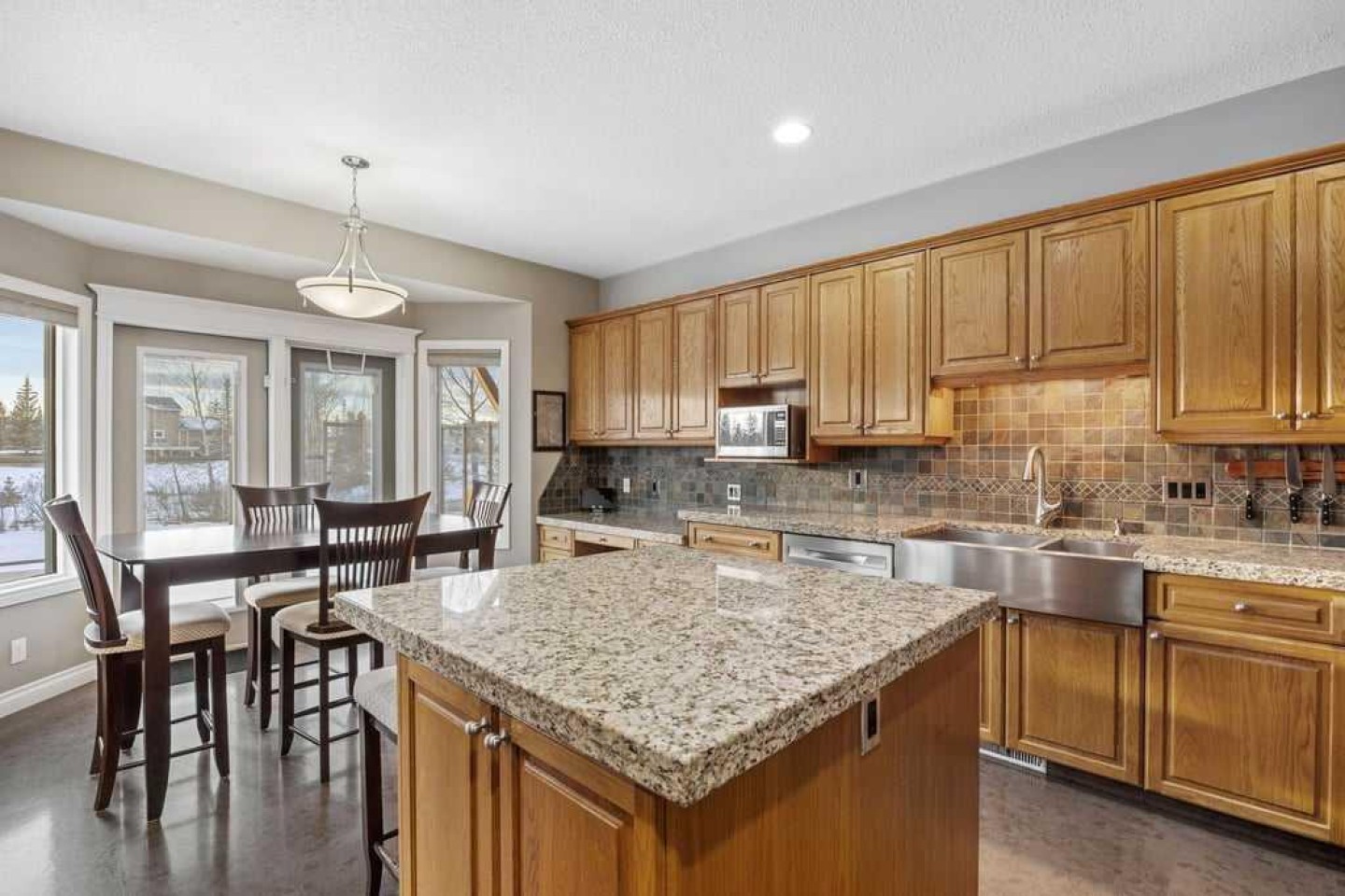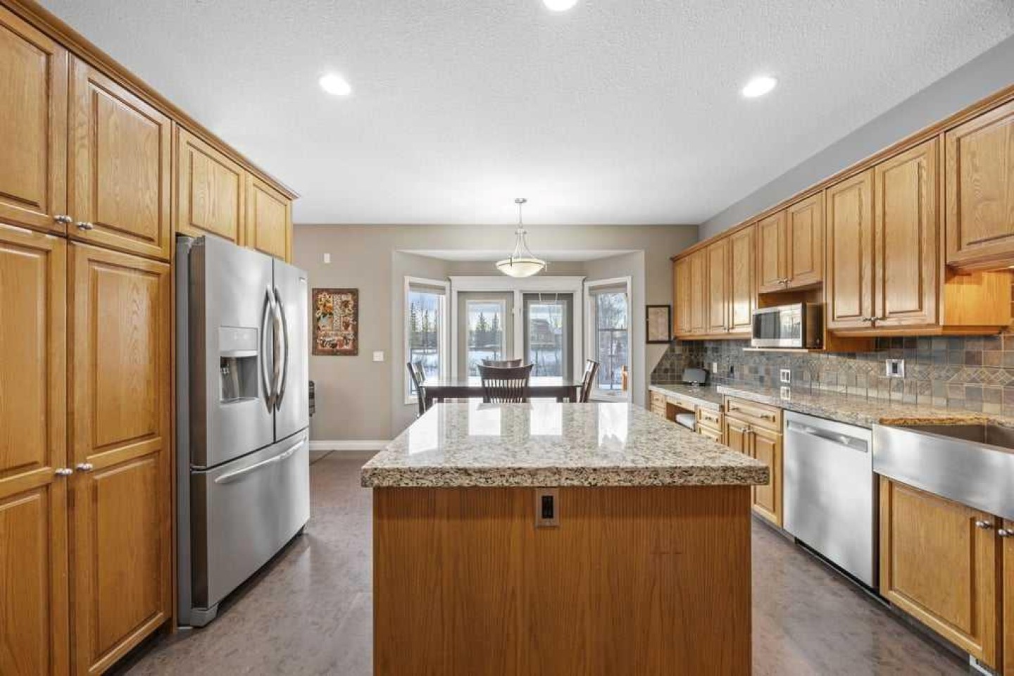 This beautifully designed walkout bungalow offers an exceptional blend of space, comfort, and functionality, all set on a picturesque 2.2-acre parcel with future potential. The main floor features three generously sized bedrooms, anchored by a welcoming hub-style country kitchen with warm cork flooring, a large central island, and an abundance of thoughtfully designed cupboards and drawers. The kitchen opens seamlessly to a bright eat-in dining area and extends outdoors to an expansive two-tier deck with glass railings—ideal for entertaining or enjoying peaceful views of the surrounding landscape.
