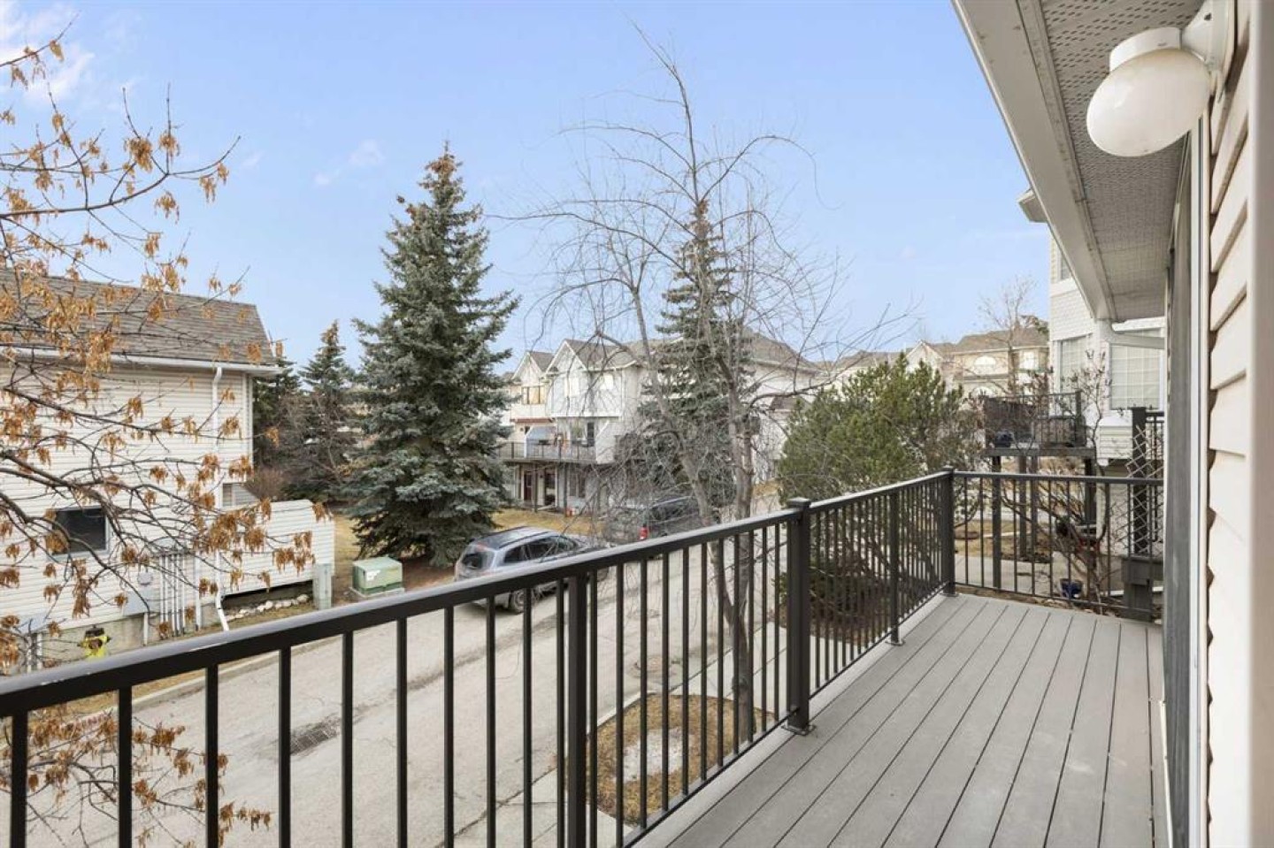 Upstairs, you’ll find two bedrooms plus a versatile bonus room or loft — ideal for a home office, reading nook, or play area. The generous primary bedroom enjoys tranquil views of the rear greenspace and connects to a large 4-piece bathroom featuring a corner soaker tub, separate shower, and cheater access. The second bedroom offers south-facing balcony views. Tile flooring is found in the kitchen and bathrooms, while the upper level is finished with carpet.