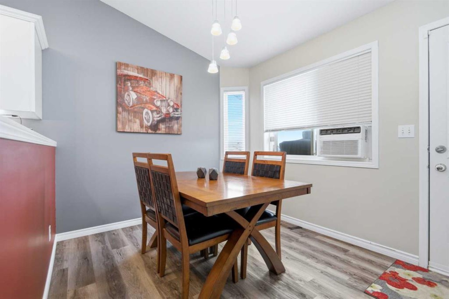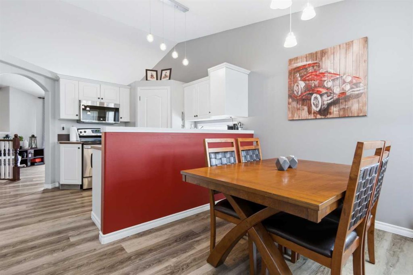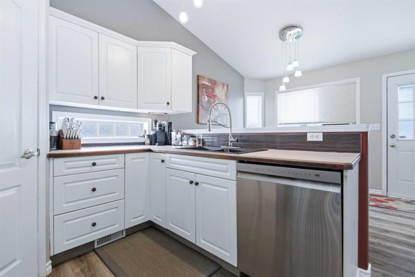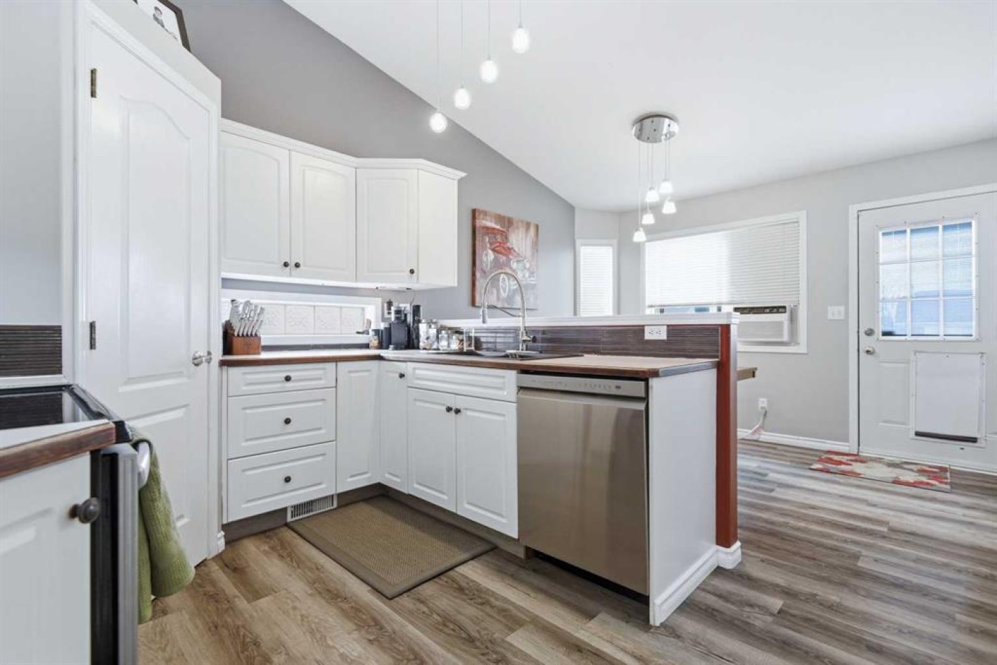 Inside, you will find five bedrooms, which is hard to come by at this price point. The main floor offers a practical layout with an easy, natural flow. The front living room features vaulted ceilings and a large window that brings in plenty of natural light. The kitchen connects nicely to the dining area and is finished with white cabinetry, creating a bright and welcoming space. Just off the dining room, the back door leads to a deck overlooking a fully fenced backyard, ideal for kids, pets, or summer evenings.