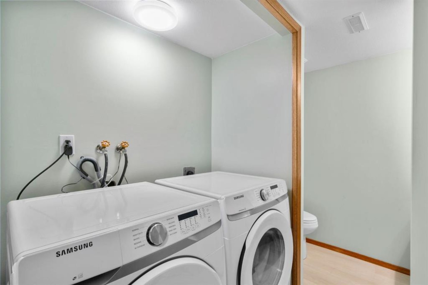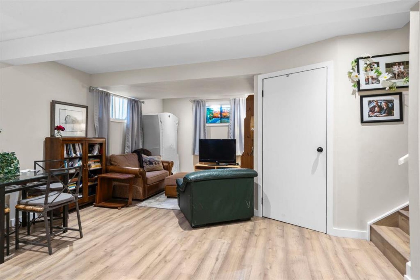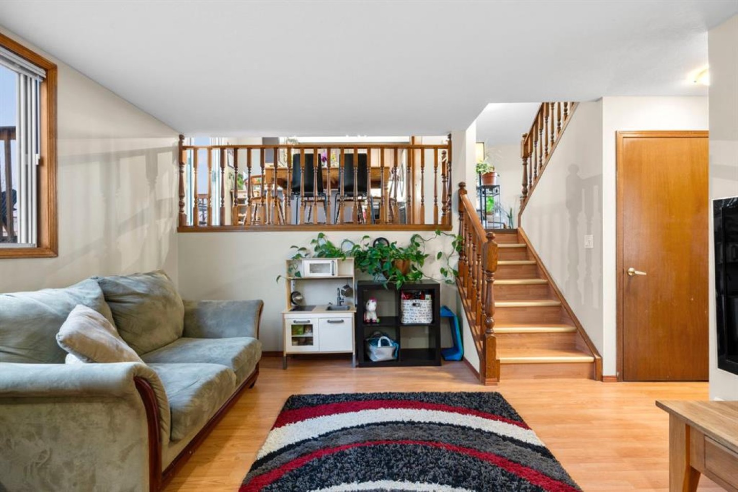 The main level is filled with natural light, featuring a welcoming front sitting room with large picture windows and sliding glass doors at the back that open to the spacious yard. The upgraded kitchen showcases updated cabinetry, countertops, modern lighting, and Samsung stainless steel appliances, making it both stylish and practical for everyday living.