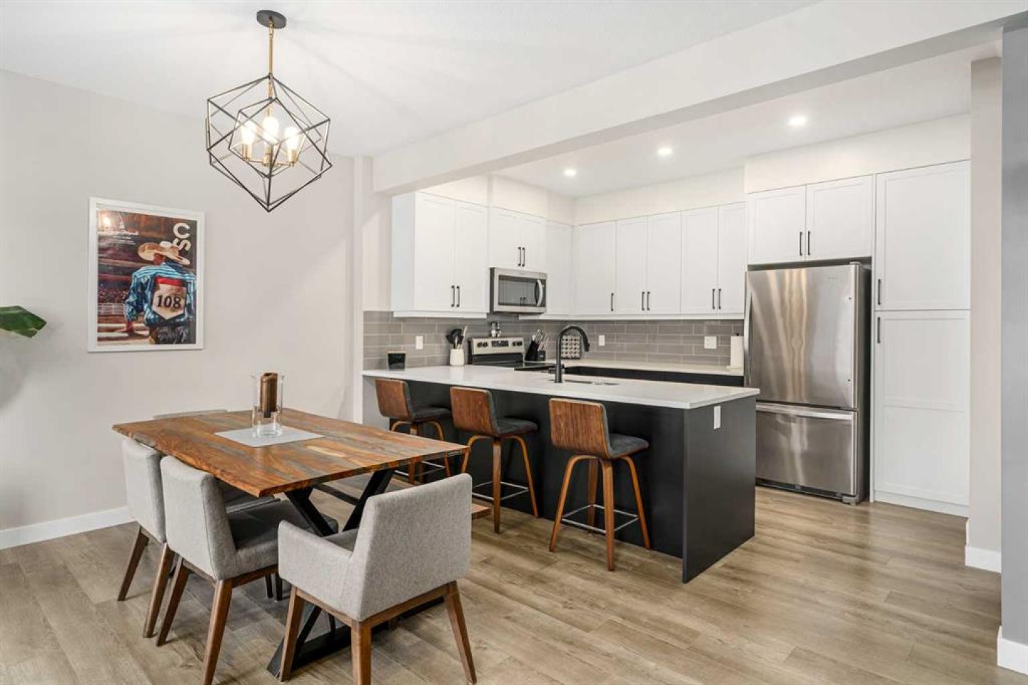 Welcome to this beautifully upgraded, move-in-ready townhome in the sought-after community of Crestmont, where modern comfort meets that “escape-to-the-mountains” lifestyle, right here in the city. Surrounded by tranquil pathways, sweeping mountain views, and easy access to nature, this home is ideal for anyone who wants a stylish space with a warm, welcoming feel. Step inside to a bright, open-concept main floor designed for everyday living and easy entertaining. The living room and dining area offer ample space to host, relax, and gather—flooded with natural light thanks to west-facing windows that create a warm, inviting feel throughout the afternoon and evening. Durable vinyl plank flooring flows through the space, complemented by contemporary fixtures and a crisp, elevated finish. The kitchen is a standout with full-height cabinetry, quartz countertops, and a generous breakfast bar—perfect for morning coffee, quick meals, or gathering with friends while you cook. Just off the kitchen and main living area, you’ll find a feature wall that truly sets the tone: a beautifully finished bar area with rich wood detailing that brings a “Whistler-inspired” vibe home—equal parts cozy, refined, and made for hosting. Upstairs, the layout continues to impress with two well-proportioned bedrooms and smart storage throughout. The spacious primary retreat features a large pass-through closet complete with custom built-ins and an upgraded ensuite with a sleek walk-in shower—clean lines, modern finishes, and a spa-like feel. The second bedroom and additional full bathroom offer flexibility for guests, kids, or a dedicated home office. Outside, enjoy the covered balcony with a BBQ gas line—ready for year-round grilling, morning sun, or a quiet evening unwind. You’ll also appreciate central air conditioning for summer comfort. The oversized double tandem garage provides impressive versatility, with space for two vehicles, bikes, seasonal gear, or even a future workshop setup, plus extra storage in the utility room and convenient foyer area for day-to-day organization. Crestmont is loved for its peaceful, nature-forward setting—pathways, off-leash areas, and that “weekend getaway” feeling—while still keeping you close to everything. You’re minutes to Winsport, Calgary Farmers’ Market West, great local shops and restaurants, and you’ll love the quick access to downtown Calgary or an easy escape west to the Rockies. This is the kind of home that checks the boxes for lifestyle, design, and practicality—without compromise.