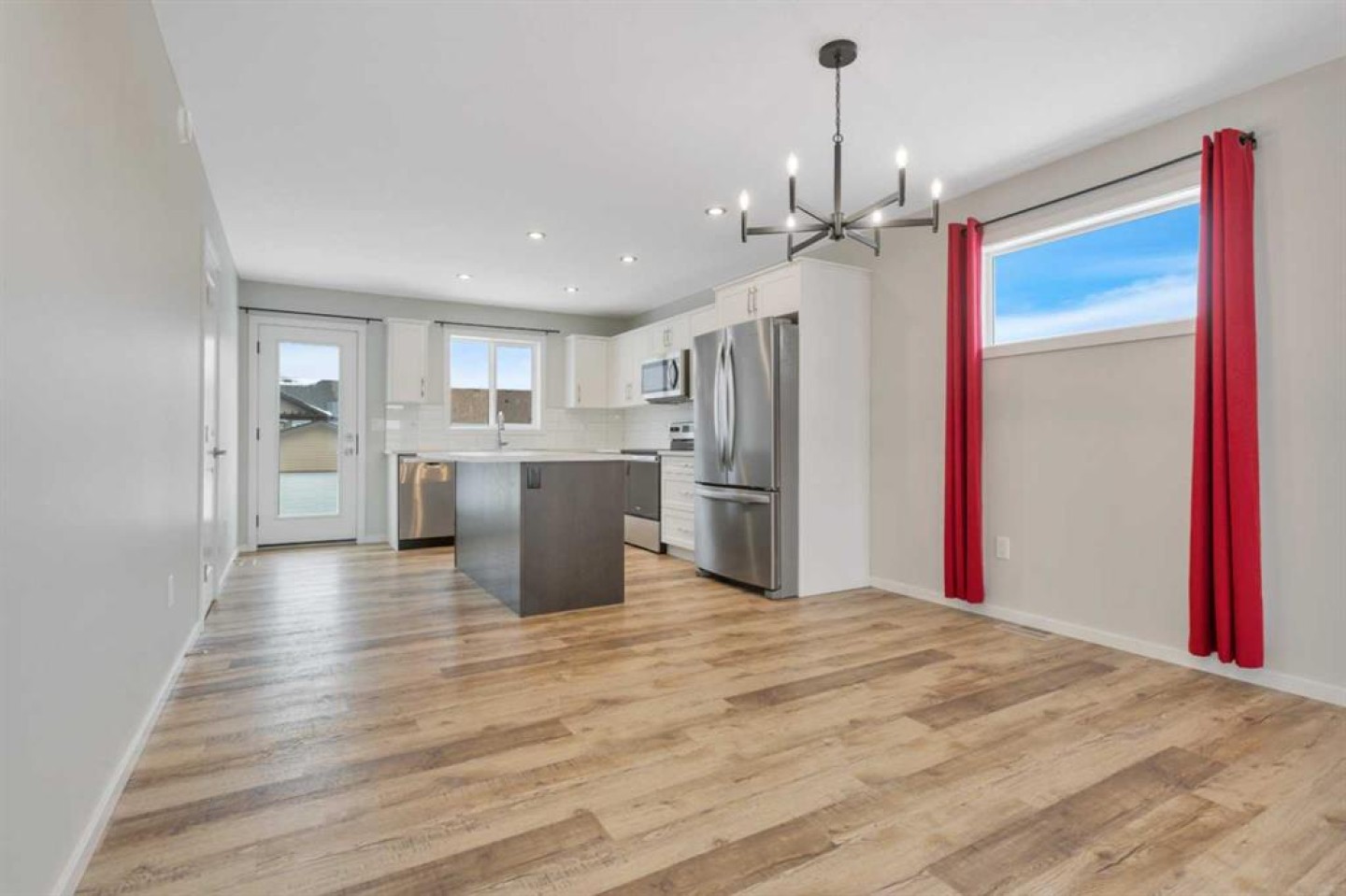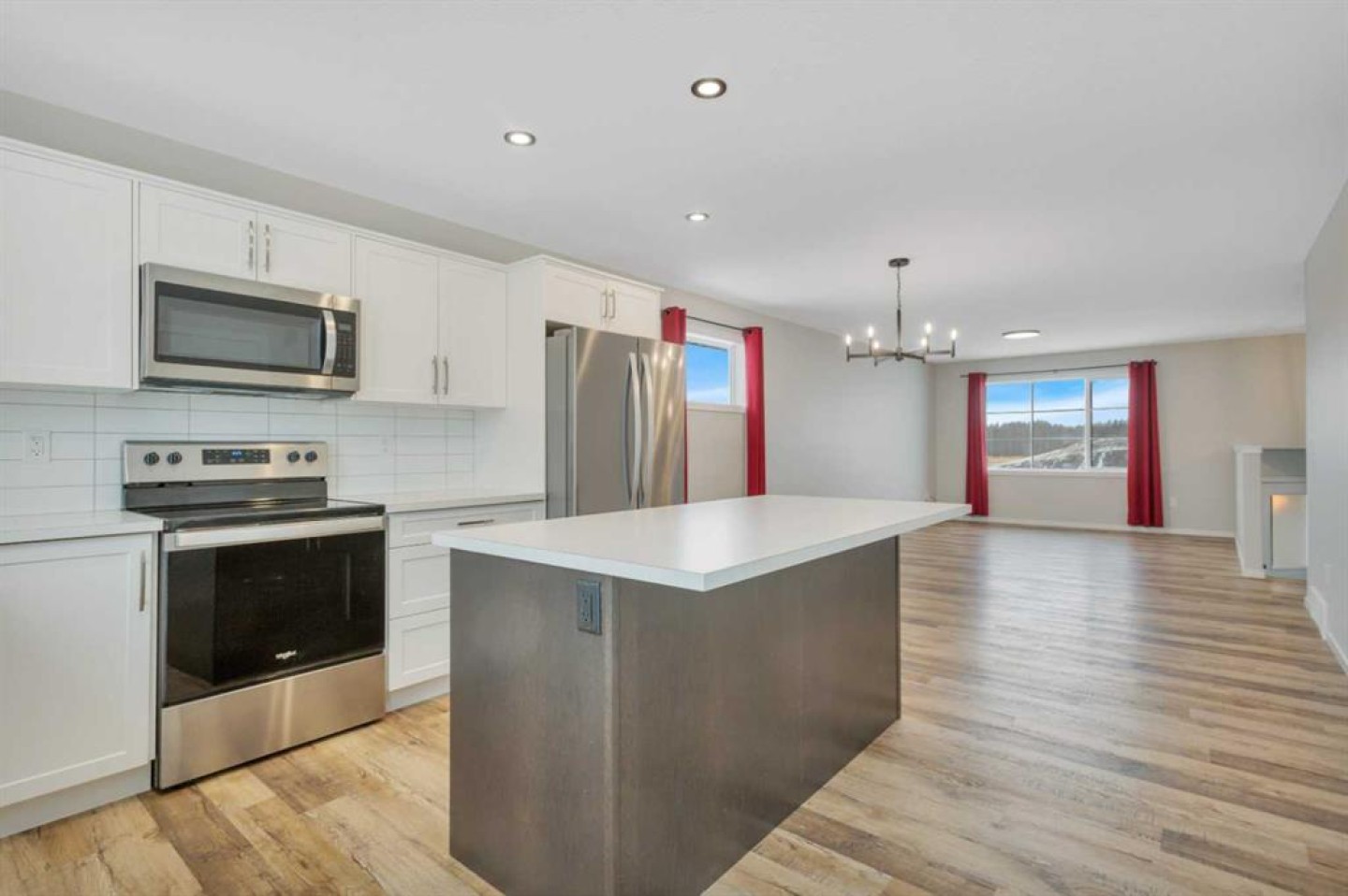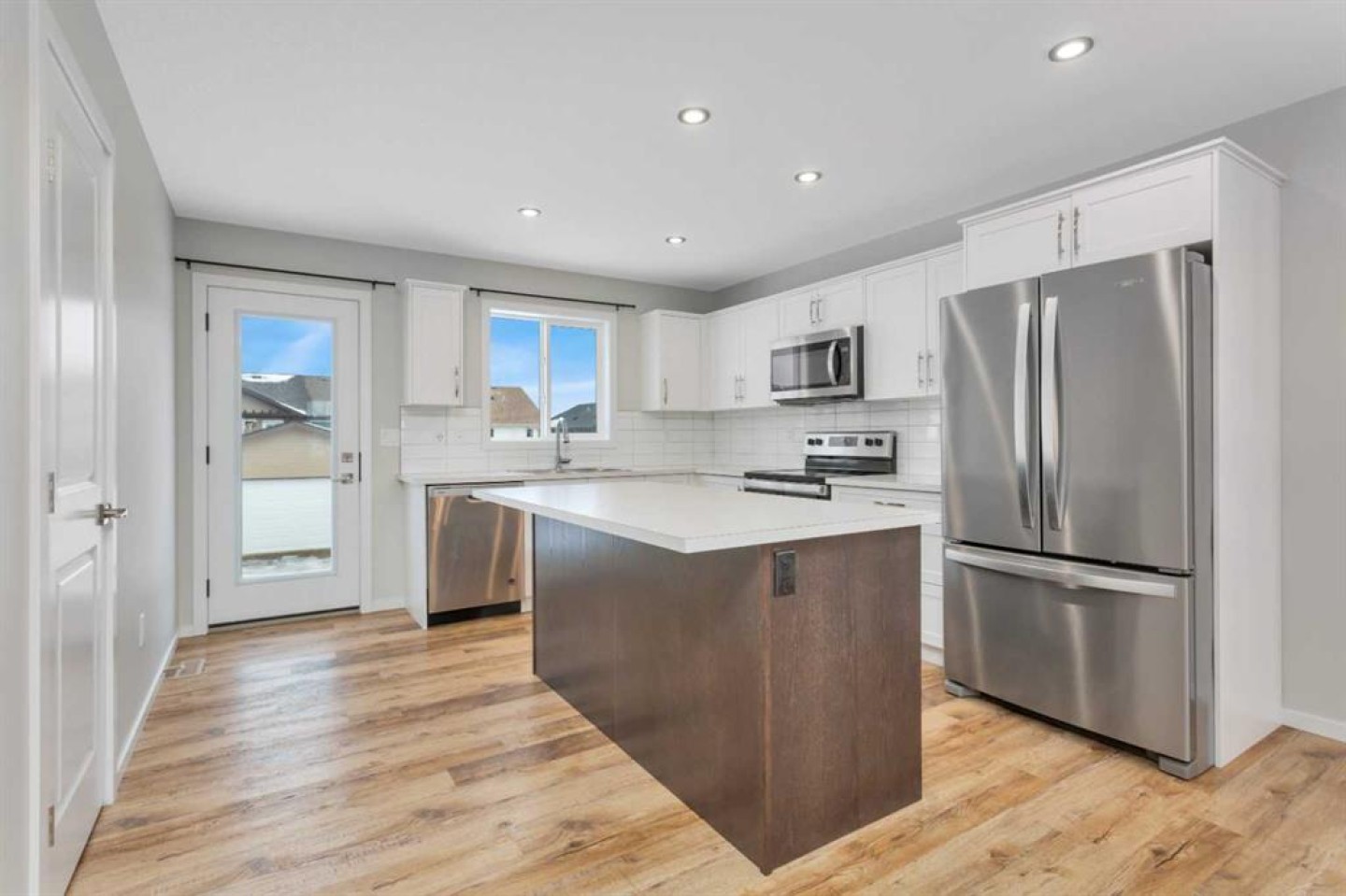 Welcome to this 2-year-old, 2024 Leabon-built bi-level located at 4424 53 Street in the desirable Creekside community of Rocky Mountain House. This home features an attached garage and a modern open-concept main living area encompassing the kitchen, dining, and living room. The kitchen is finished with white cabinetry, solid stone countertops, a central island, stainless steel appliances, a pantry, black light fixtures, and durable luxury vinyl plank flooring throughout the main level.