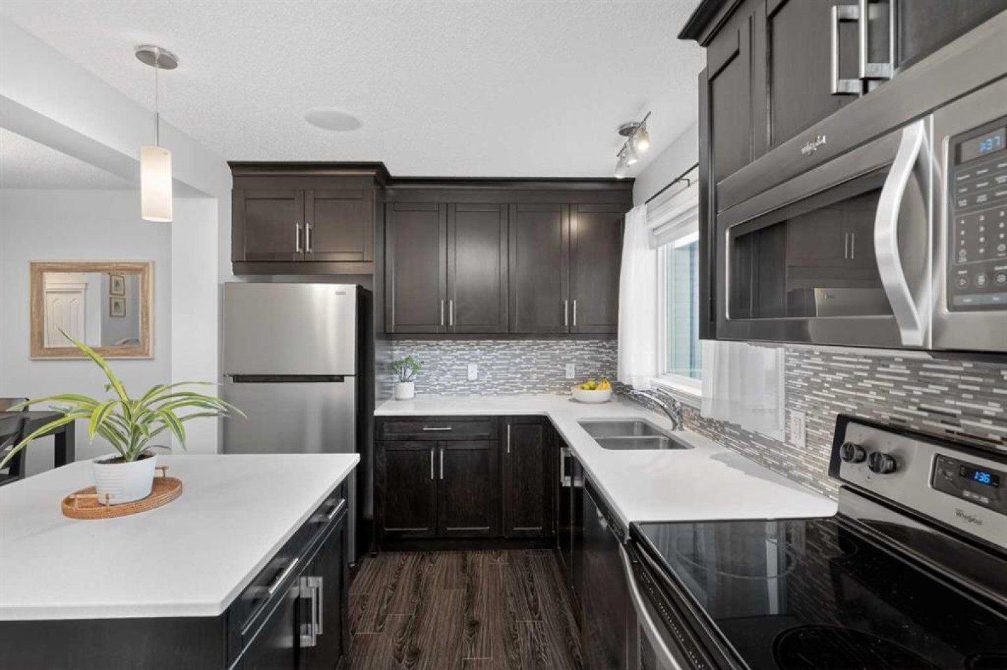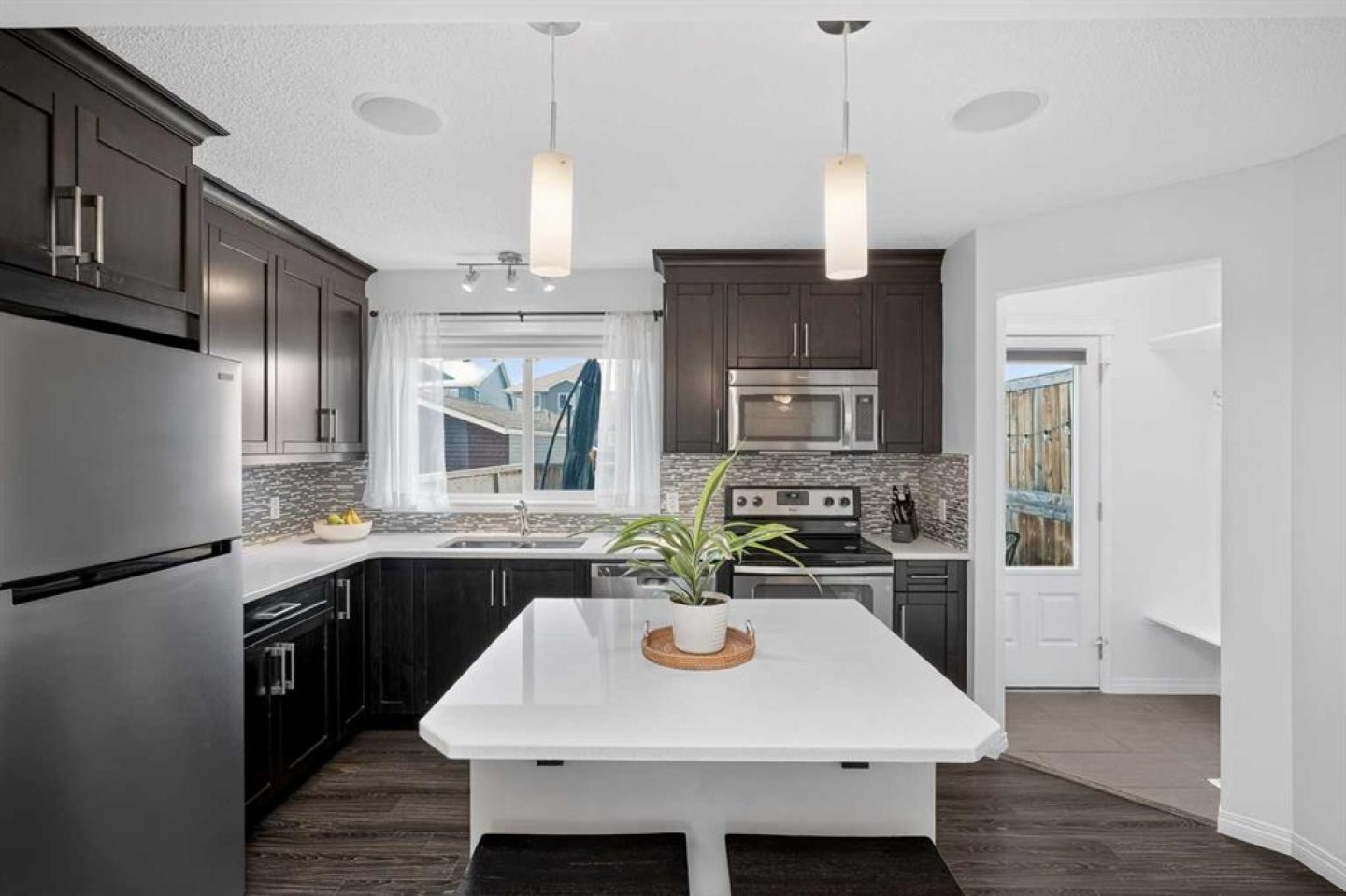 Welcome to this impeccably maintained home in the heart of Auburn Bay, one of Calgary’s premier lake communities. This bright and airy residence features an open-concept main floor designed for seamless entertaining, highlighted by 9’ ceilings, durable laminate flooring, and stylish finishes. The gorgeous kitchen is a standout, boasting espresso cabinetry, sleek quartz countertops, a central island, and stainless steel appliances. A functional mudroom with built-in storage lockers and a half-bath completes the main level.