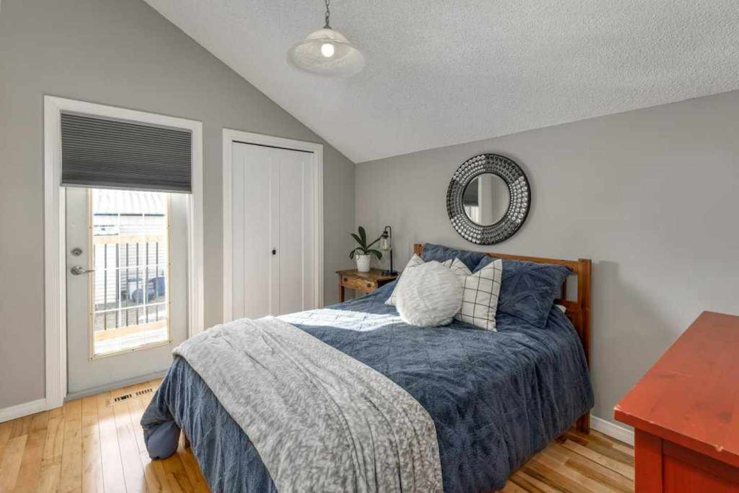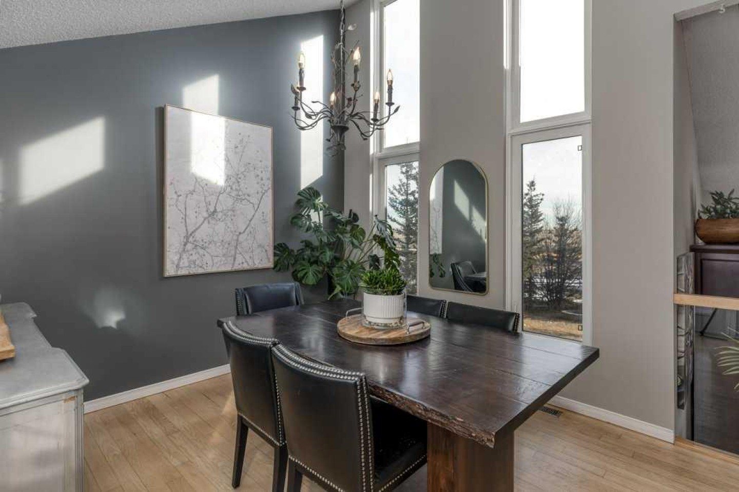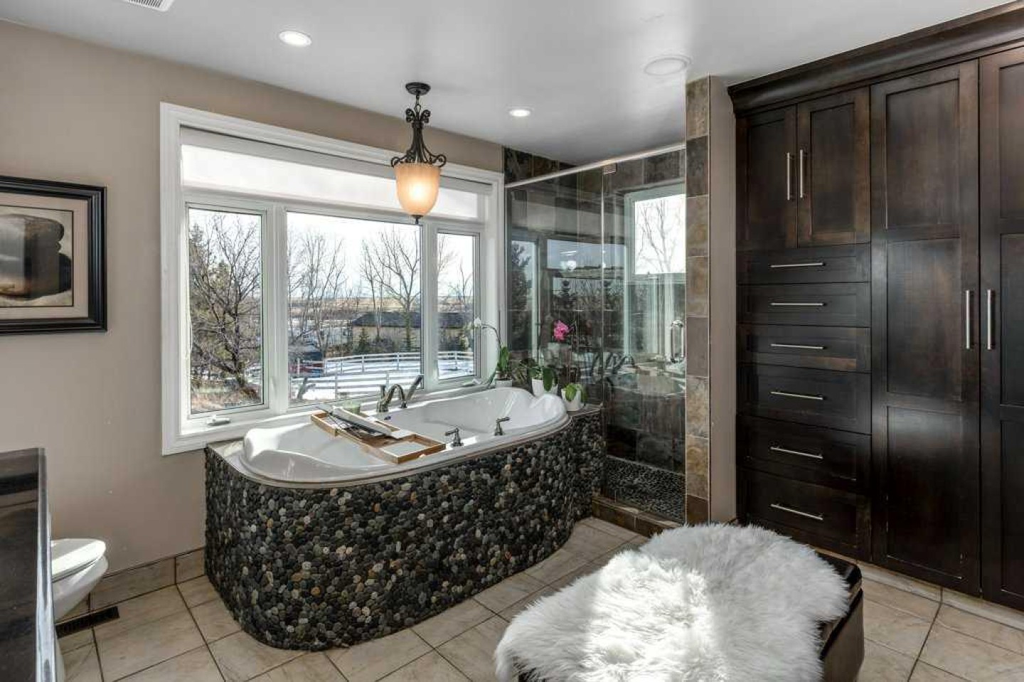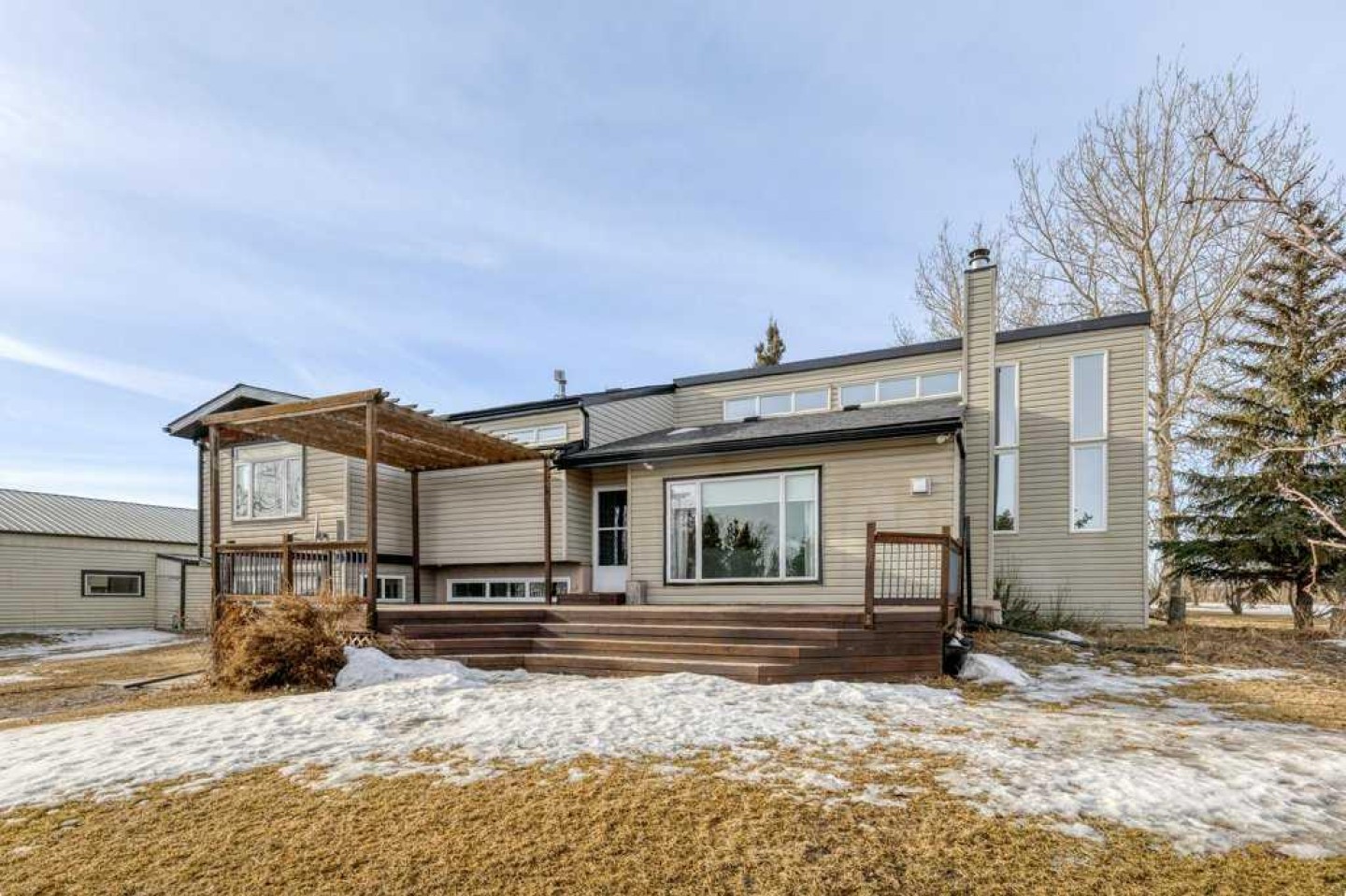 Experience the best of acreage living just minutes from Calgary city limits on this picturesque 4.28-acre property featuring a beautifully updated home full of character. The unique split-level design offers three bedrooms on the main level, including a spacious primary suite complete with a luxurious ensuite showcasing heated floors, a soaker tub, double sinks, and abundant built-in storage. Vaulted ceilings and hardwood flooring enhance the main living areas, while the sunken family room creates a warm and inviting space with a gas fireplace and direct access to the outdoors.