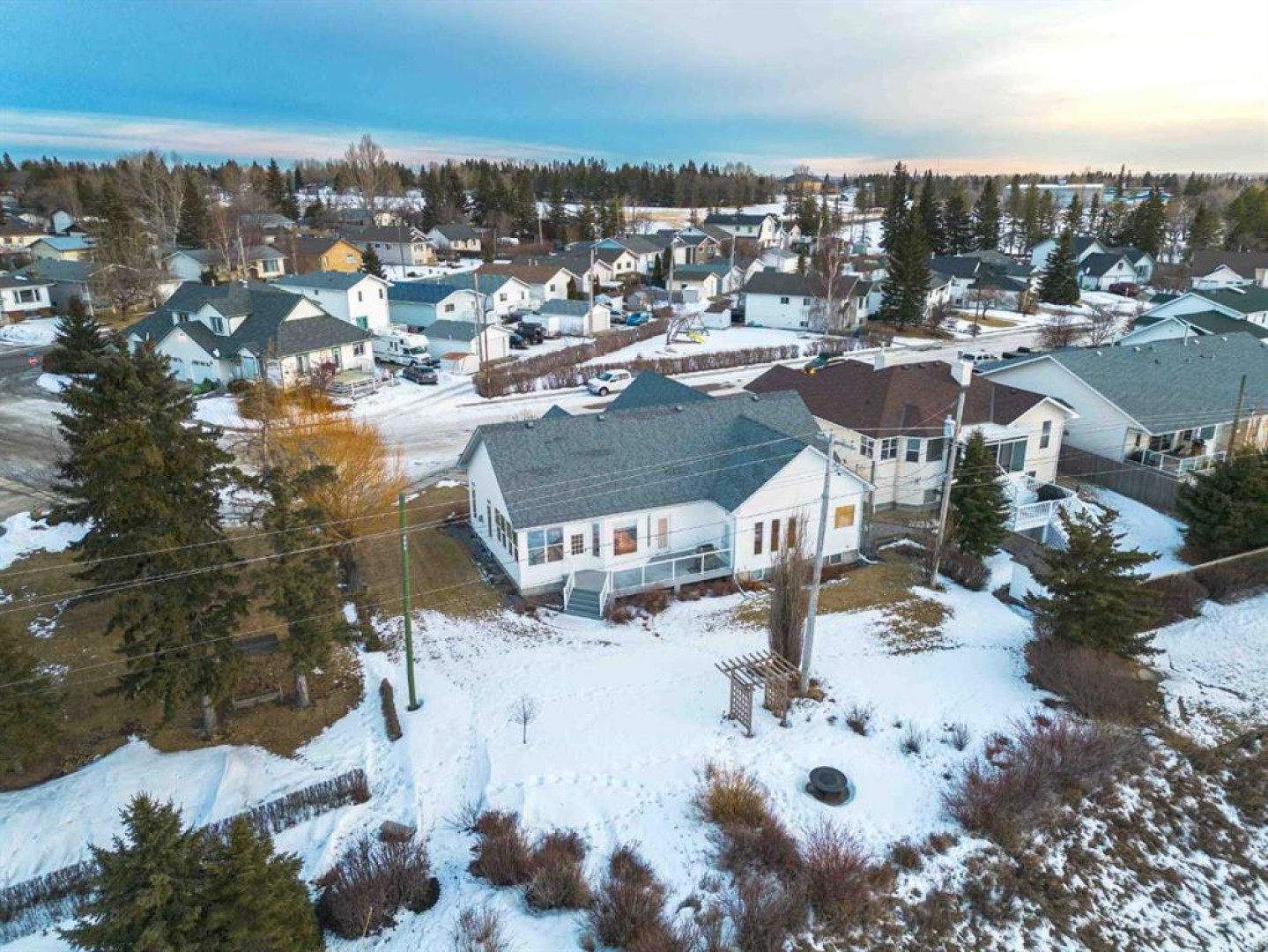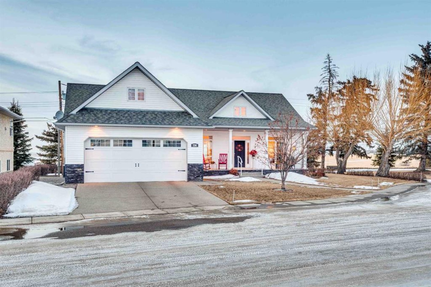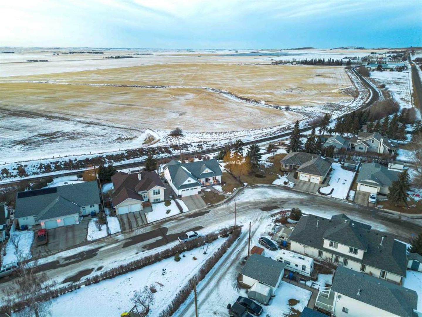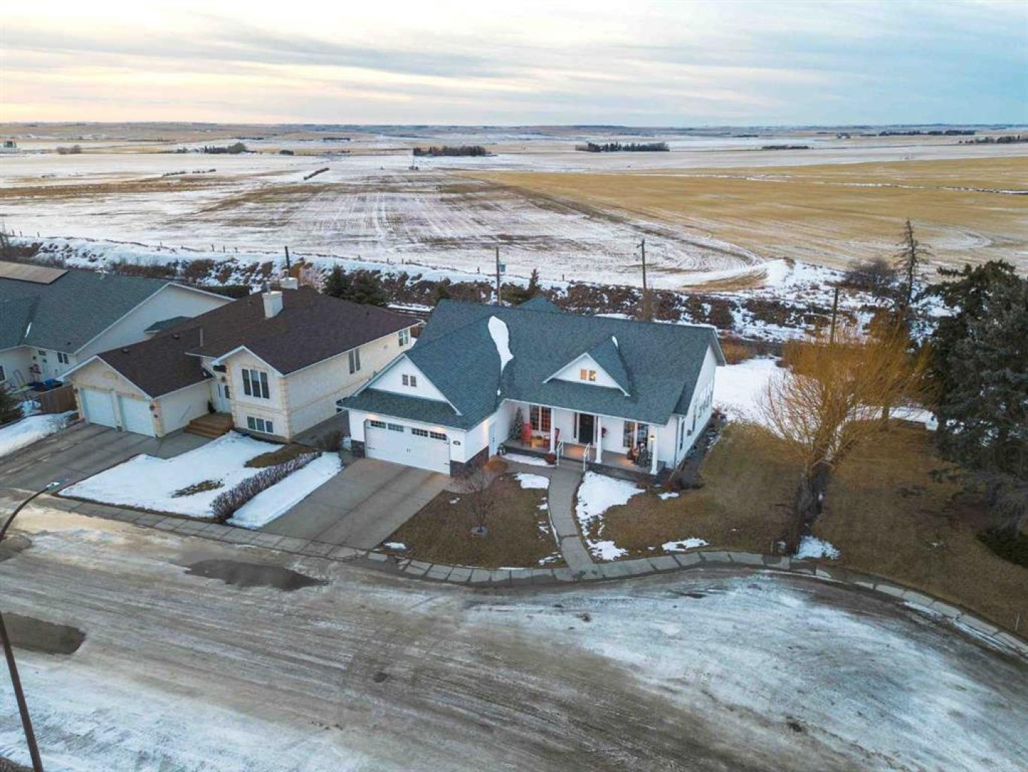 Enjoy amazing country views from this well-appointed bungalow featuring a fully developed basement and a versatile loft space above the attached garage. Thoughtfully designed with comfort and functionality in mind, this home offers an ideal layout for empty nesters or families alike. The main floor welcomes you with a bright living room highlighted by a vaulted ceiling and cozy gas fireplace, flowing seamlessly into a generous dining area with direct access to the sunroom—perfect for enjoying the surrounding views year-round. The kitchen is well equipped with an island, quartz countertops, and ample cabinetry. Retreat to the vaulted primary bedroom, complete with a walk-in closet, 5-piece ensuite, and access to the back deck. Completing the main floor are a second bedroom, a 4-piece bathroom, stairs leading to a versatile loft space above the garage, and a generous laundry area offering convenient access to both the developed basement and the attached double garage. Downstairs, the large developed basement is ideal for entertaining or extended family use, featuring a massive recreation area, kitchenette, 3-piece bathroom, and two bedrooms (one currently used as a storage room and not fully finished). Located in the welcoming Town of Three Hills, residents enjoy excellent amenities including schools, parks, playgrounds, swimming pool, arena, walking trails, hospital, shopping, dining, and a strong sense of community—while still benefiting from the peace and space of small-town living with beautiful prairie views.