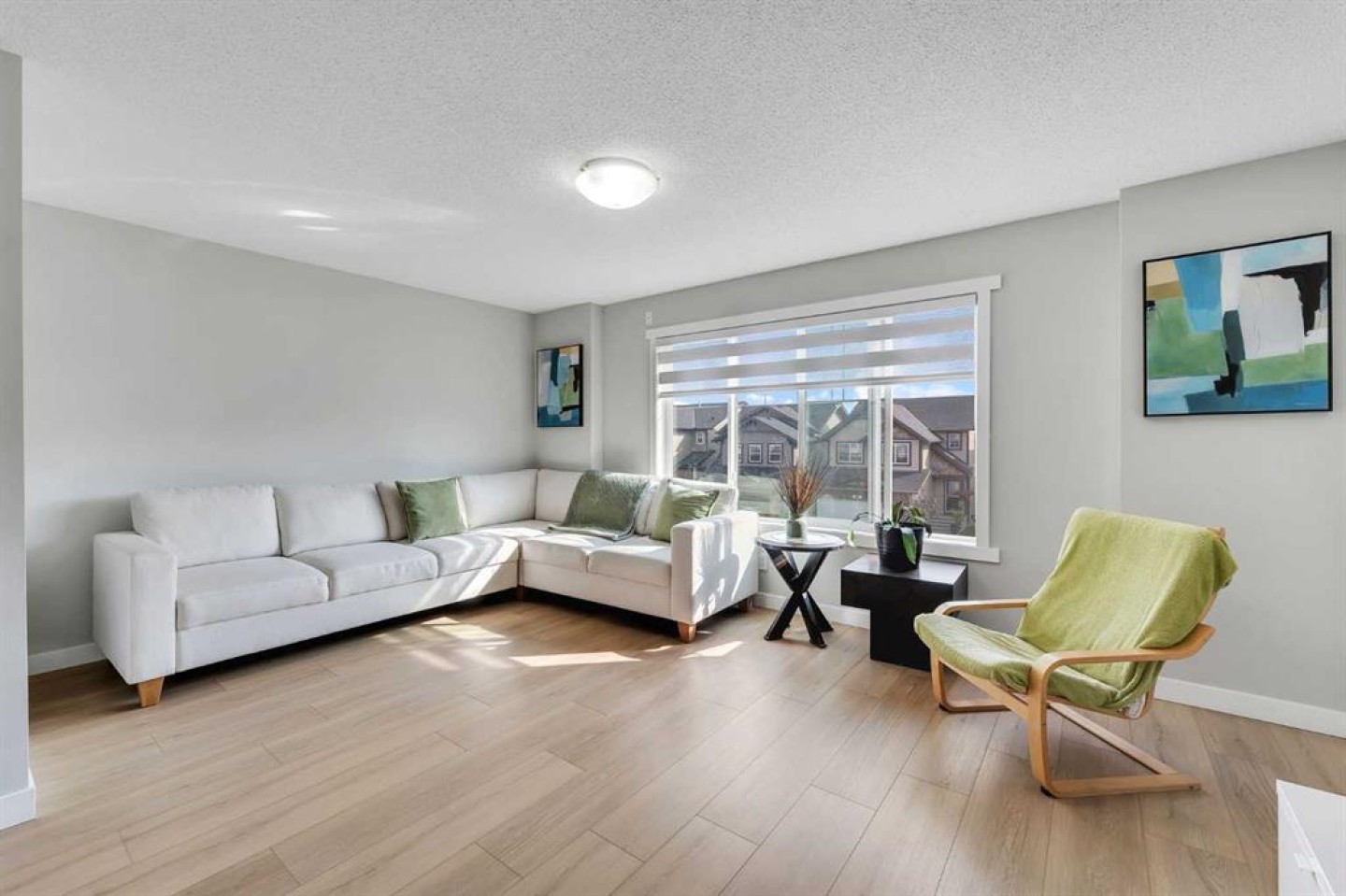The open-concept main floor features a bright and welcoming living room with a cozy gas fireplace, a modern kitchen equipped with an electric stove (with rough-in for gas), a large walk-in pantry, and a spacious dining area.
