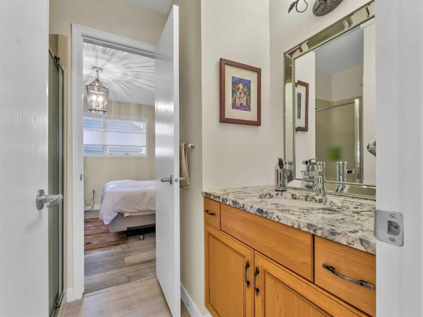 The main floor includes two generously sized bedrooms, including a spacious primary retreat featuring a gorgeous walk-in closet, a 4-piece ensuite with double vanity and walk-in shower, and direct access to a charming private deck—perfect for enjoying your morning coffee. The second bedroom is conveniently located near the 3-piece main bathroom, which features cheater access for added functionality. The main floor laundry room includes a laundry sink and is located just off the garage entry.