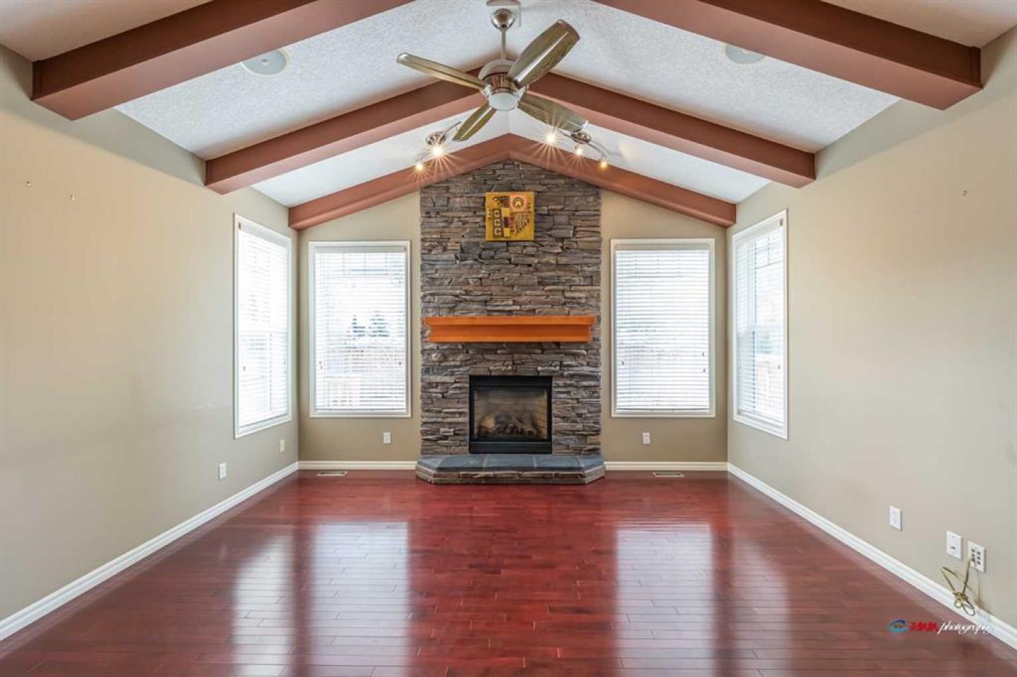 The main floor features an inviting open-concept layout with a soaring vaulted ceiling in the living room, highlighted by a stunning floor-to-ceiling stone-faced fireplace and decorative ceiling beams. The chef-inspired kitchen boasts granite countertops, maple cabinetry, a raised breakfast bar, corner pantry, and newer stainless steel appliances—including a refrigerator and electric stove replaced within the last two years. A bright and expansive breakfast nook opens onto a newly painted oversized deck with a BBQ gas line, perfect for outdoor entertaining.