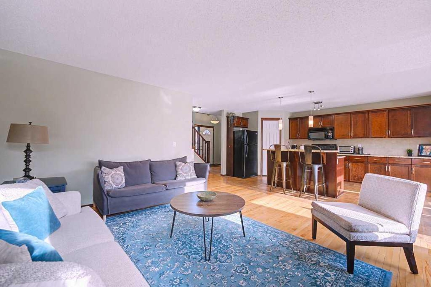 Step inside to a bright, open-to-above foyer that immediately creates a sense of space and light. The main floor features an open-concept layout with a sun-filled kitchen offering plenty of cabinetry, black appliances, and a central island topped with granite countertops. The kitchen flows seamlessly into the living room, anchored by a gas fireplace with tile surround and mantle, and into the dining area with patio doors leading to a south-facing backyard and deck—perfect for enjoying all-day sunshine. A convenient 2-piece bathroom and main-floor laundry room complete this level. The double attached garage is insulated and drywalled, adding everyday comfort and storage.