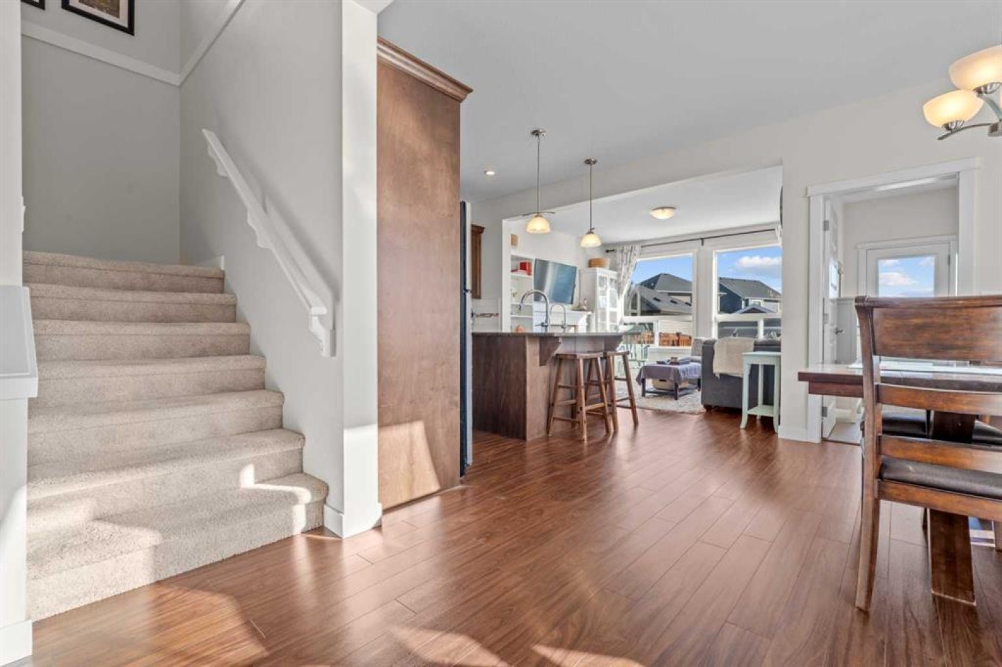 Welcome to this beautifully maintained, original-owner home, perfectly situated on a quiet CORNER LOT beside a scenic WALKING PATH. Thoughtfully designed and ideally located, it’s just STEPS from a SCHOOL, PLAYGROUND, POND, PARK, and a protected nature preserve. Inside, the 9-ft ceilings and open floor plan create a bright, welcoming atmosphere. The main level includes a versatile OFFICE/DEN, a modern kitchen with STAINLESS STEEL APPLIANCES that flows seamlessly into the dining area, and a comfortable living room centered around a cozy FIREPLACE. A convenient powder room and a well-organized mudroom, with both a closet and pantry, add everyday practicality. The backyard offers a generous outdoor space with a huge DECK, SHED, playhouse/platform, and GARDEN BOXES filled with assorted herbs. As spring arrives, the property comes alive with raspberry and haskap bushes, rose bushes, mountain ash, Bailey’s Schubert, Japanese lilac trees, and a charming crabapple tree in the front yard. Upstairs, you’ll find three spacious bedrooms and two full bathrooms. Relax with a book in the sitting area next to the window of the primary bedroom, or soak in the tub in the primary ensuite, with dual sinks, and a walk-in closet. A separate upper-level laundry room adds extra convenience. The undeveloped basement features 9-ft ceilings, large windows, and ample room to create additional living space, whether you envision an office, extra bedroom, or a home gym, with mirrors already included. A brand new hot water tank and water softener is also included. Only a quick 20 minute commute to Calgary city limits, this home offers so much value with a wonderful blend of comfort, function, and family-friendly living in a truly inviting setting.