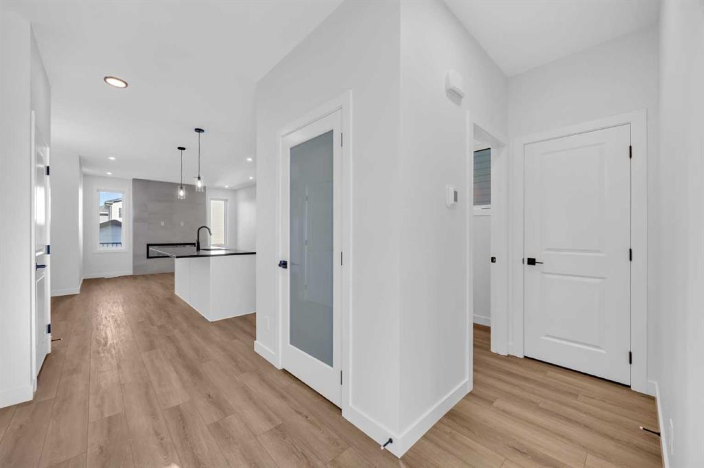Welcome to the Concord II by Broadview Homes, a brand new home with a detached garage, Hardie exterior siding, and a rare park-facing lot in Vermilion Hill, one of Southwest Calgary’s most nature-focused new communities. Offering 3 bedrooms, 2.5 bathrooms, a main floor flex room, and future basement suite rough-ins, this home delivers modern style with long-term flexibility. The main level features a versatile front flex space ideal for a home office or guest area, along with an open-concept layout designed for everyday living. The kitchen includes quartz countertops, a large 7’6” island, and cabinetry to the ceiling for a clean, elevated finish. The dining and great room flow seamlessly together, highlighted by an electric fireplace with stunning floor-to-ceiling tile detail. Upstairs, the primary suite offers a walk-in closet and a beautifully finished ensuite with dual vanities, a fully tiled shower, and a soaker tub. Two additional bedrooms, a full bathroom, and upper-level laundry complete the upper floor.