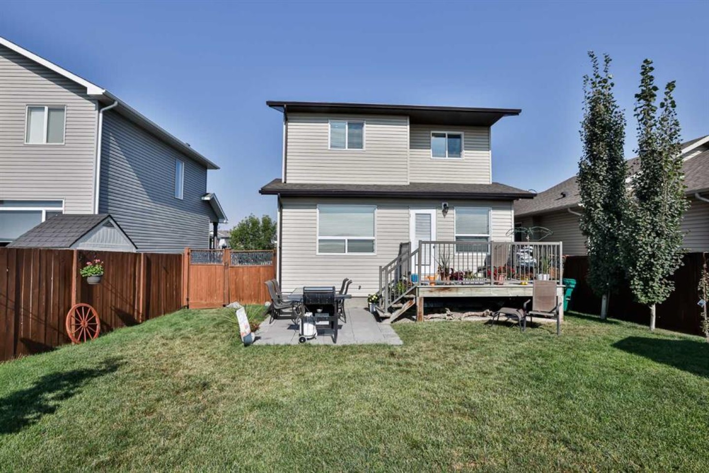 Check out this fantastic fully developed 3 bedroom home with mountain views! Located in the Sunridge neighborhood, this home, built by Cedar Ridge Homes, has it all; all of the quality upgrades you would expect to find in a showhome, located on a quiet street close to amenities, backing onto an open field so no back neighbor, and stunning views of the mountains. This home has been immaculately maintained and it shows. The main floor offers a bright open floorplan with beautiful espresso colored cabinets, gorgeous granite countertops, a pantry, and stainless steel appliances. The dining room and living room have large picture windows to take in the expansive view offered by having no back neighbor or development behind the property. The backyard is fully fenced and landscaped. Upstairs offers 3 bedrooms and boasts newer premium carpet with upgraded underlay you can see and feel instantly. The master bedroom has a walk-in closet and ensuite with tiled glass shower and large soaker tub. The basement was professionally finished in 2021 to seamlessly match the rest of the home and adds an additional TV room, storage room, and 3 piece bathroom with a glass tiled shower. The bright white walls, windows, and premium finishes make this a beautiful and comfortable space. The home also has all of the functional features you would want for added convenience like a double attached garage with a gas heater, air conditioning, tankless hot water heater, and a shed in the backyard for additional storage. This is the perfect home with everything you could want, quick possession possible, call your favorite real estate agent today to view.