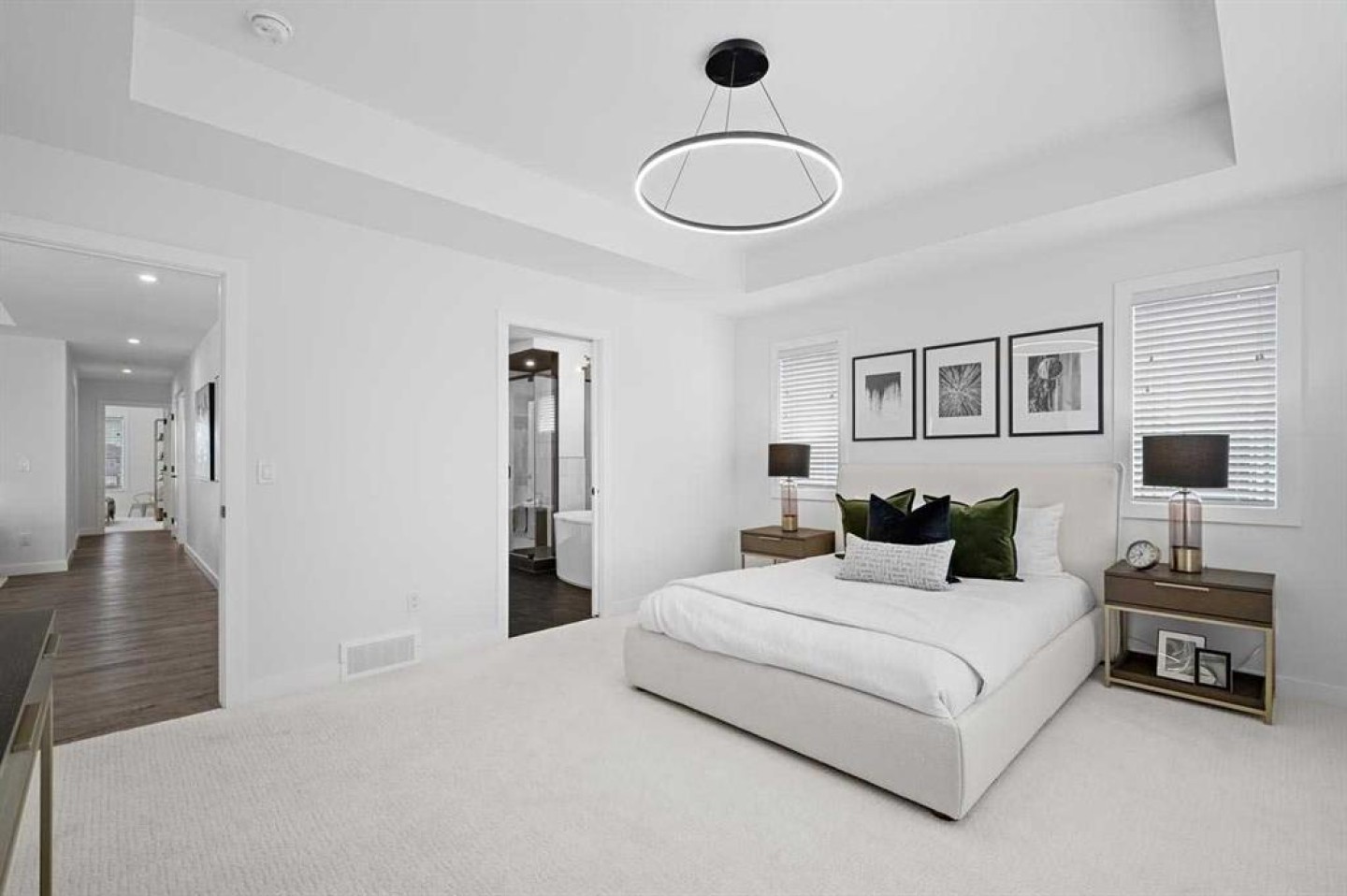 Upstairs, the primary bedroom is designed as a private retreat overlooking the wetlands, complete with a spa-inspired ensuite including a tiled shower, a standalone soaker tub, and a generous walk-in closet. Two additional bedrooms, a full bathroom, upper-level laundry, and a central bonus room provide well-balanced space for modern family living.
