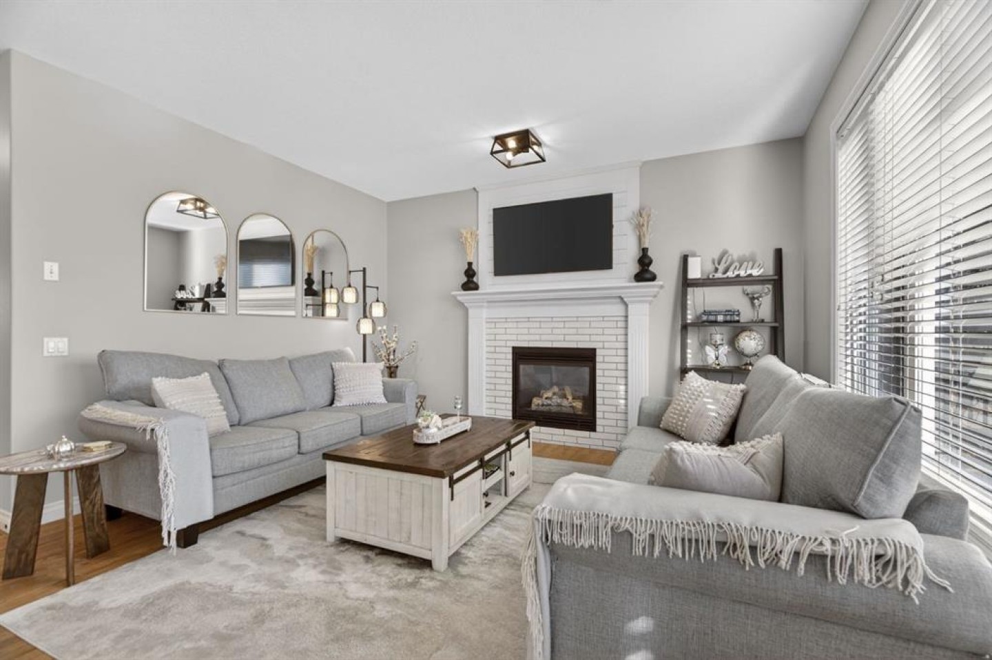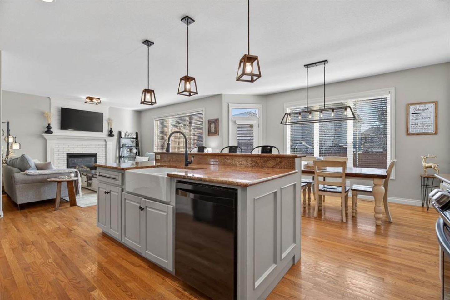 Welcome to this beautifully updated, fully finished home that blends comfort, style, and everyday functionality. From the moment you arrive, you’ll notice the pride of ownership — featuring great curb appeal and an insulated, drywalled, heated garage, perfect for Alberta winters. Inside, you’re greeted by gleaming hardwood floors and a bright, open-concept layout enhanced by designer lighting, in-floor heating, central air conditioning, and a modern neutral colour palette throughout. The living room is warm and inviting, centered around a sophisticated fireplace — the perfect place to unwind while still feeling connected to the rest of the main floor. The kitchen is a true showstopper, designed for both cooking and entertaining. It features granite countertops, a massive double refrigerator, apron-front sink, timeless subway tile backsplash, raised breakfast bar island, and a convenient walk-through pantry that makes grocery days effortless. The dining area is surrounded by windows and elevated with chic lighting, creating an ideal space for family meals or hosting guests. The main level also offers a stylish powder room with trendy shiplap detailing, plus a practical laundry and mudroom just off the garage. Upstairs, the bonus room provides a great hangout space, open to below with extra windows that keep the area feeling bright and airy. The primary suite is a true retreat, with room for king-sized furniture, a large walk-in closet, and a spa-inspired ensuite complete with dual sinks, a deep soaker tub, and separate shower. Two additional bedrooms are spacious and share a well-appointed 4-piece bathroom. The fully finished basement is filled with natural light and additional pot lighting for the evenings. Whether it’s movie nights or game days, the rec room — featuring a barn wood feature wall and cozy electric fireplace — is the perfect gathering space. You’ll also find a fourth bedroom, full bathroom, and flexible space for a gym, hobby room, or guests. Step outside to the composite deck overlooking the peaceful backyard — perfect for summer BBQs or relaxing evenings, the private yard is surrounded by mature trees with plenty of room for kids and pets to play. Located in the sought-after community of Cimarron Springs, you’ll enjoy access to 20 acres of green space, a central park with playground and toboggan hill, over 8 km of pathways, and close proximity to the escarpment, Sheep River, and local schools — making this an incredibly walkable, family-friendly neighbourhood.