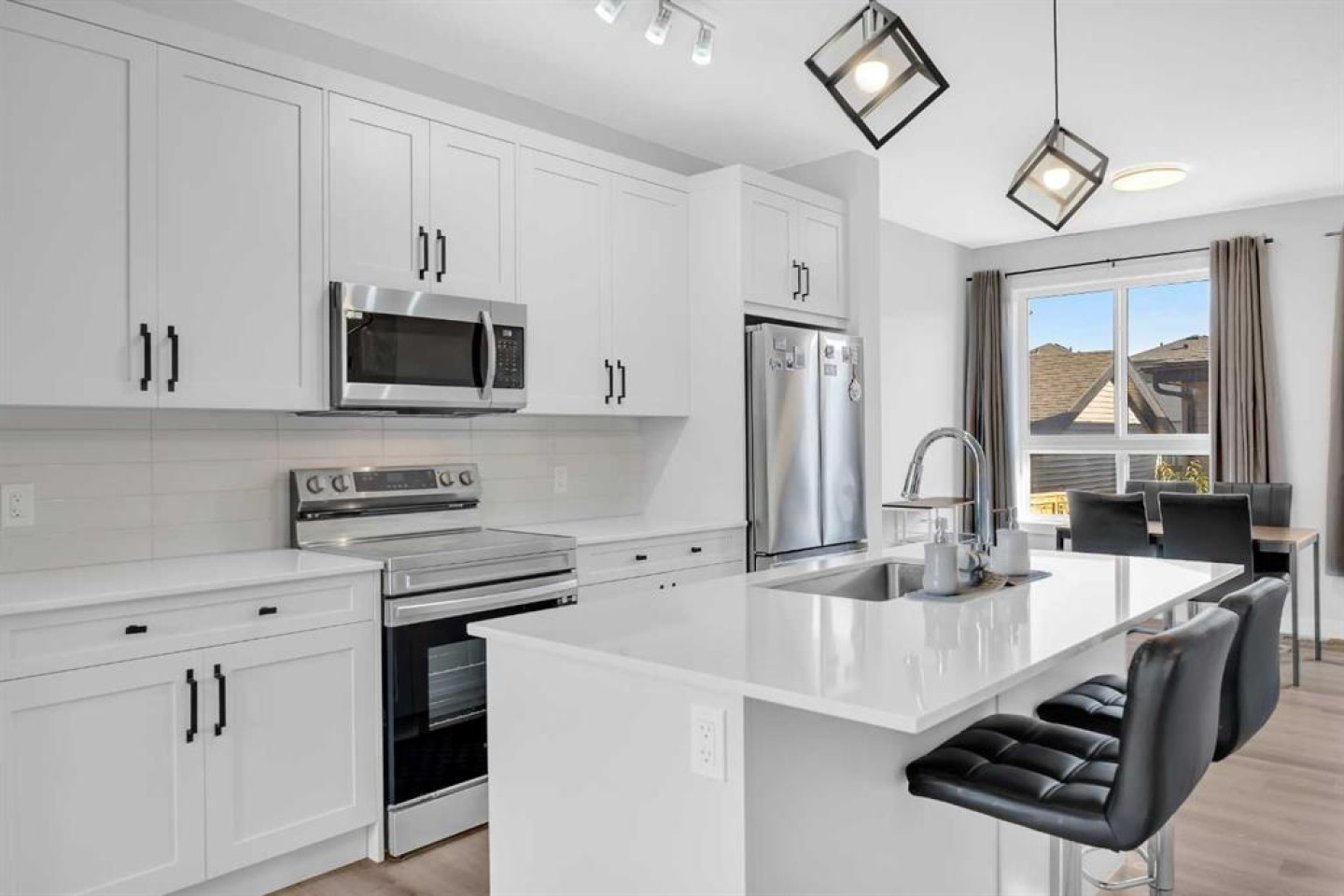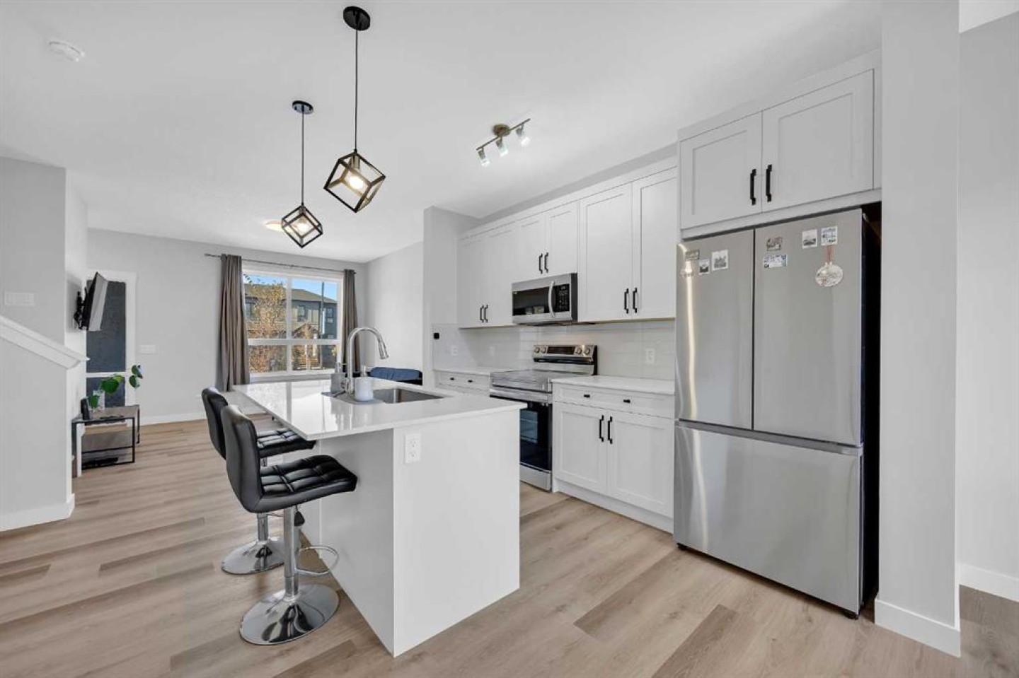 Step inside to a bright, open-concept main floor designed for modern living. The chef’s kitchen is a showpiece, complete with 41” upper cabinets, a large extended island , and upgraded stainless steel appliances including a built-in microwave, fridge, stove, and dishwasher. Whether you’re hosting dinner or enjoying a quiet night in, this space is both functional and inviting.