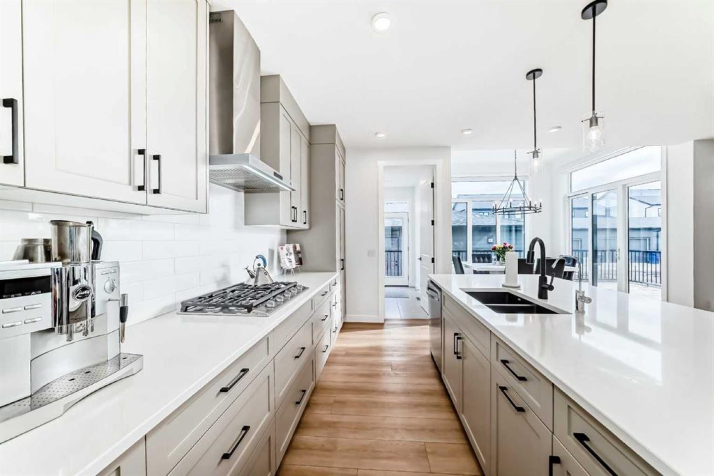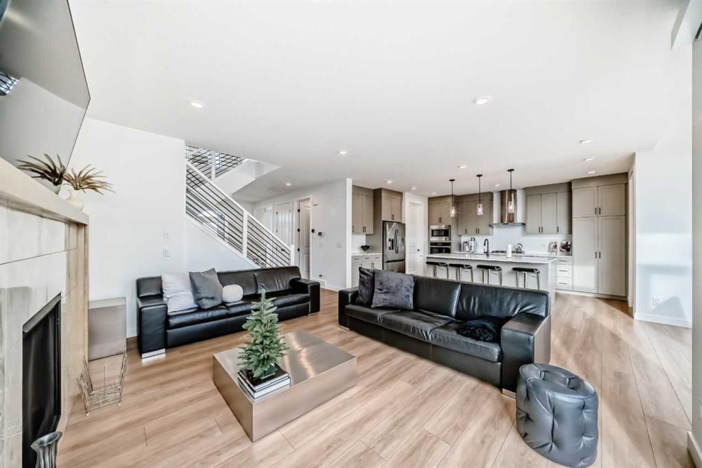 The heart of the home opens into a bright and expansive great room, anchored by a cozy gas fireplace and seamlessly connected to the kitchen and dining area—perfect for both entertaining and family life. The kitchen boasts a large island with a flush eating bar, a walk-in pantry, and modern finishes that make cooking and hosting effortless. At the rear of the home, the dining area offers backyard views and easy access to outdoor living, enhanced by the professionally finished landscaping.