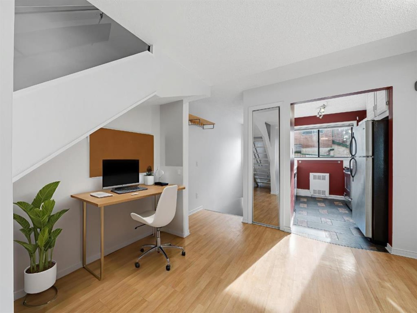 The galley-style kitchen features stainless steel appliances, generous cabinetry and excellent natural light, flowing seamlessly into a dedicated dining area and flexible den space ideal for a home office or study nook.