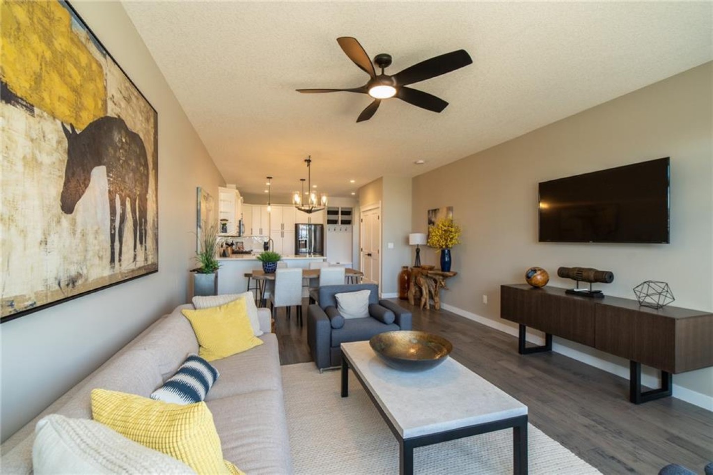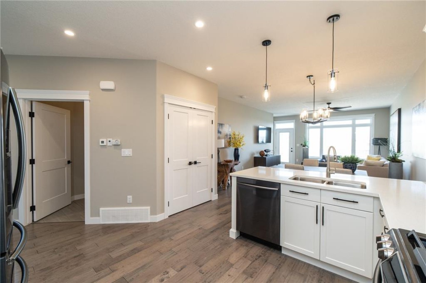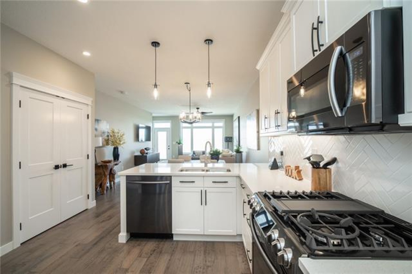 The U-shaped kitchen is the heart of the home, finished with quartz countertops, soft-close cabinetry, pot lighting, and a stainless appliance package (appliance credit included). There’s generous prep space, smart storage, and room to host family dinners or enjoy quiet evenings in. Durable, low-maintenance flooring flows seamlessly throughout — stylish yet practical.