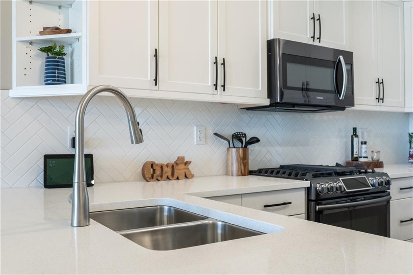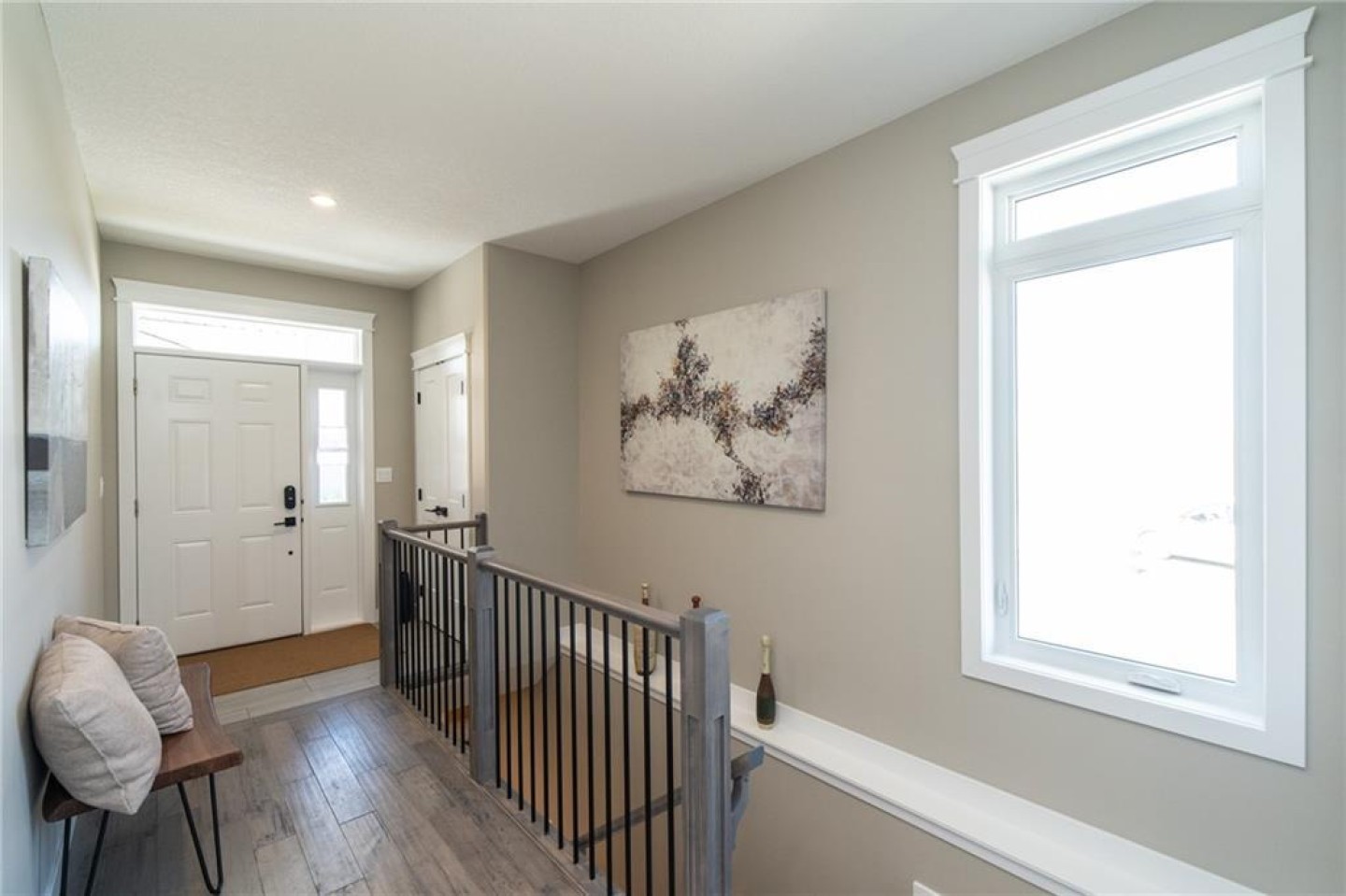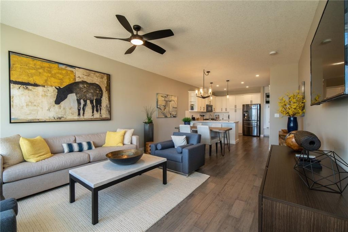 The U-shaped kitchen is the heart of the home, finished with quartz countertops, soft-close cabinetry, pot lighting, and a stainless appliance package (appliance credit included). There’s generous prep space, smart storage, and room to host family dinners or enjoy quiet evenings in. Durable, low-maintenance flooring flows seamlessly throughout — stylish yet practical.