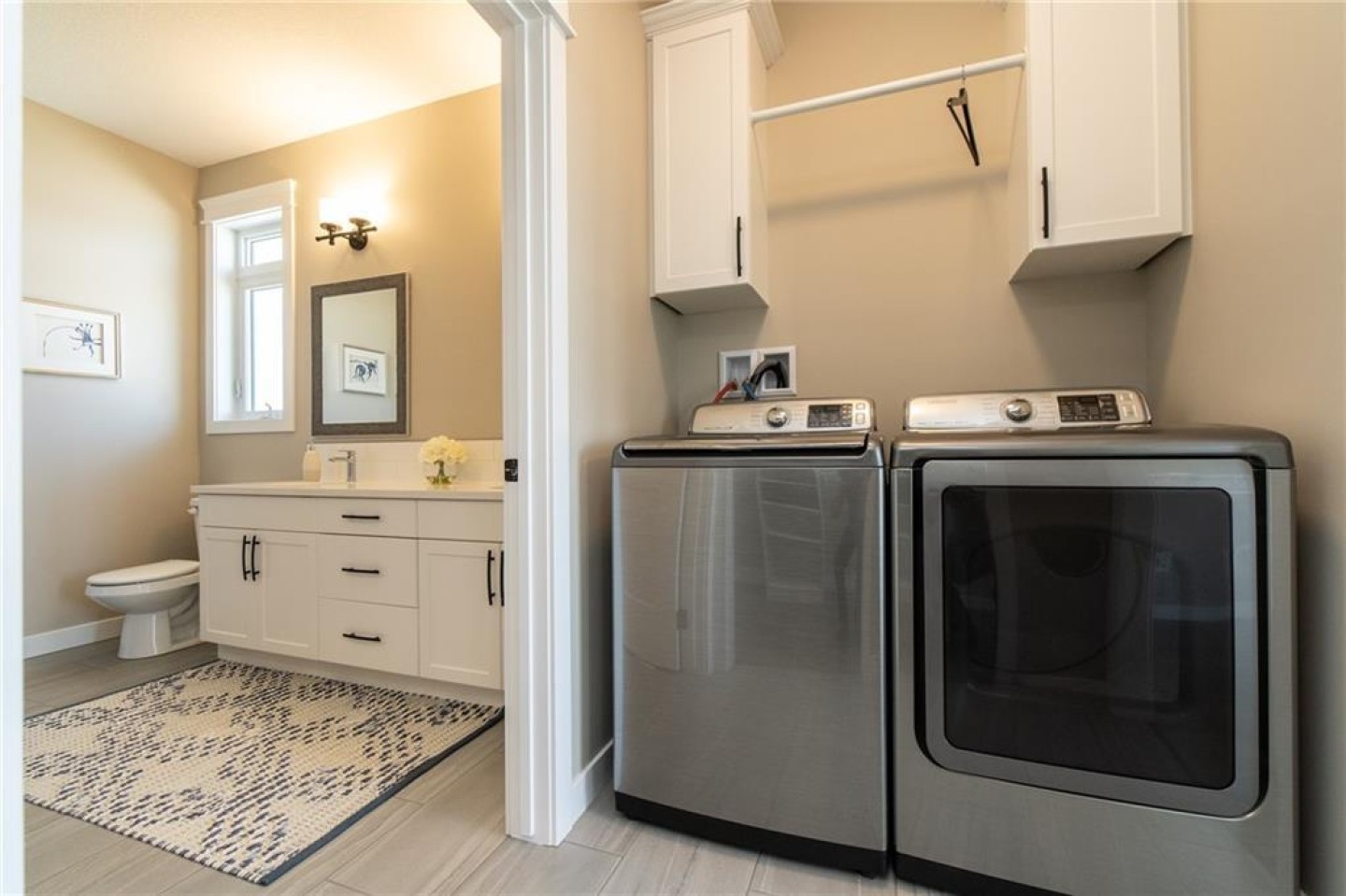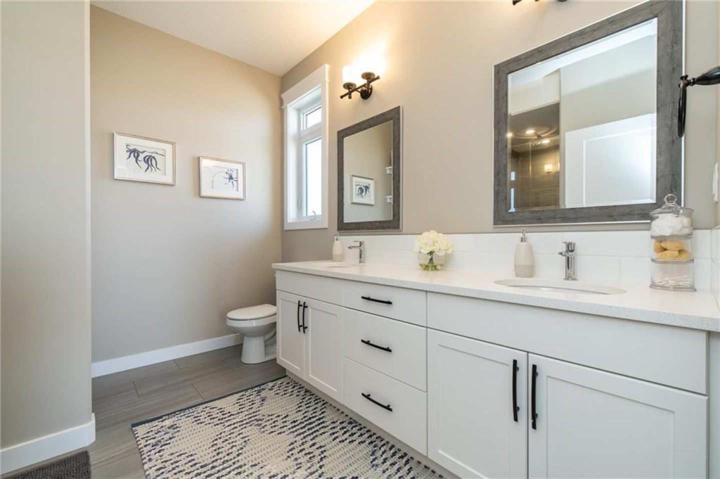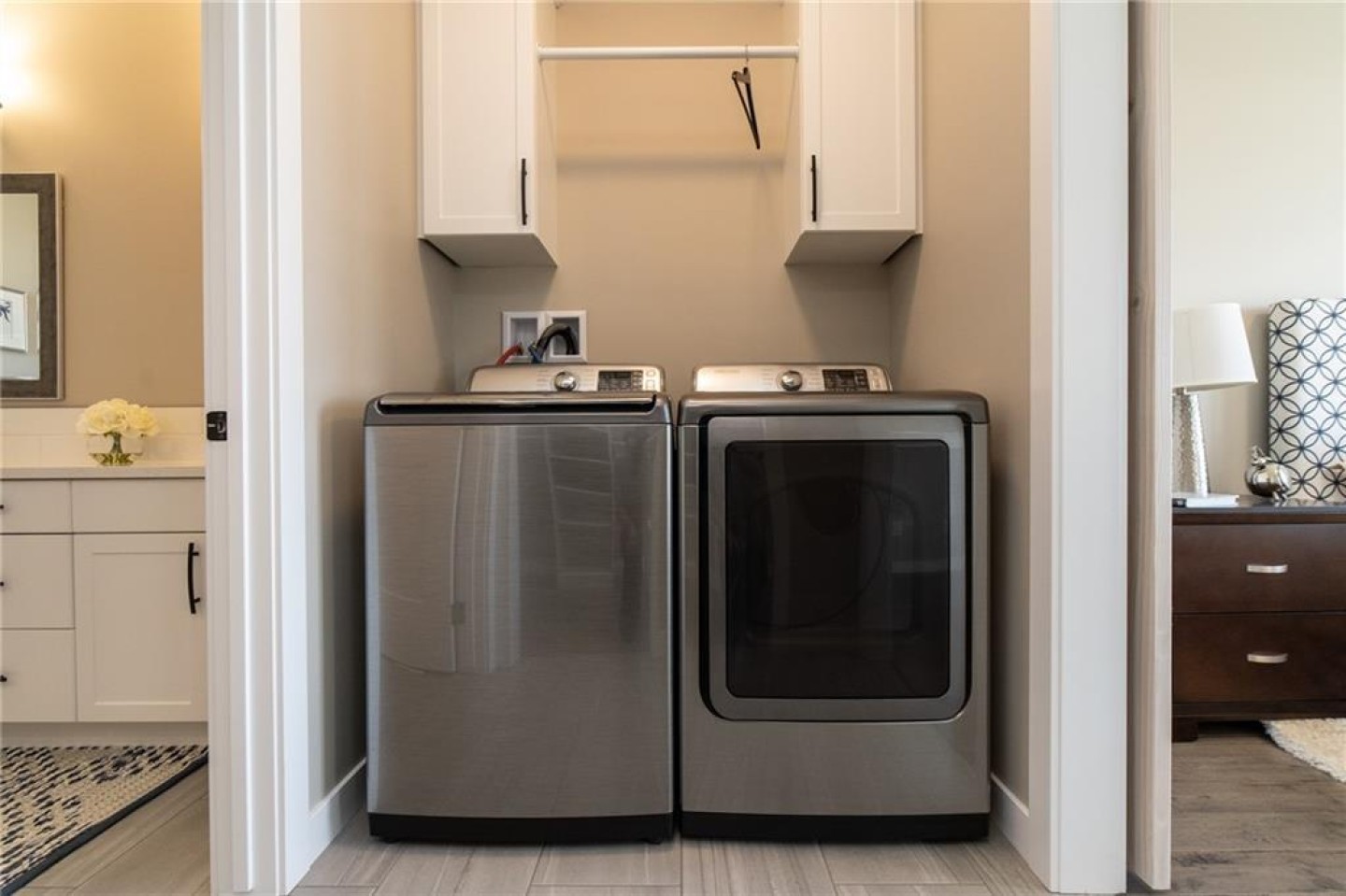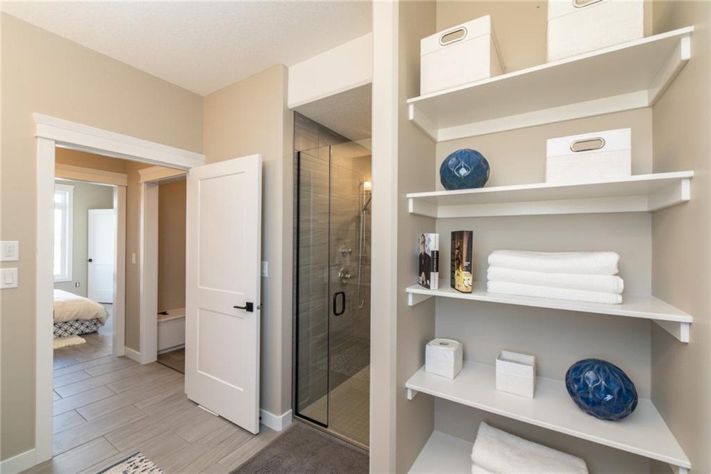 The primary suite is a true retreat. Spacious and thoughtfully designed, it offers a spa-inspired ensuite with dual sinks, quartz counters, an oversized tile and glass walk-in shower with a sitting bench, and a large walk-in closet complete with custom wood shelving. Laundry is conveniently tucked right inside the suite — because comfort should also be simple.