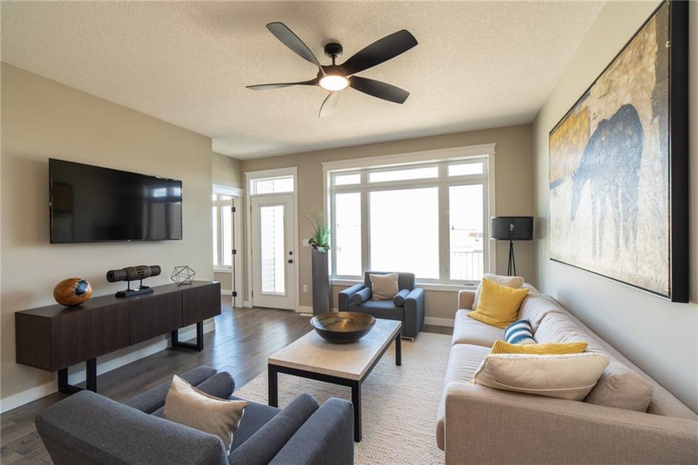 Offering just over 1,300+/- sq ft of beautifully planned open-concept living, this home was designed for ease today and flexibility for tomorrow. The first thing you’ll notice is the light. A wall of windows fills the main living space with natural sunshine, creating a warm, welcoming atmosphere that feels both refined and relaxed.