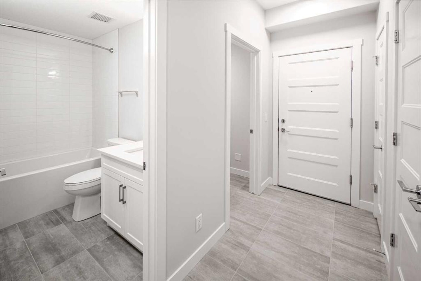 The contemporary kitchen is both stylish and functional, showcasing quartz countertops, a central island with eating bar, soft-close cabinetry, and a sleek stainless steel appliance package—perfect for everyday living and entertaining. The open-concept living and dining areas flow seamlessly onto an oversized private balcony, ideal for outdoor dining or relaxing evenings.