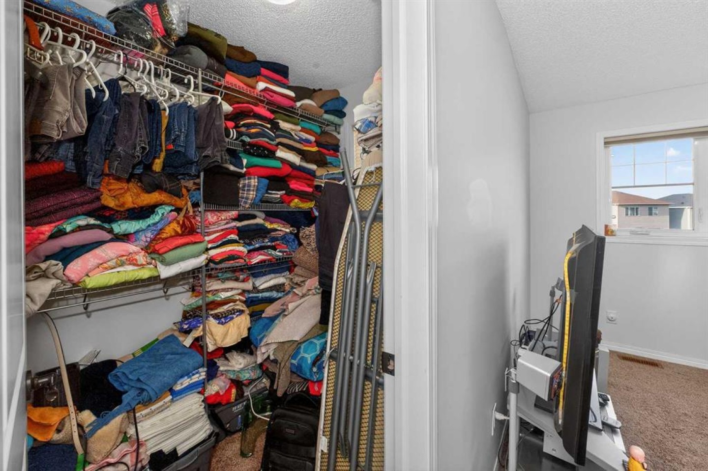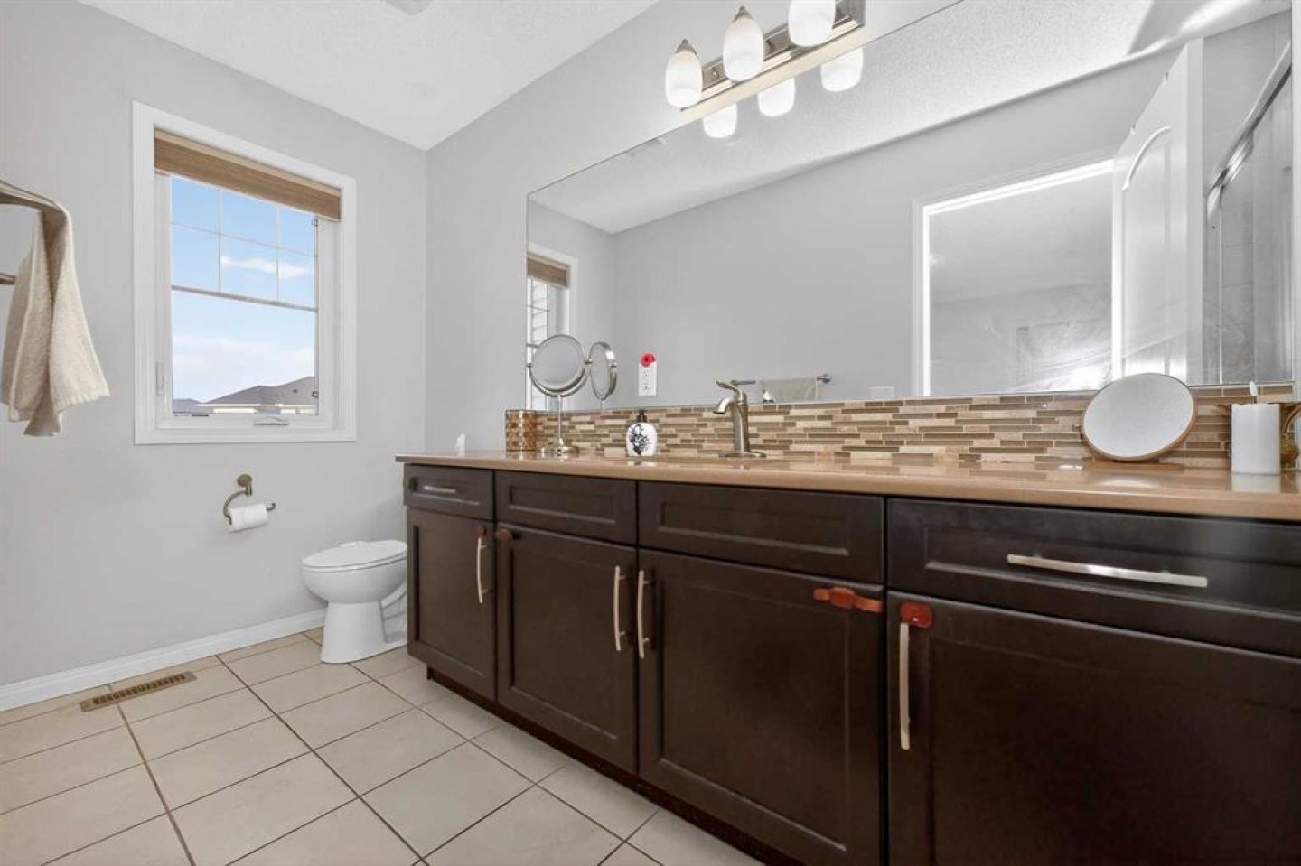 Ascend the stunning Maple staircase with sleek black spindles to the upper floor. The primary suite is a true retreat, boasting a spacious bespoke walk-in closet and a spa-like ensuite. The ensuite features an oversized fully tiled shower with a glass door, a custom double vanity with granite countertops, and tile flooring. Two additional generously sized bedrooms, each with large windows, share a well-appointed main bathroom featuring a combined shower and bathtub. The convenience of an upper-floor custom-built laundry room with shelving adds to the home's thoughtful design.