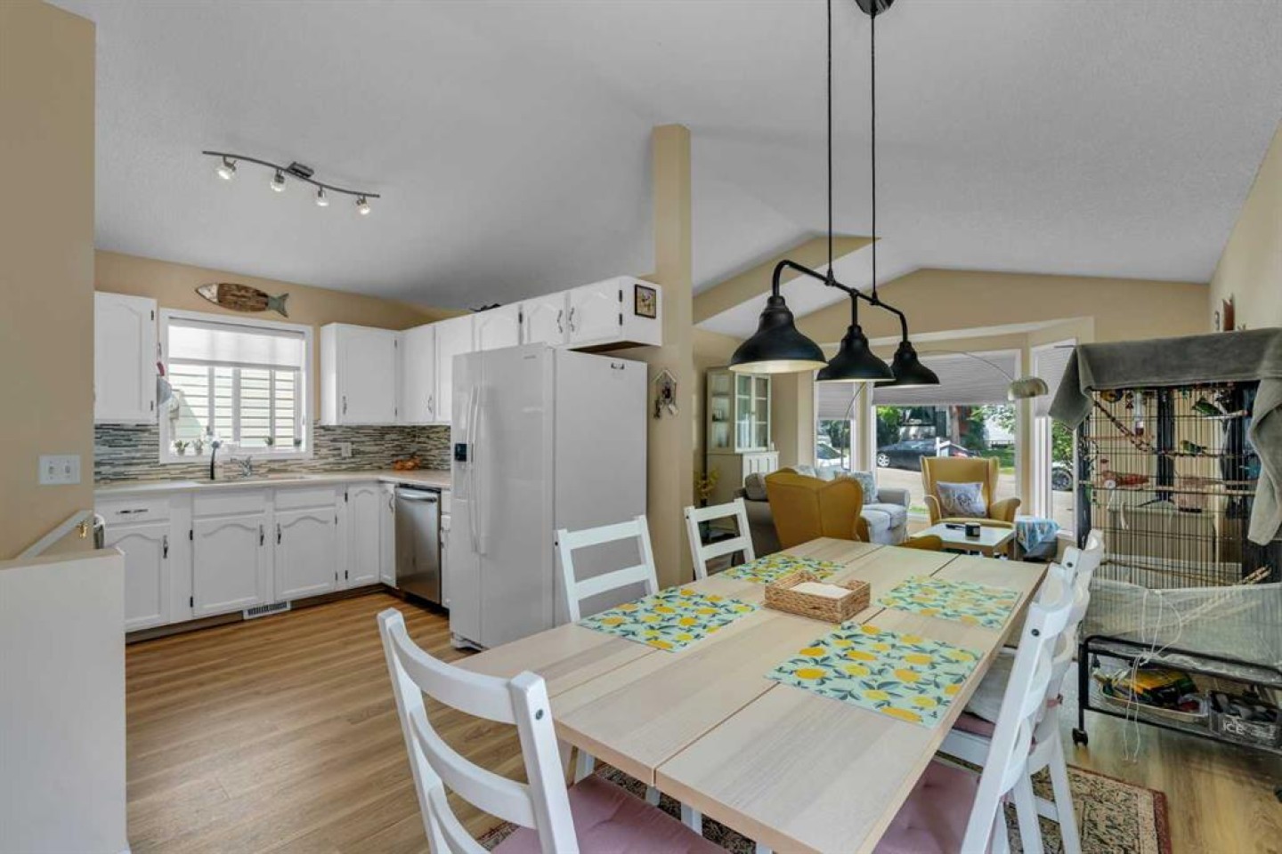 Step inside to discover a spacious open-concept living, dining, and kitchen area, all tied together with new luxury vinyl plank (LVP) flooring. The bright white kitchen boasts a glass tile backsplash, quartz countertops, and plenty of storage—ideal for both everyday use and entertaining.