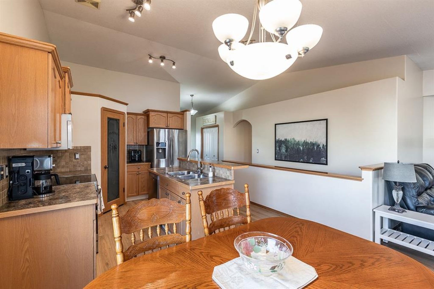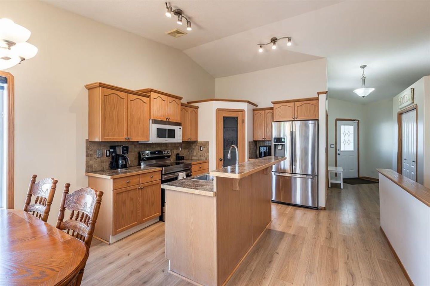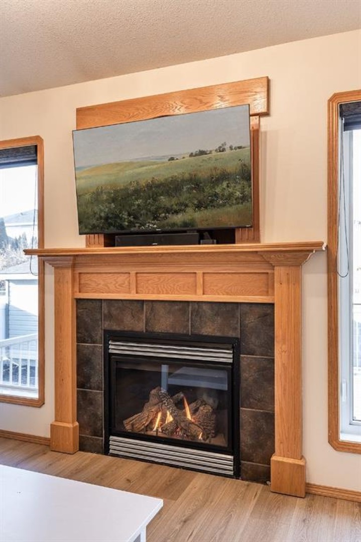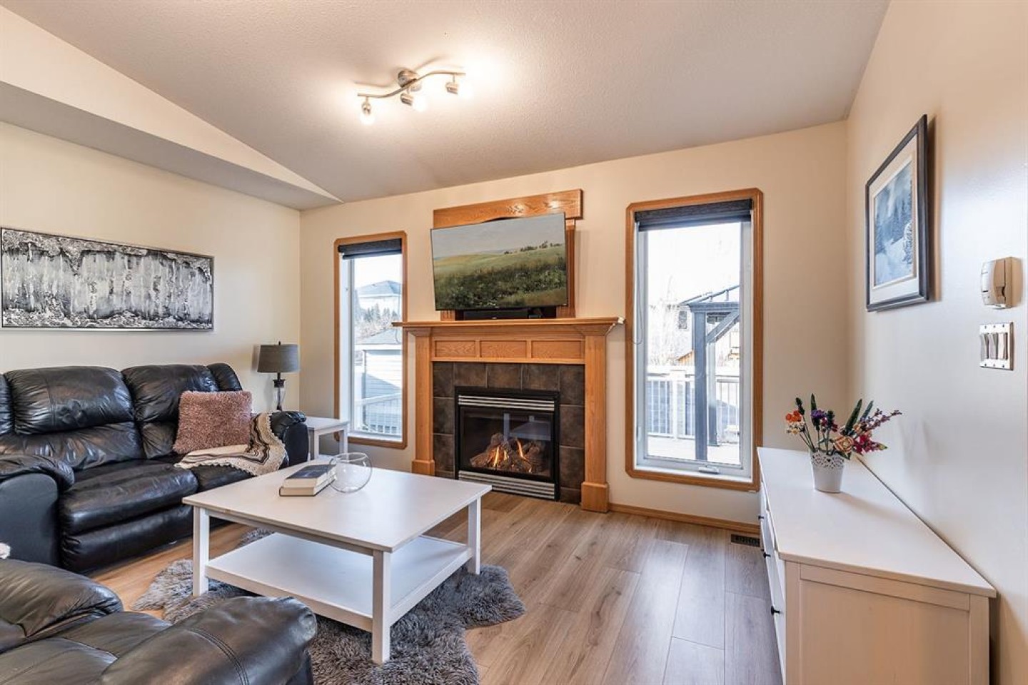 The heart of the home is the spacious kitchen, featuring stainless steel appliances, a large island with seating, ample cabinetry, and seamless flow into the dining and living areas—perfect for both everyday living and entertaining. The inviting living room is anchored by a cozy gas fireplace, creating a warm and welcoming atmosphere year-round. Just off the main living space, step onto the oversized deck, ideal for summer barbecues, outdoor dining, or relaxing evenings.