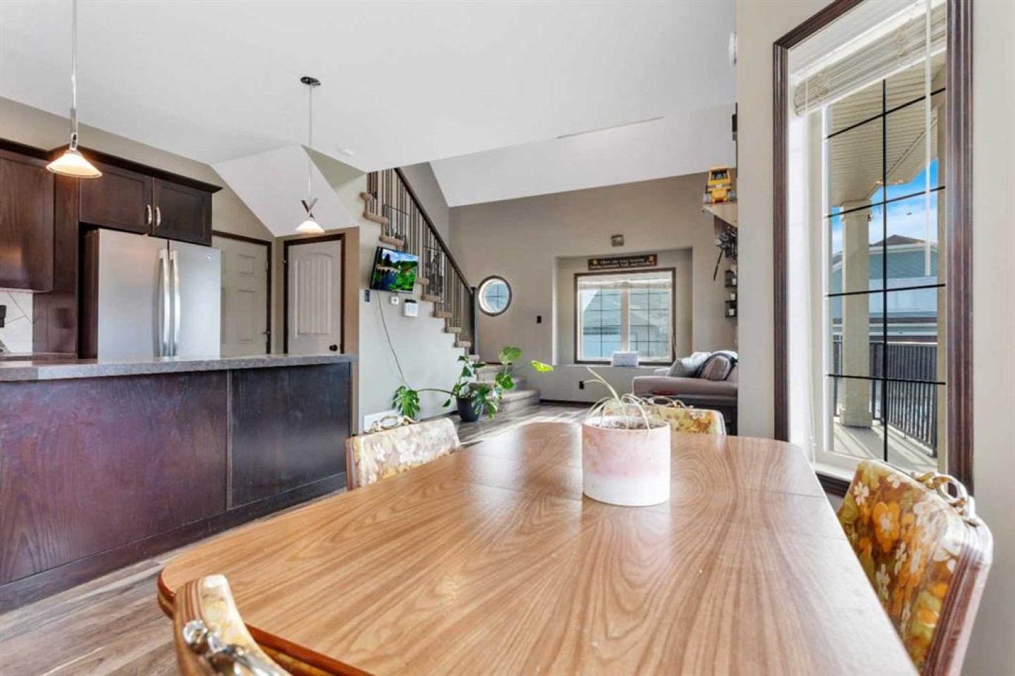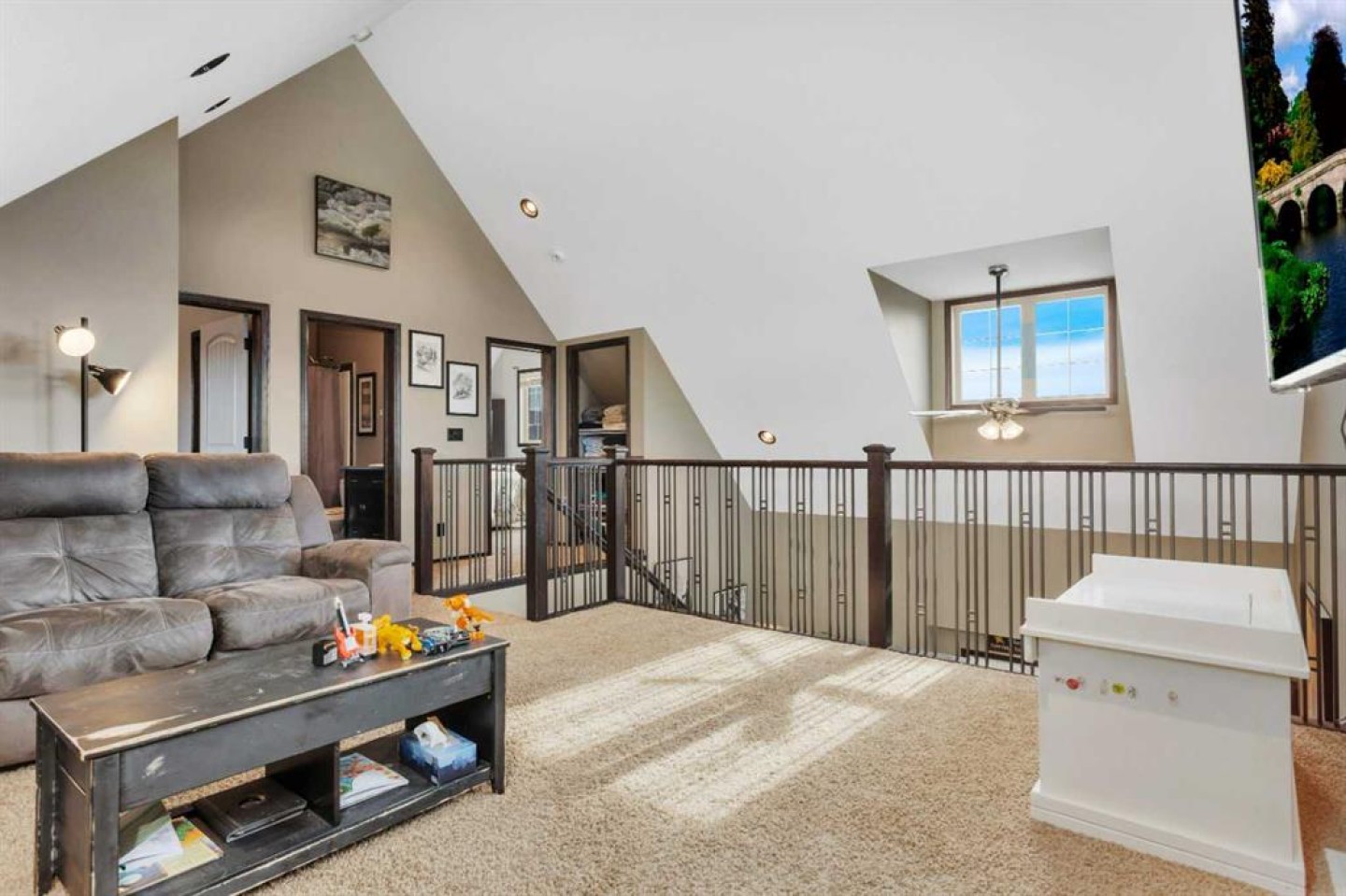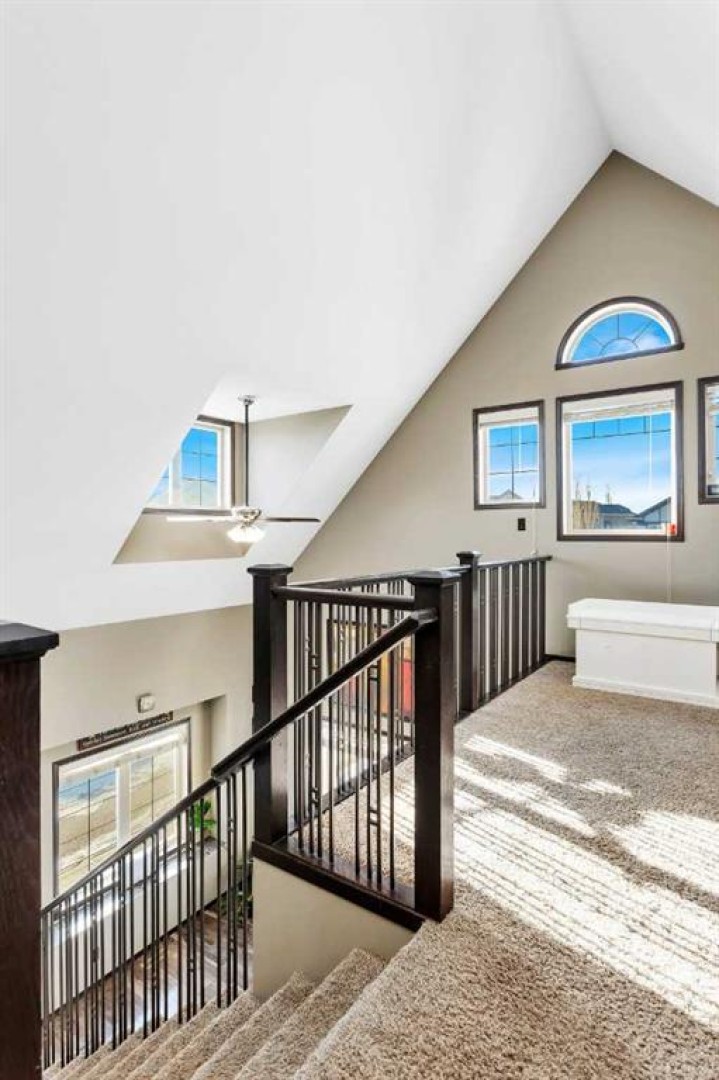 Welcome to this beautiful home with outstanding curb appeal in desirable Sunnybrook South! Stroll up the curved sidewalk to a charming front porch finished with low-maintenance composite decking. Step inside to a cozy, functional kitchen featuring an island, stainless steel appliances, and ample cabinet space. Just off the kitchen, enjoy a private side patio perfect for BBQs, relaxing, or entertaining guests. The adjoining living room offers a warm and inviting space to unwind, highlighted by an architecturally stunning vaulted ceiling and a family/entertainment loft overlooking the main living area. The spacious primary suite is fit for a king/queen, showcasing custom ceilings, large windows, a walk-in closet, and a beautifully tiled shower designed for two in the ensuite. The second generously sized bedroom includes convenient cheater access to an additional 4-piece bathroom. The fully developed basement is currently set up as a recreation room and bedroom area, complete with another 4-piece bathroom. With minor modifications, the space could easily be converted into a separate bedroom if desired. Car enthusiasts and hobbyists will love the impressive 24x28 heated garage featuring built-in shelving, hot and cold water taps perfect for a workshop or ultimate man cave. All of this sits on a generously sized lot with a paved driveway, RV parking, plenty of additional parking space, and still room to enjoy the yard. Located in a fantastic area of Red Deer, this home truly has it all!