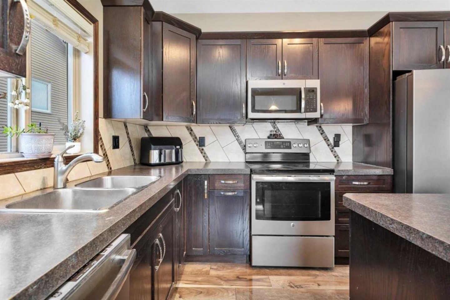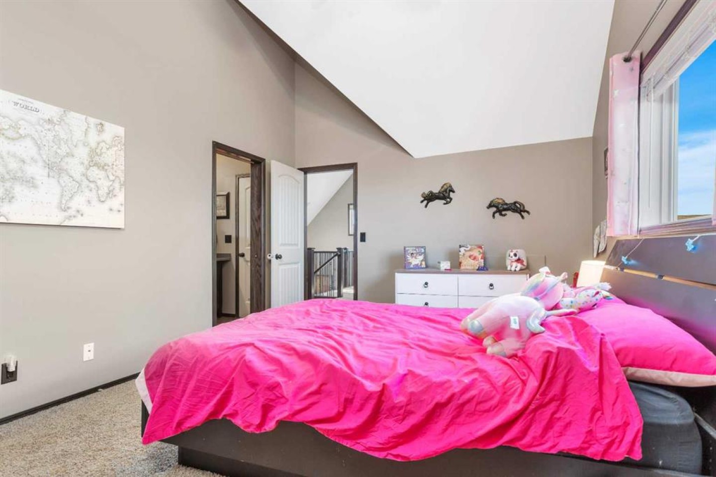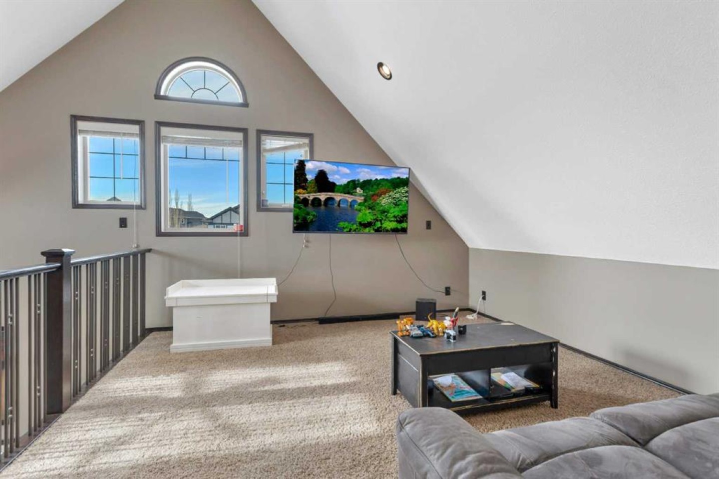 Welcome to this beautiful home with outstanding curb appeal in desirable Sunnybrook South! Stroll up the curved sidewalk to a charming front porch finished with low-maintenance composite decking. Step inside to a cozy, functional kitchen featuring an island, stainless steel appliances, and ample cabinet space. Just off the kitchen, enjoy a private side patio perfect for BBQs, relaxing, or entertaining guests. The adjoining living room offers a warm and inviting space to unwind, highlighted by an architecturally stunning vaulted ceiling and a family/entertainment loft overlooking the main living area. The spacious primary suite is fit for a king/queen, showcasing custom ceilings, large windows, a walk-in closet, and a beautifully tiled shower designed for two in the ensuite. The second generously sized bedroom includes convenient cheater access to an additional 4-piece bathroom. The fully developed basement is currently set up as a recreation room and bedroom area, complete with another 4-piece bathroom. With minor modifications, the space could easily be converted into a separate bedroom if desired. Car enthusiasts and hobbyists will love the impressive 24x28 heated garage featuring built-in shelving, hot and cold water taps perfect for a workshop or ultimate man cave. All of this sits on a generously sized lot with a paved driveway, RV parking, plenty of additional parking space, and still room to enjoy the yard. Located in a fantastic area of Red Deer, this home truly has it all!
