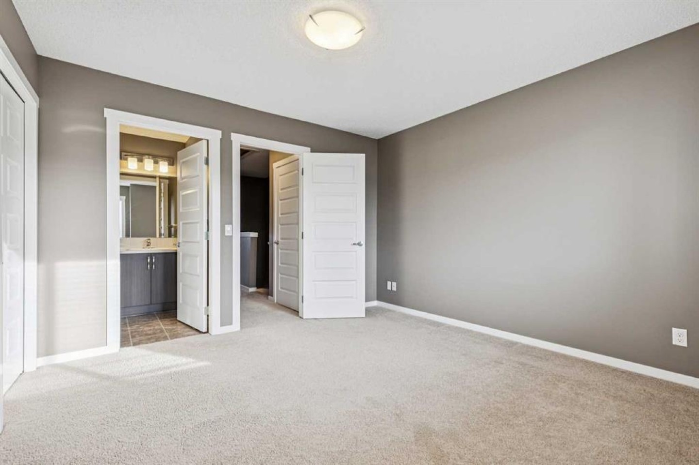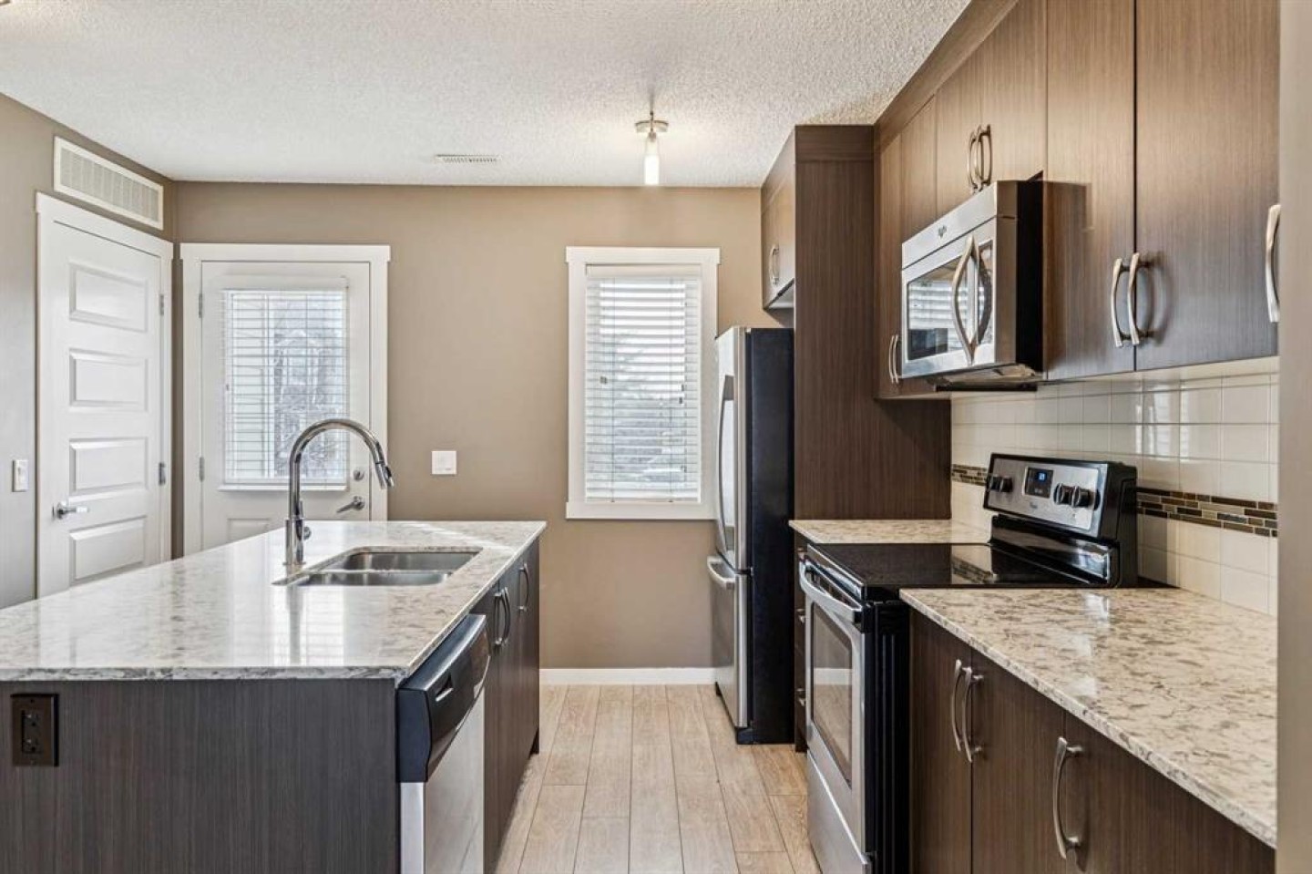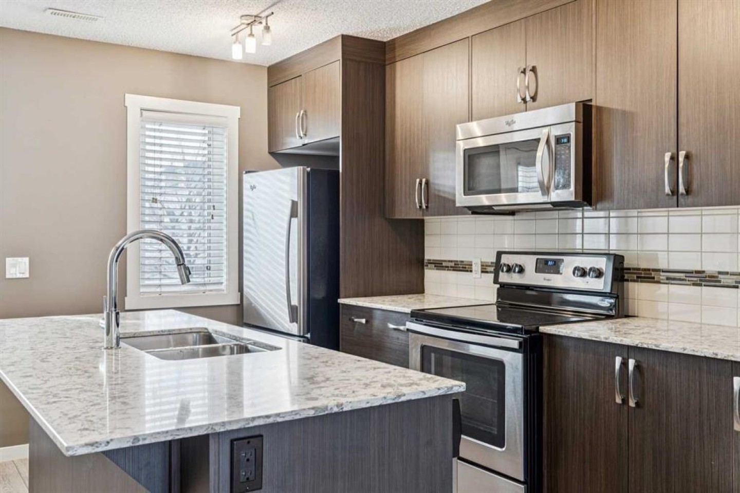 Steps from South Health Campus, minutes from Seton’s shops and restaurants, and in the heart of Auburn Bay’s lake community, your new home has it all. This 2 BED/2 BATH 2-storey is perfectly designed for modern living, with an open concept main floor that flows effortlessly from the spacious family room into the dining area and modern kitchen, complete with quartz countertops, stainless steel appliances, and a central island perfect for hosting or everyday prep. Step outside to your own private fenced yard and patio, with the added convenience of your parking stall right out front. Laminate flooring runs throughout the main level, along with a tucked-away 2-piece powder room. Upstairs, two generously sized bedrooms each feature a private ensuite, ideal for guests, roommates, or a home office setup. A pull-down attic stairway offers bonus storage rarely found in townhomes. Located in a well-managed complex with LOW CONDO FEES, this is an incredible opportunity to own in one of Calgary’s most desirable lake communities, perfect for those who work at South Health Campus or love the energy of Auburn Bay and Seton.