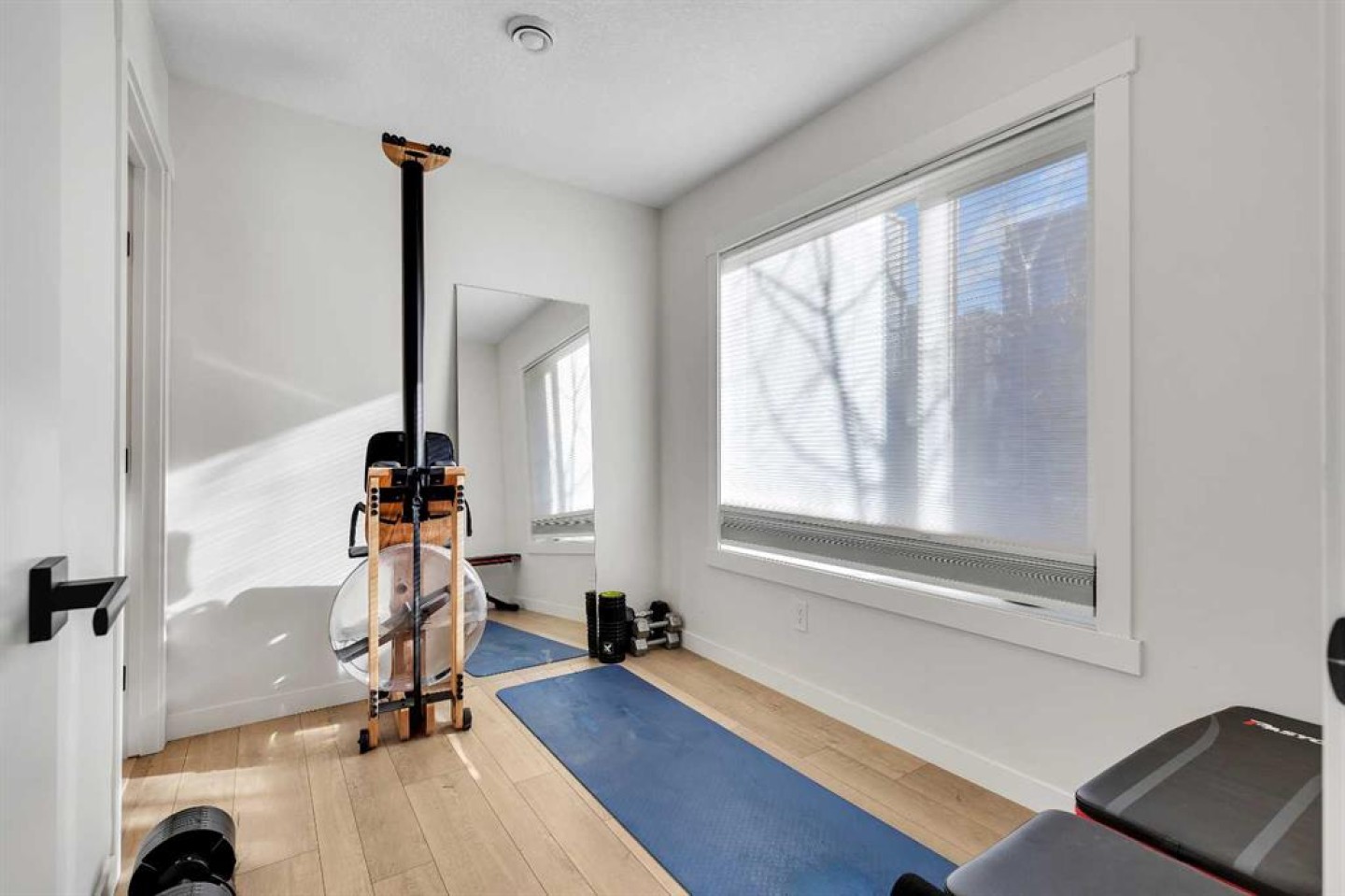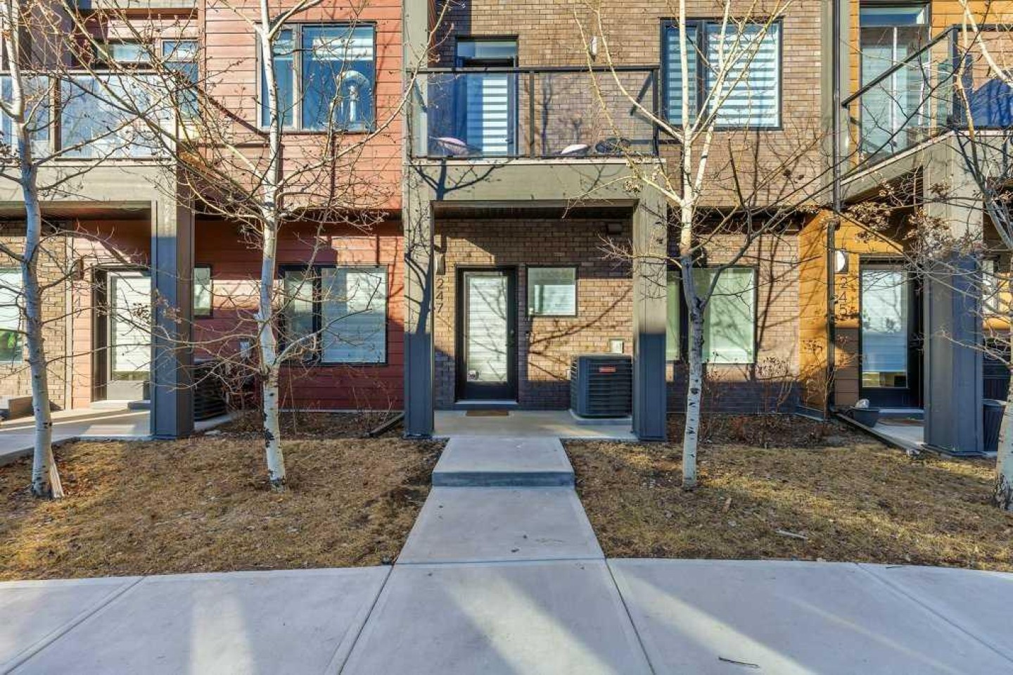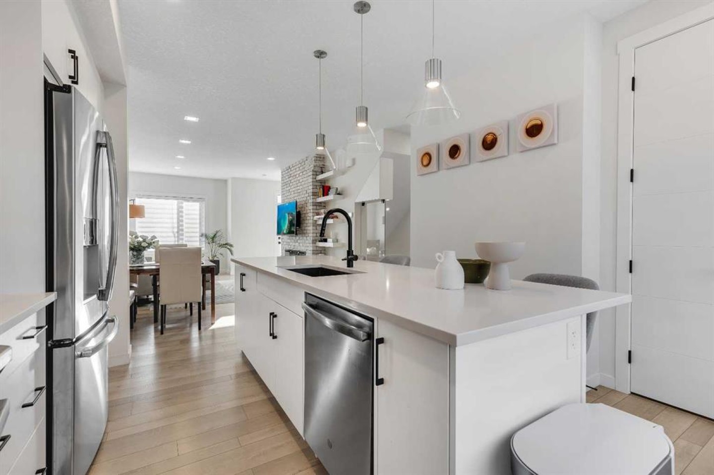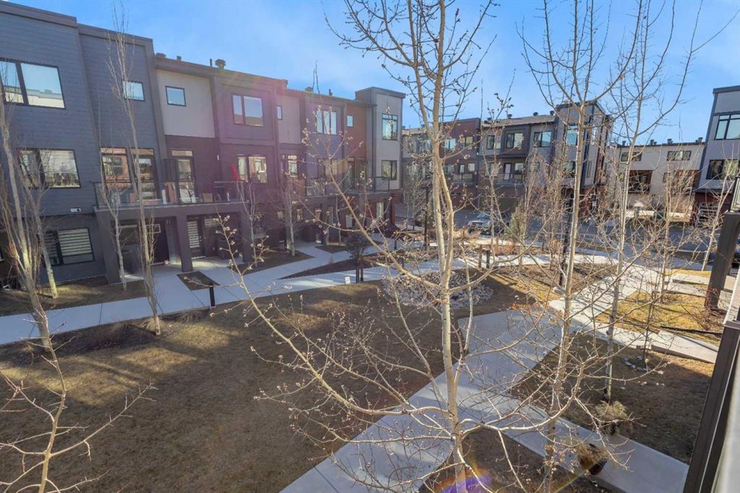 Welcome to Artis in Greenwich — a luxury townhome collection located in one of Calgary’s newest master-planned community. Greenwich spans 59 acres in NW Calgary and blends brownstone architecture with boutique urban living. Home to the Calgary Farmers’ Market West, the community offers an impressive selection of cafés, restaurants, walking paths, parks, and stunning views of WinSport and the Rocky Mountains. This townhome features 1,562 sq ft of thoughtfully designed living space, including a double-primary bedroom layout, a ground-level flex room with a full bathroom, in-floor heating, and a double attached garage. The ground level offers 268 sq ft with a spacious foyer, a versatile flex room currently used as a gym, a 3-piece bathroom, and direct access to the garage. The main level provides 637 sq ft of open-concept living with a bright kitchen, dining area, and living room. The upgraded kitchen package includes sleek white cabinetry with black hardware, stainless steel appliances, gas stove and a designer hood fan. The striking black herringbone-patterned tile backsplash frames the stove area beautifully, creating a focal point balancing the lighter elements of the kitchen. A large island with undermount sink and sleek chrome faucet creates a comfortable seating area to enjoy quick meals or is the perfect gathering spot. From kitchen, step onto the deck equipped with a gas BBQ line. The laundry room is just off the kitchen. The living room is warm and inviting with south-facing windows, an electric fireplace with brick surround, and access to a second balcony which is south facing and overlooks the central courtyard. Upstairs, you’ll find and additional 657 sq ft with two spacious primary bedrooms, each with its own ensuite — one a 5-piece and the other a 4-piece. Additional upgrades include glass panels on stairwells, undermount sinks with full-height tile and mirrors in the bathrooms, upgraded lighting and window coverings, and air conditioning. The double attached garage includes 2 wall heaters and opens up to a off-street double parking pad. The exterior showcases timeless brownstone styling with James Hardie siding, full brick accents, and stucco finishes, offering durability and low-maintenance living. Greenwich’s location is exceptional — just 20 minutes to downtown, quick access north or south, and under an hour to Canmore and Banff. With parks, playgrounds, and the Farmers’ Market within walking distance, this is urban-inspired living at its best. The sellers have been fortunate to have an excellent tenant in place, who is willing to remain should the buyer wish to purchase the property as an investment.
